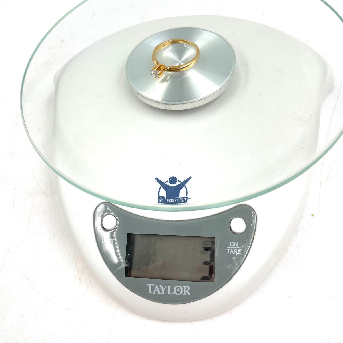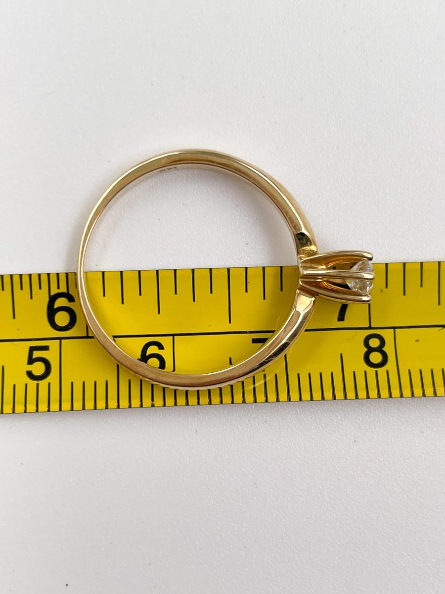 In good condition, marked 14K. Not sure if the stone is Diamond - untested. Size not know but ring measures 3/4” in diameter. Weighs 3 grams.