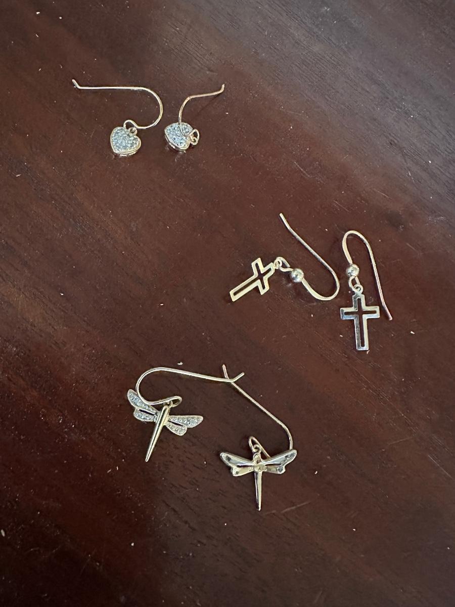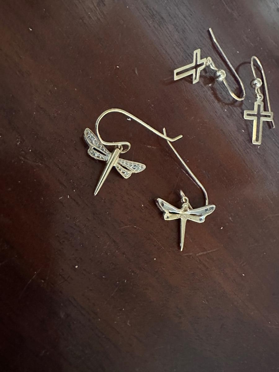 14K GOLD DRAGON FLY, CROSS, HEART EARRINGS AS PICTURED