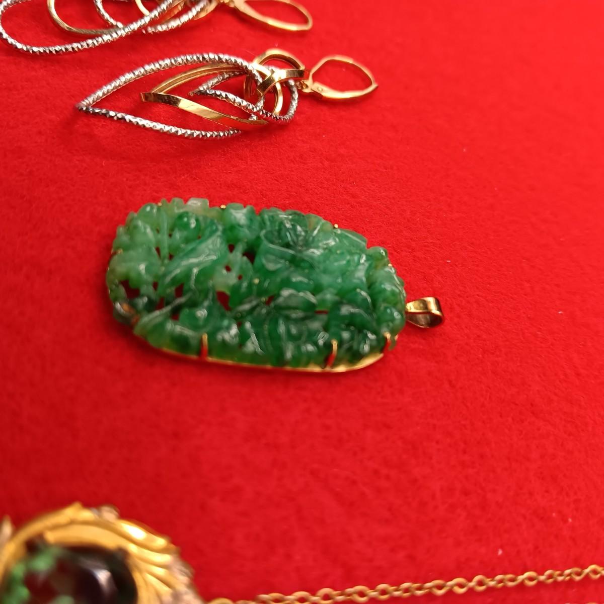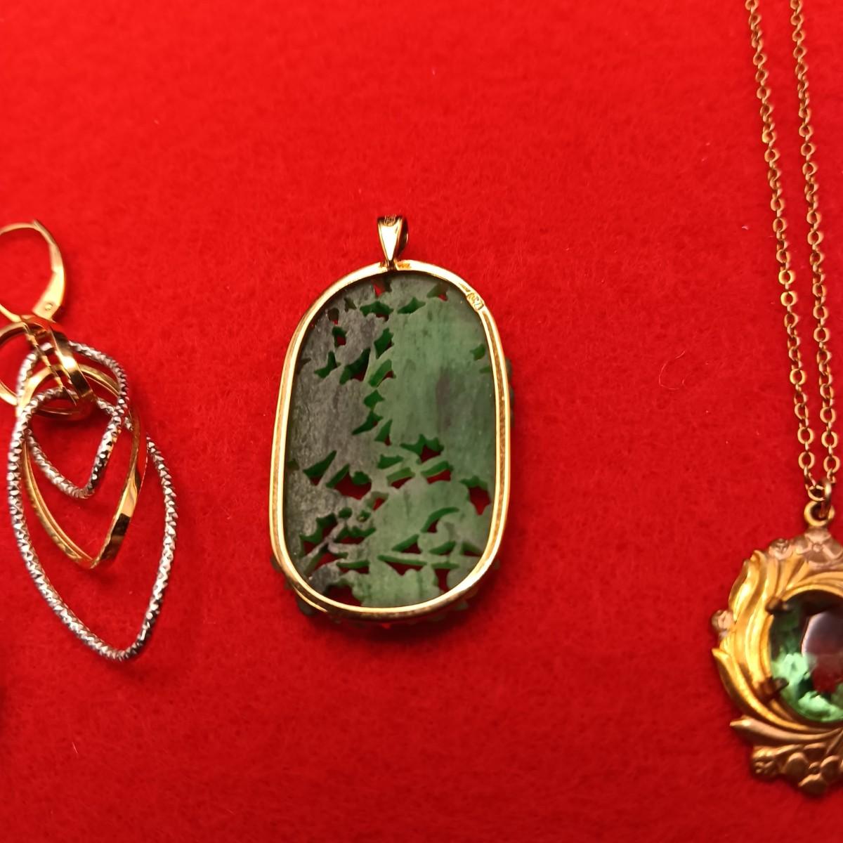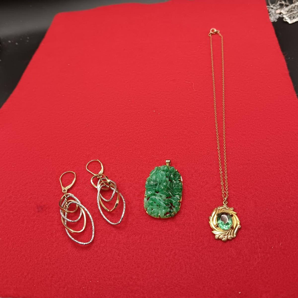14K GOLD EARRINGS, 18K AND JADE PENDANT AND A COSTUME NECKLACE (GOLD 2.36g)