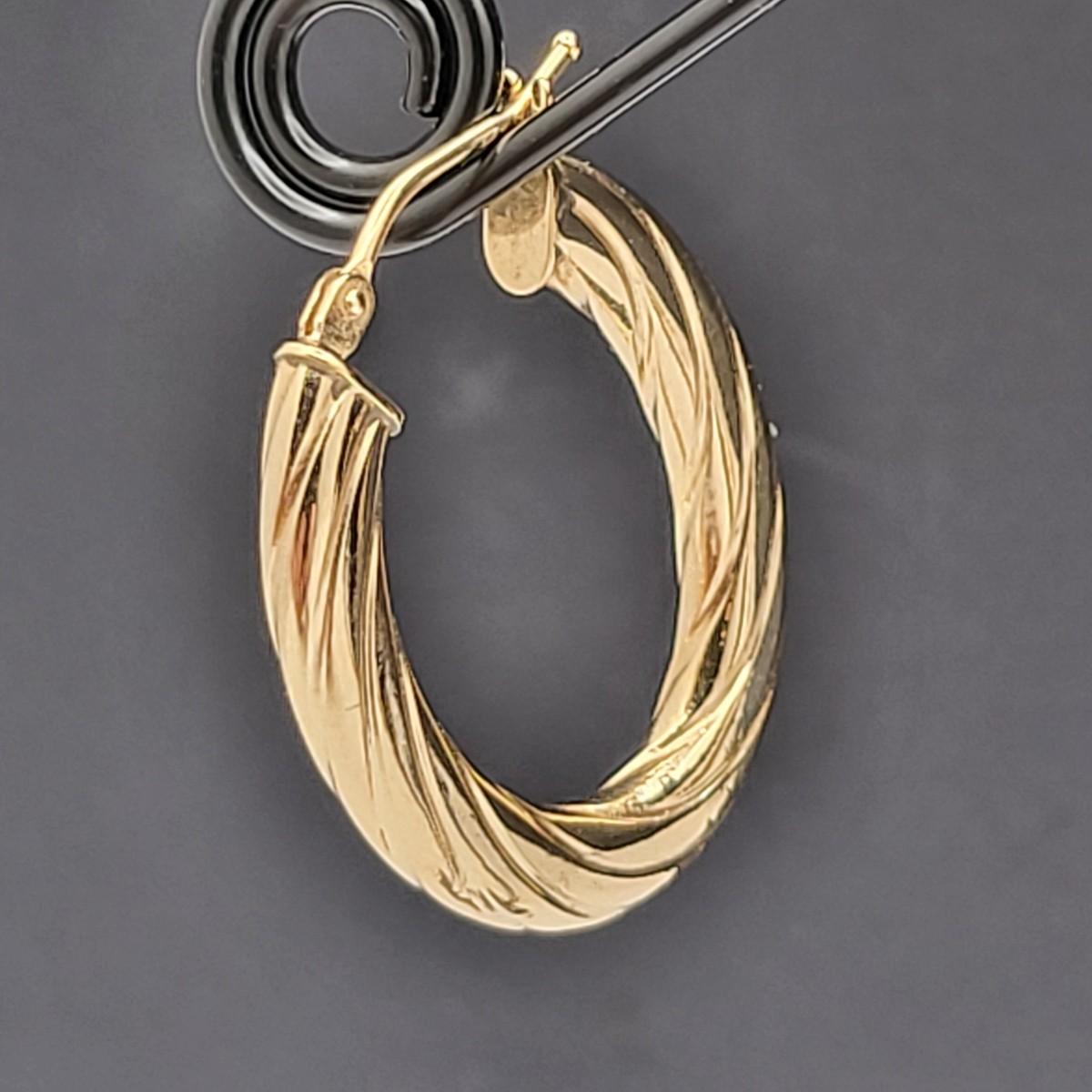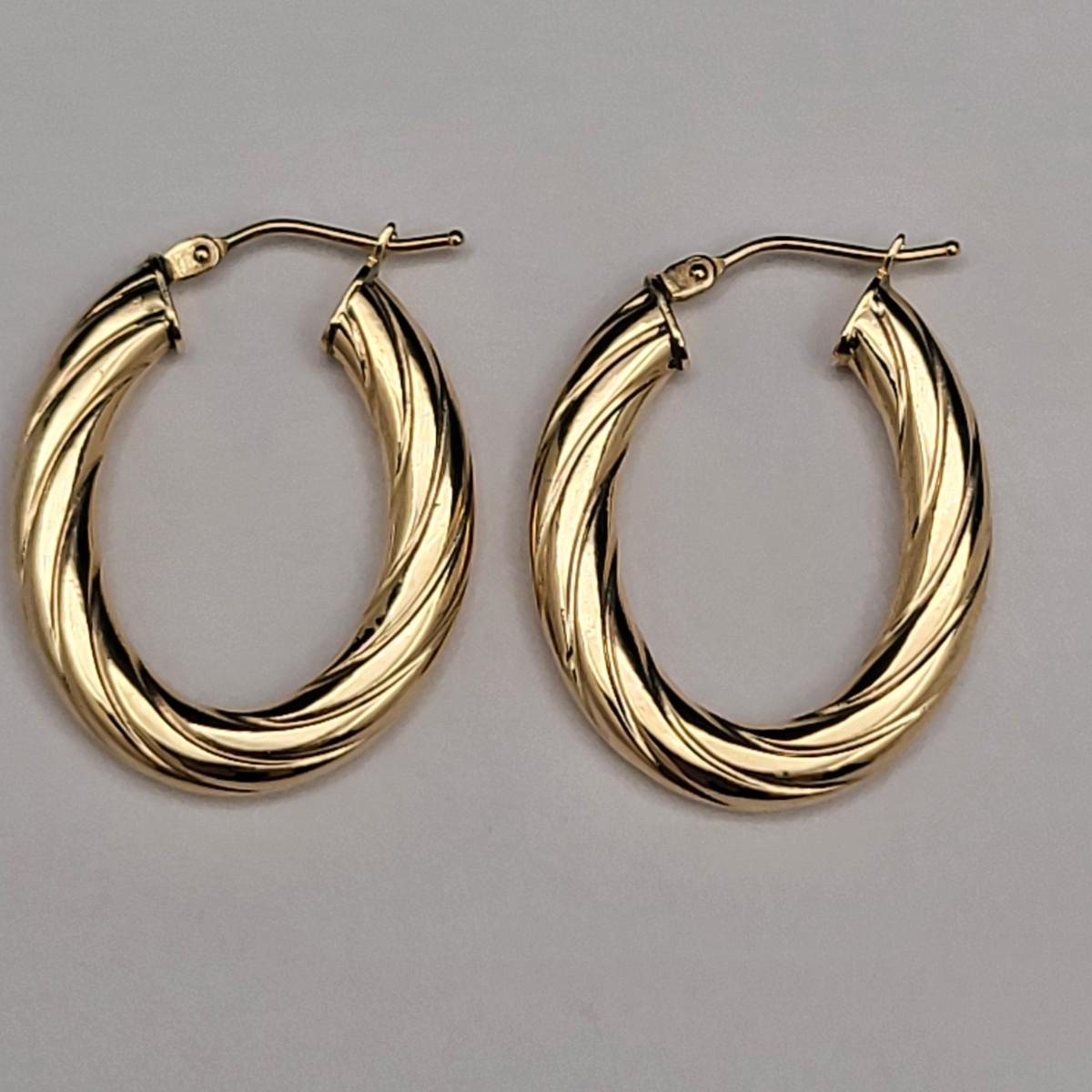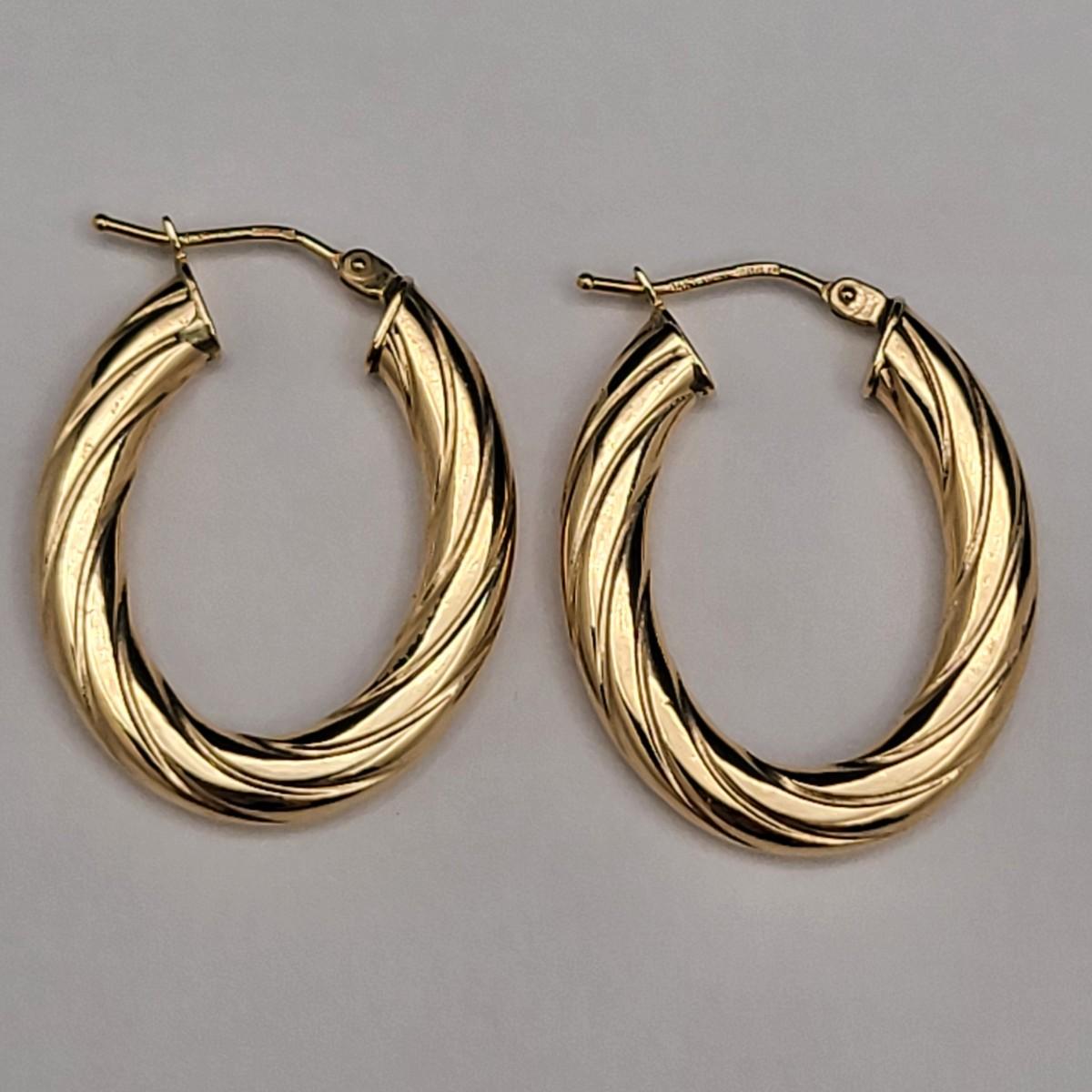 Just over 1" long, twist oval hoop pierced earrings that are stamped 14k Italy (with a star symbol 2549 AR). They are lightweight/hollow, weighing 1.4 grams. Would make a nice gift.