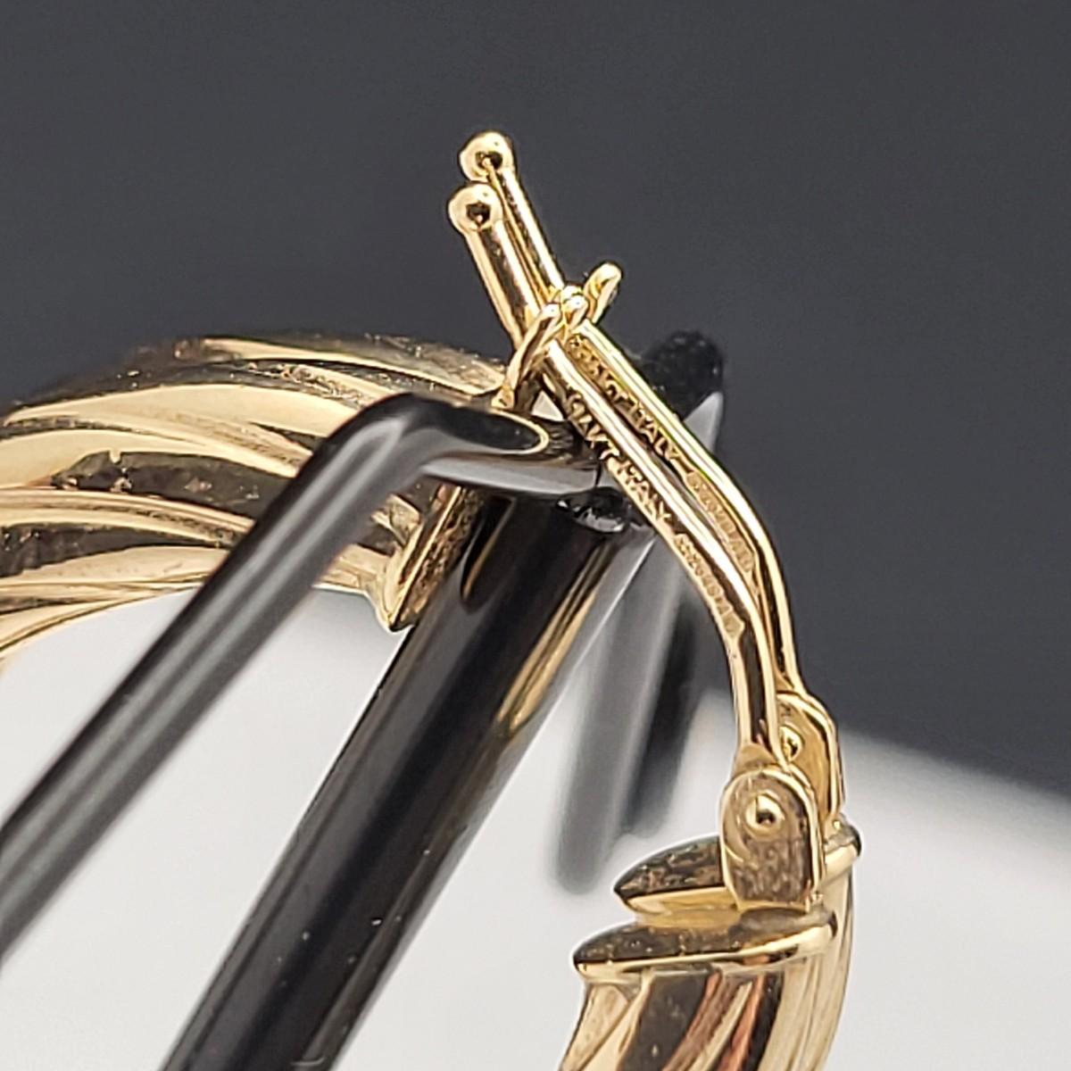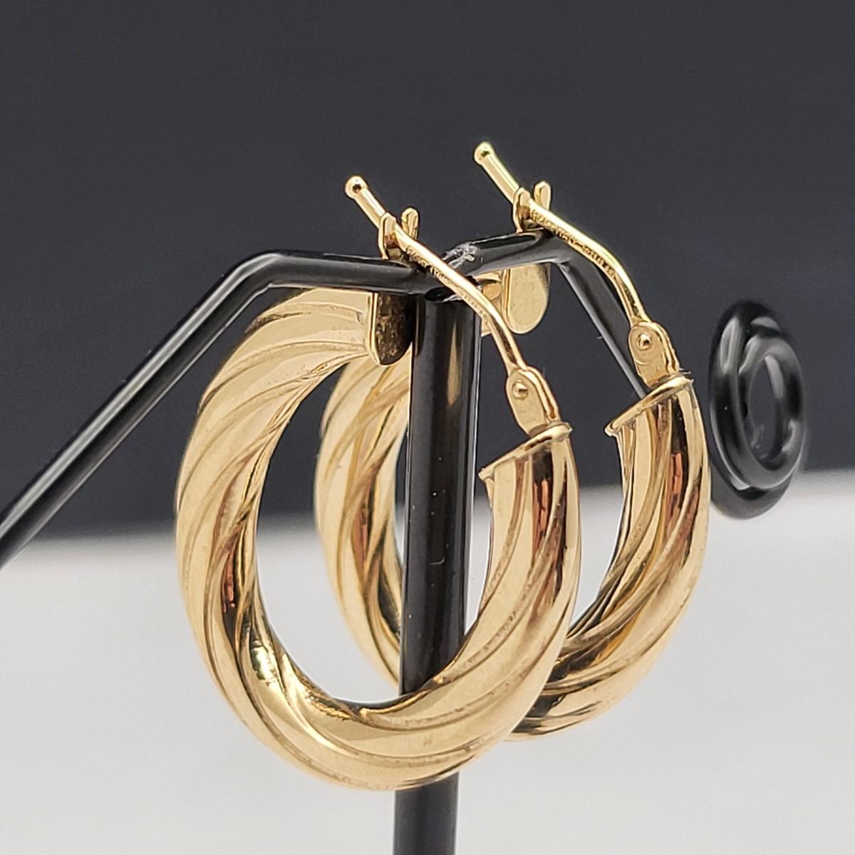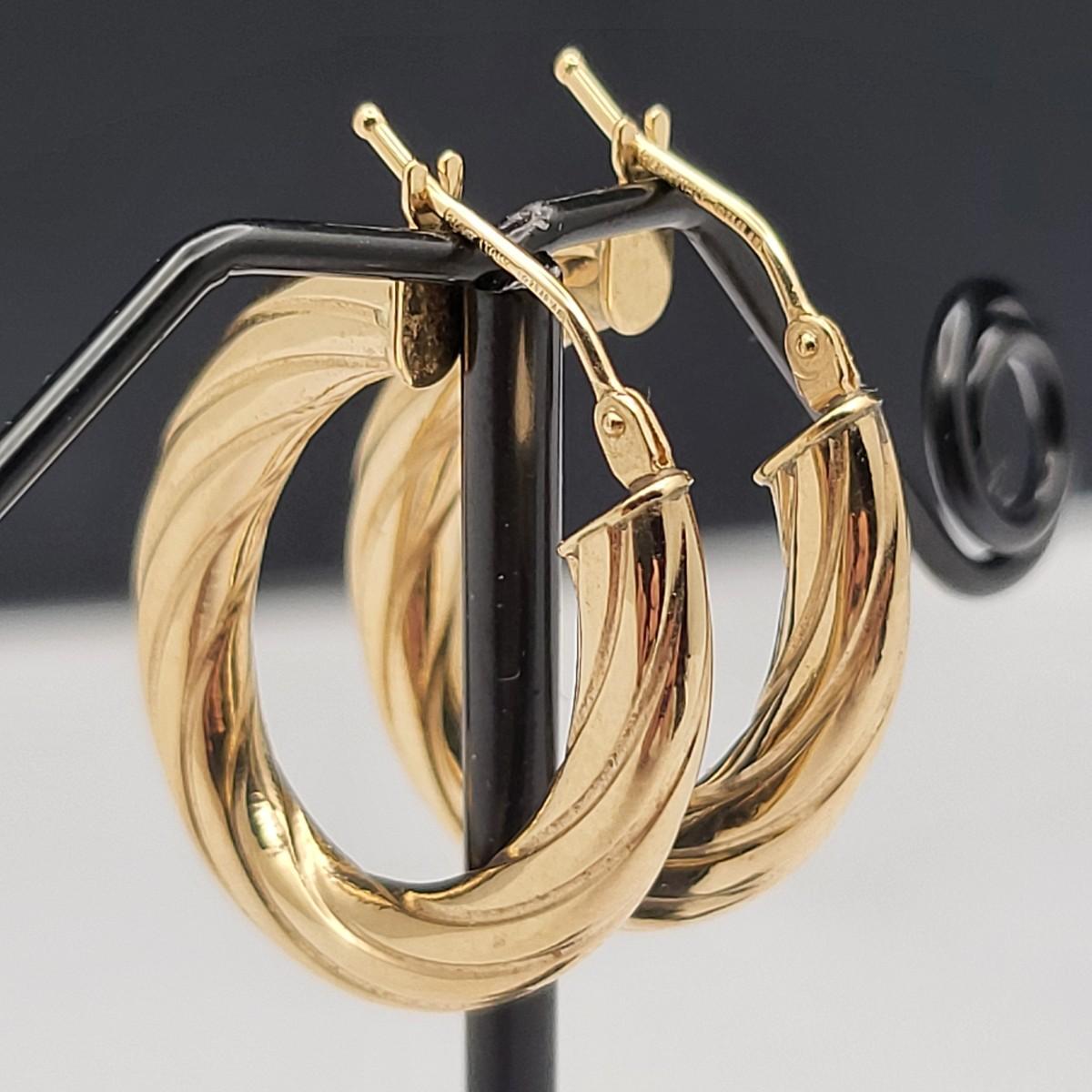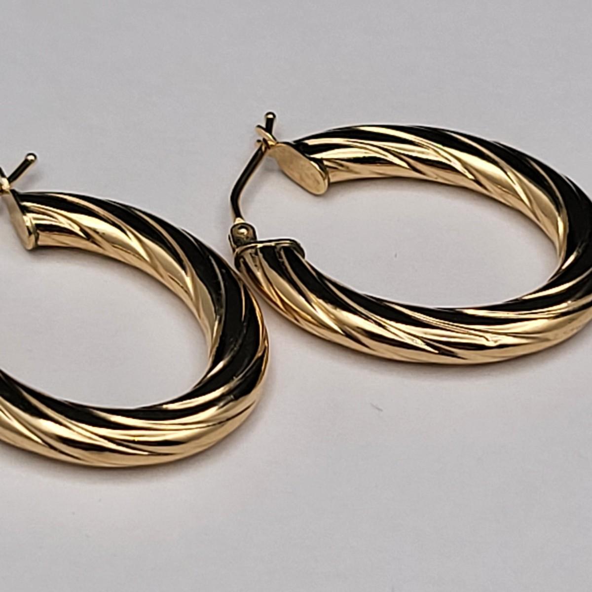 Just over 1" long, twist oval hoop pierced earrings that are stamped 14k Italy (with a star symbol 2549 AR). They are lightweight/hollow, weighing 1.4 grams. Would make a nice gift.