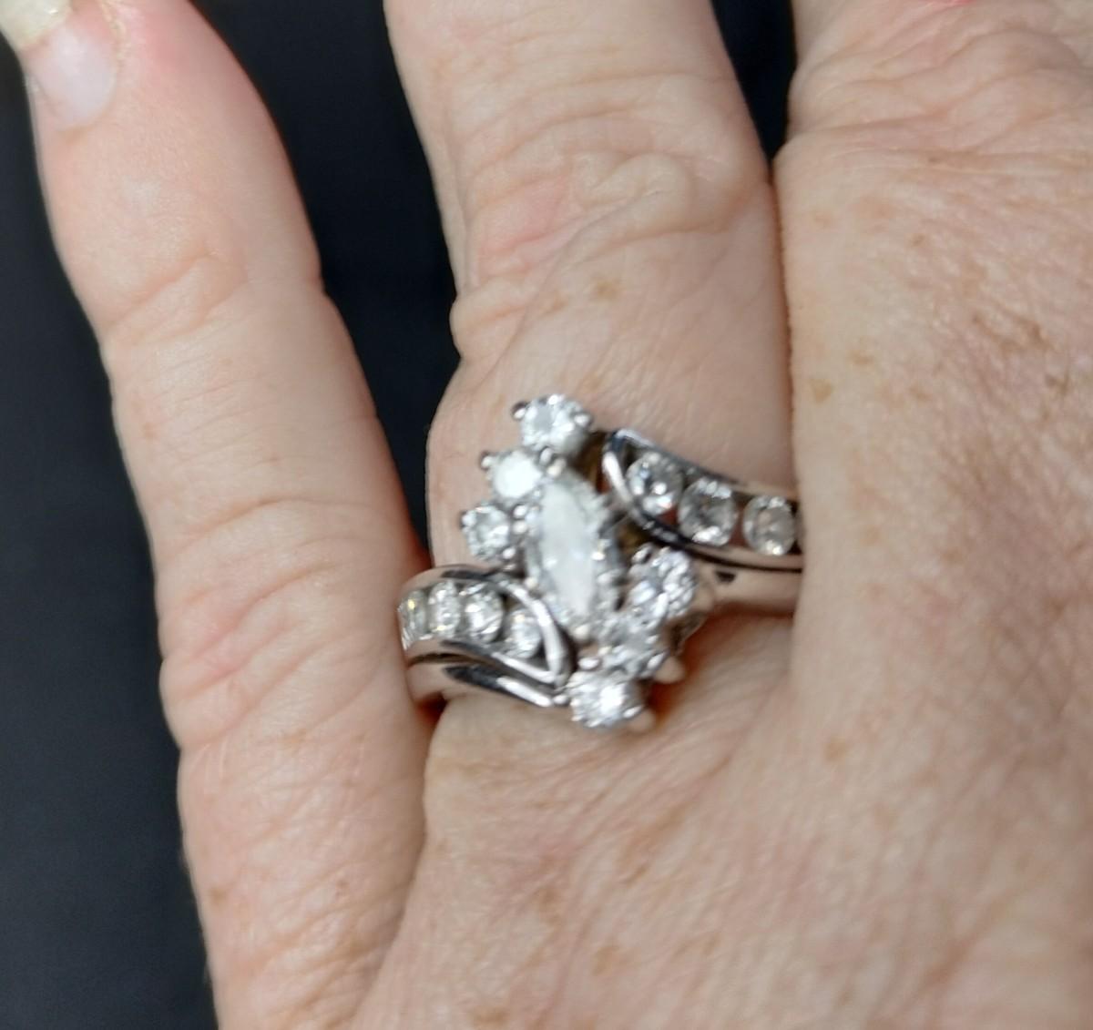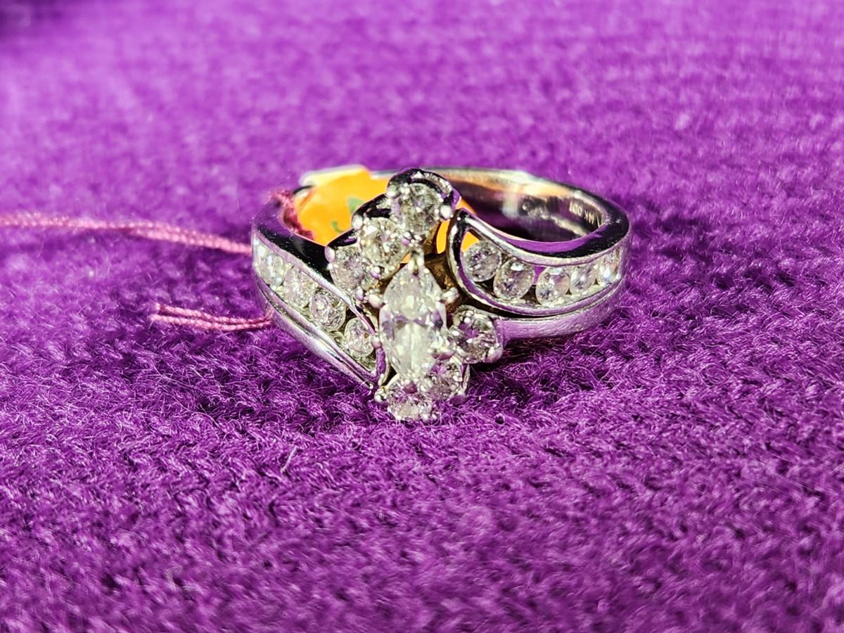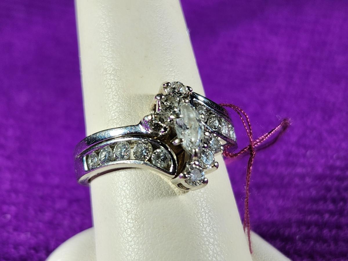 This auction lot is for a 14K Gold Marquise & 16 Small Diamonds Ring. The ring weighs about .0263ozt with diamonds. The ring is a size 10 and is marked 14K. The photos do not show the fire and glitz of the actual ring. Quite pretty.