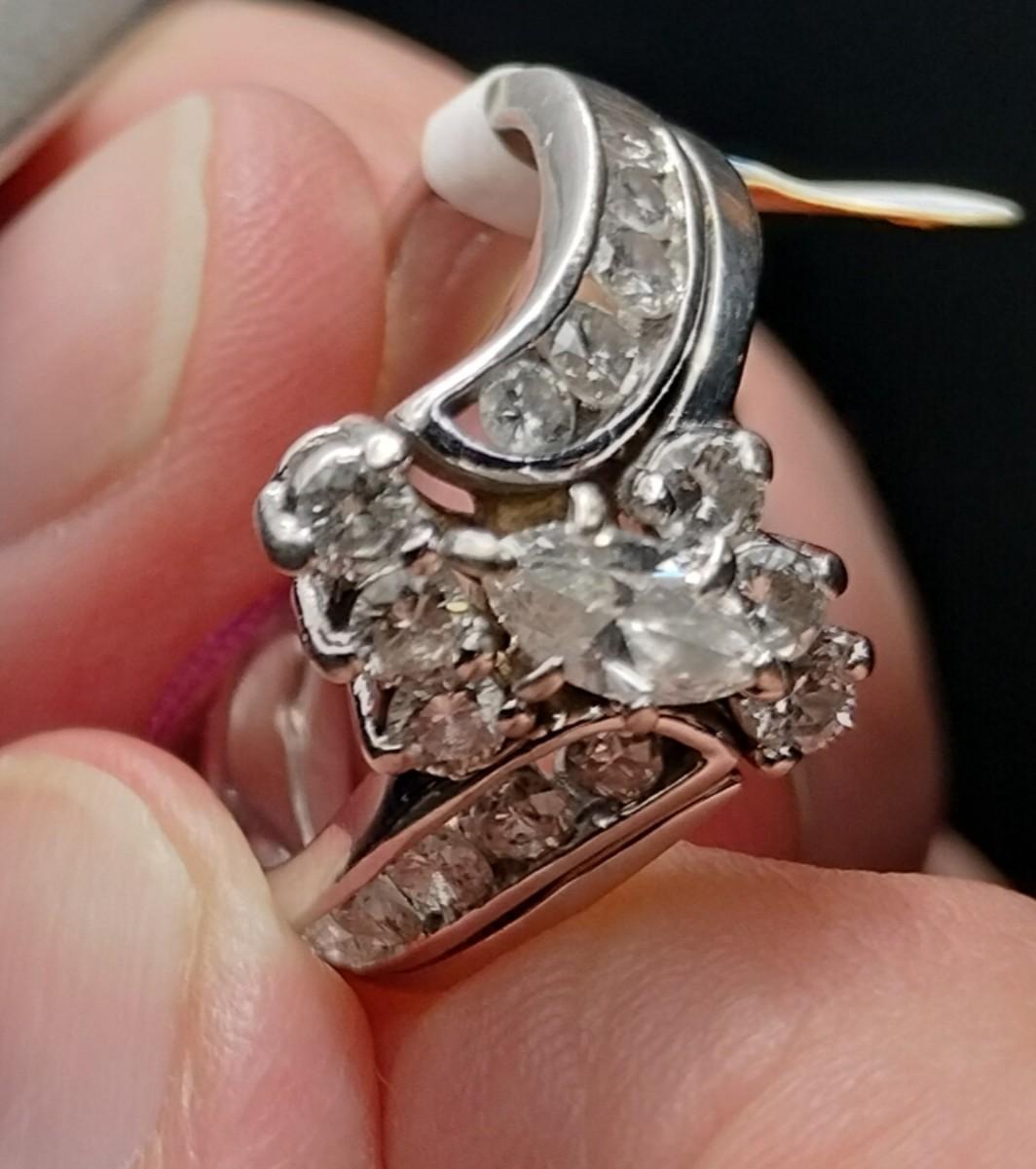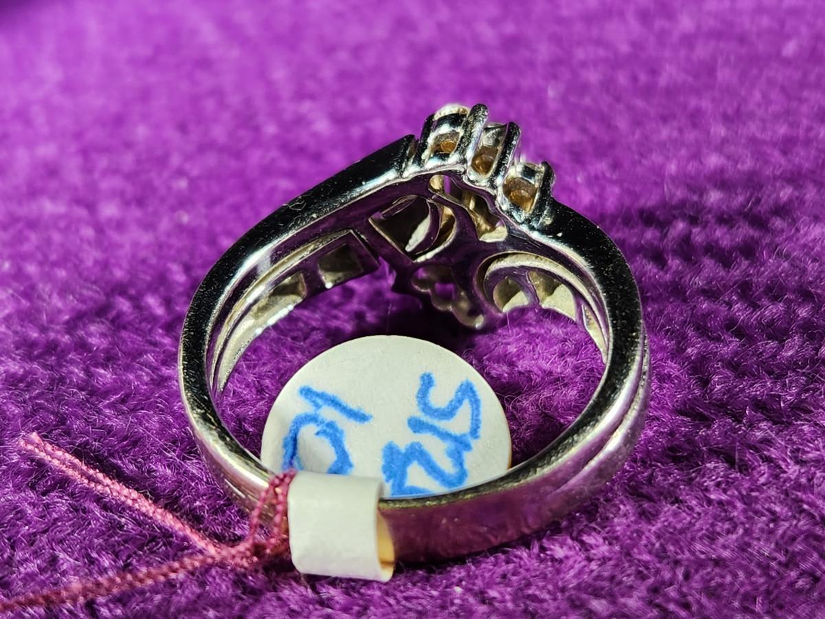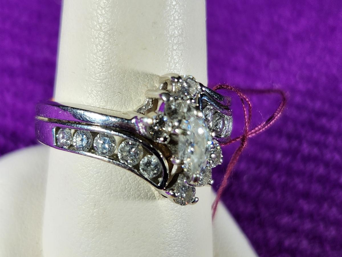 This auction lot is for a 14K Gold Marquise & 16 Small Diamonds Ring. The ring weighs about .0263ozt with diamonds. The ring is a size 10 and is marked 14K. The photos do not show the fire and glitz of the actual ring. Quite pretty.