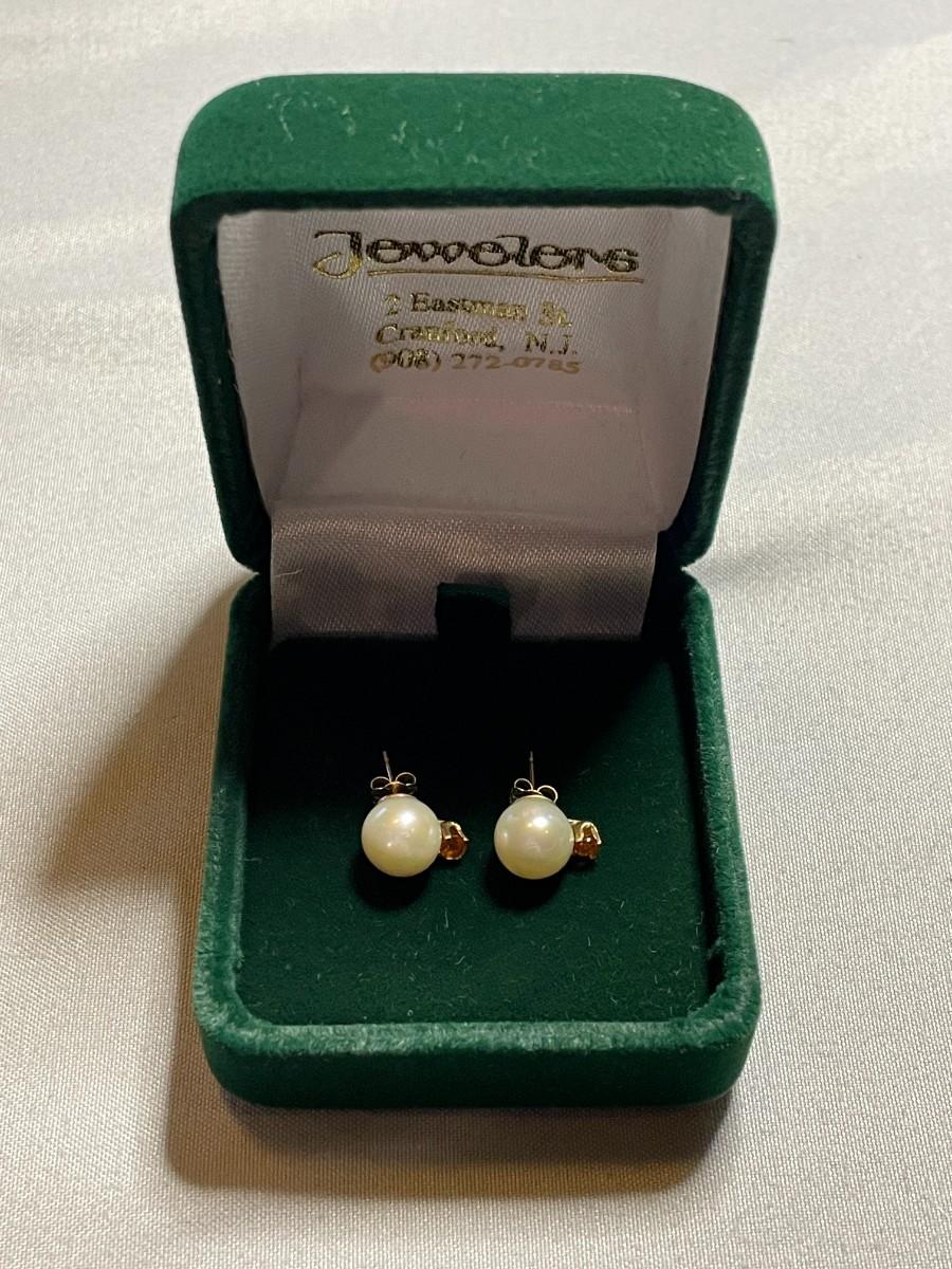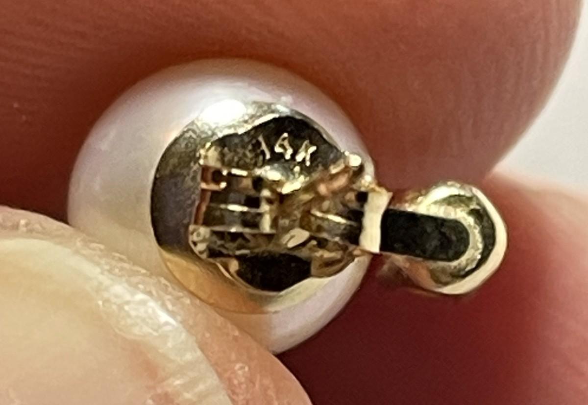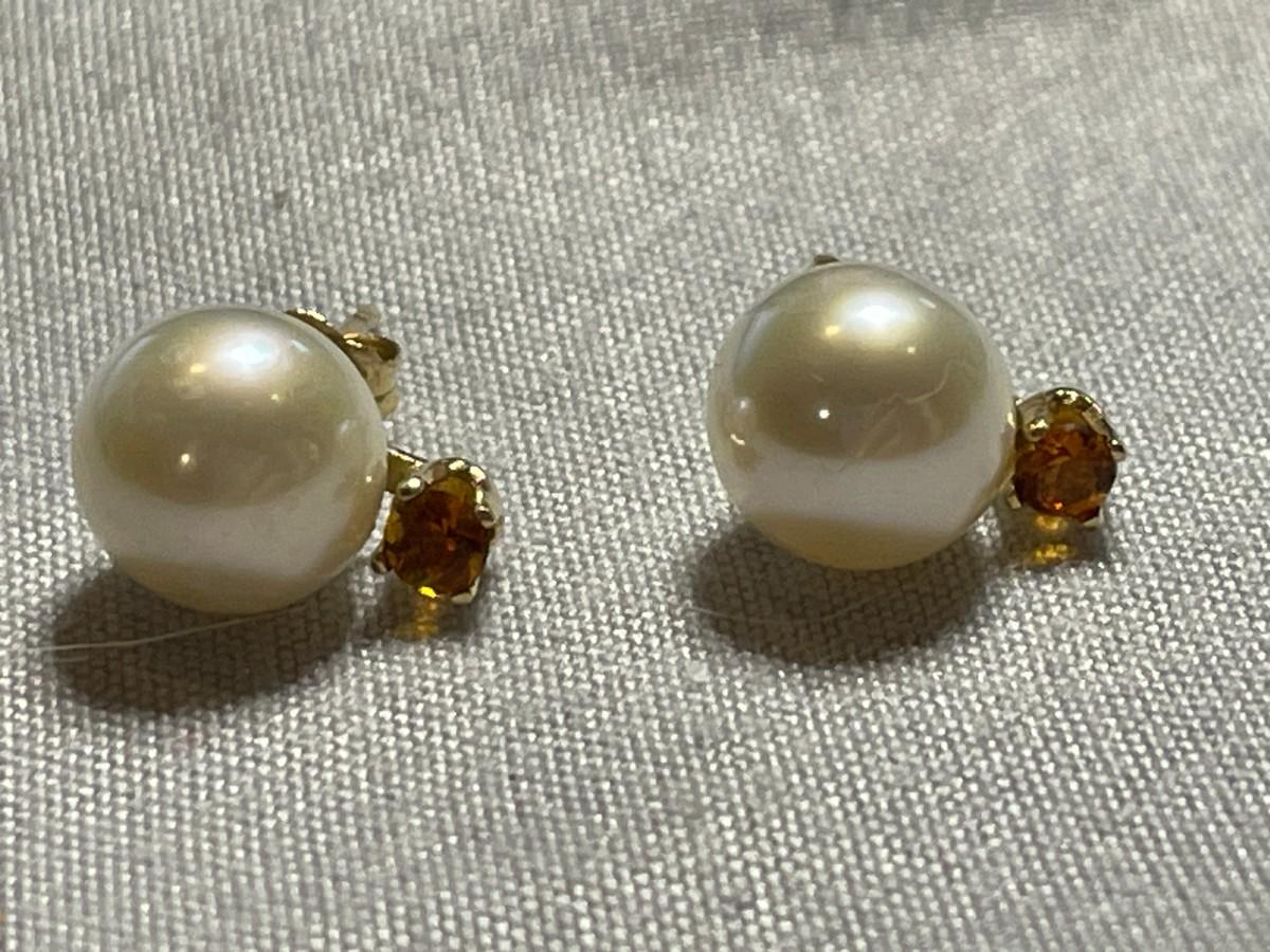The posts and backings of these earrings are 14K gold and since the pearls glow with the blacklight, I'm confident that they are authentic. The stone appears to be topaz and these are in excellent condition.