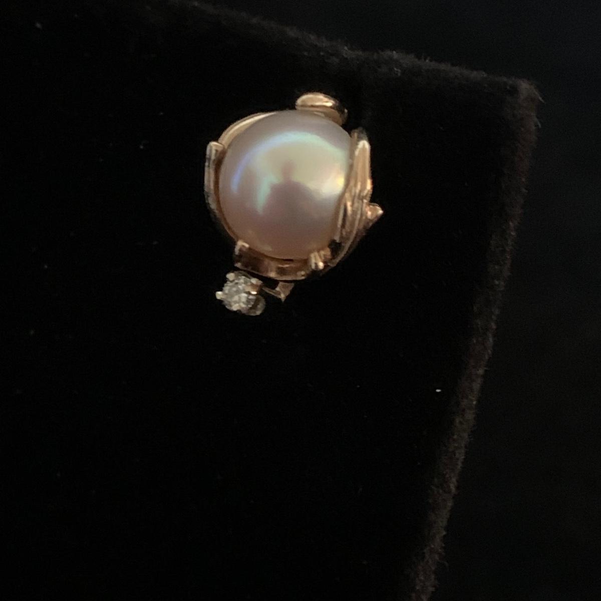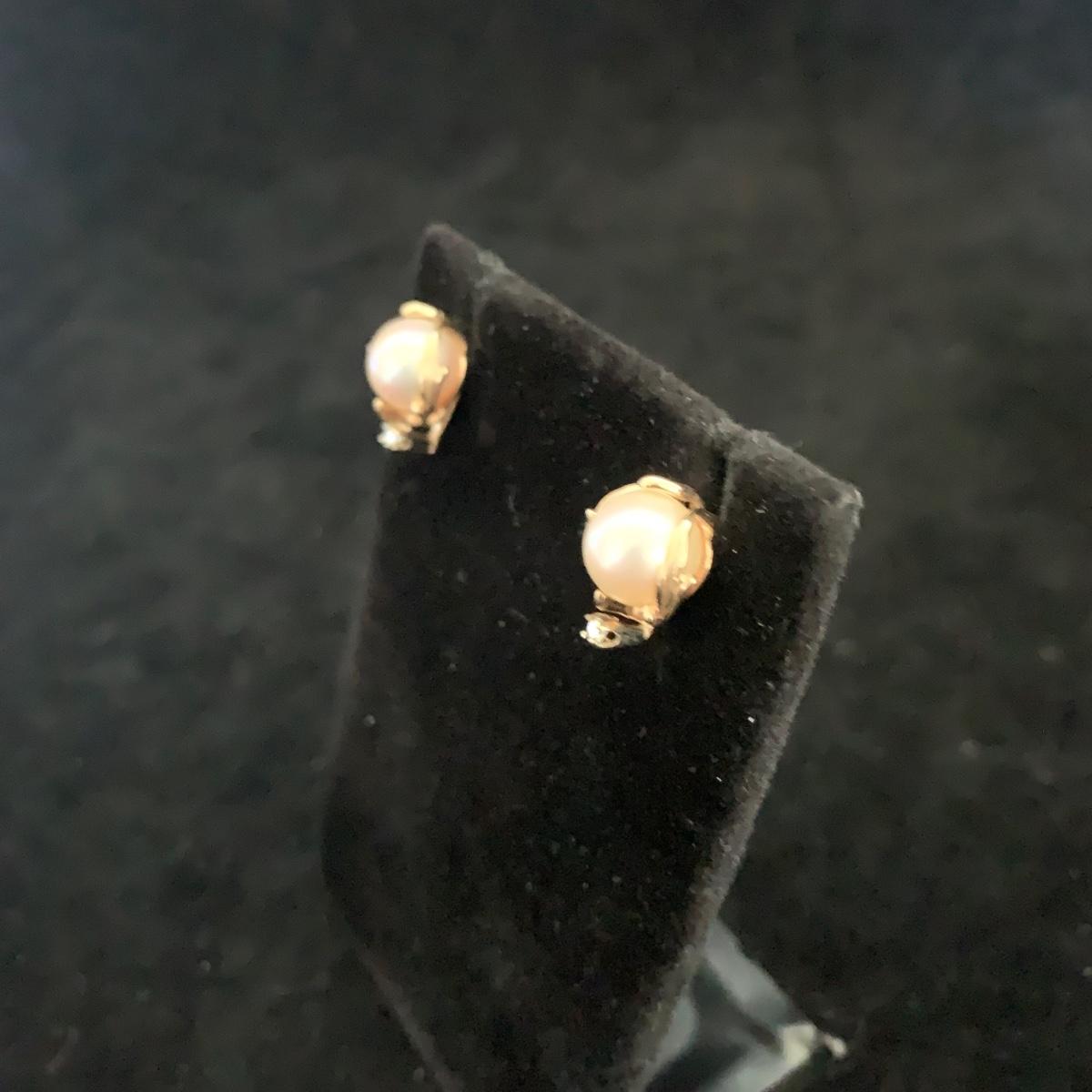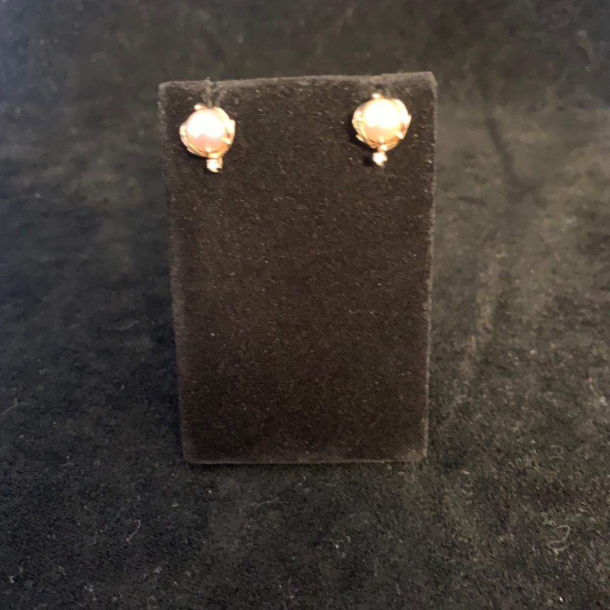 This breathtaking set of pearl jewelry includes a pair of stud earrings for pierced ears and a necklace. Both items are stamped 14K. The earrings have small diamond-like gemstones. The necklace is 18“. Two jewelry boxes are included.