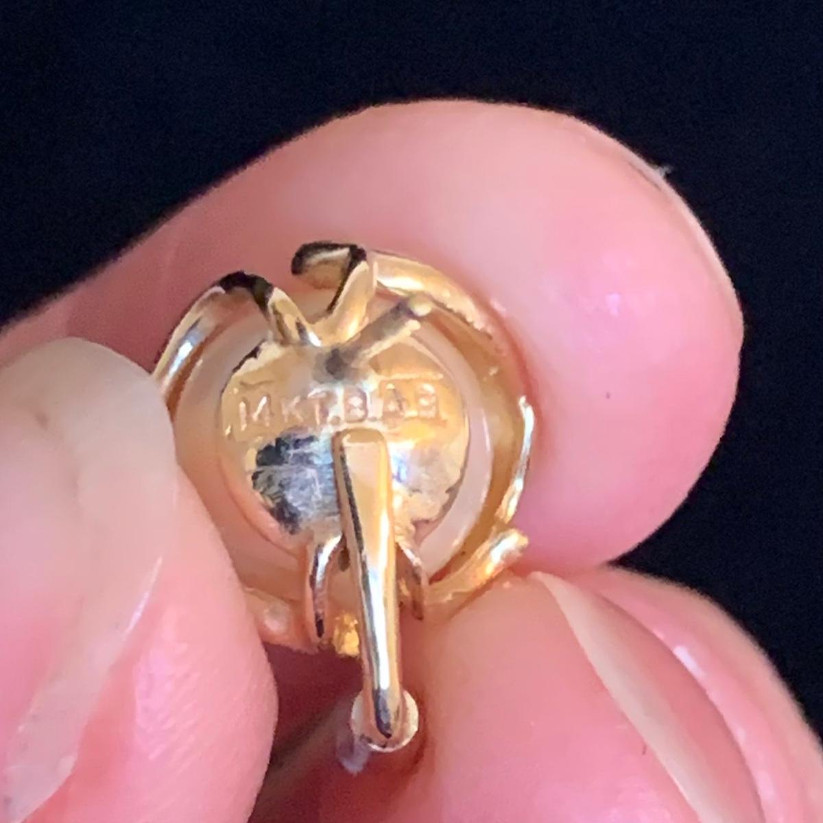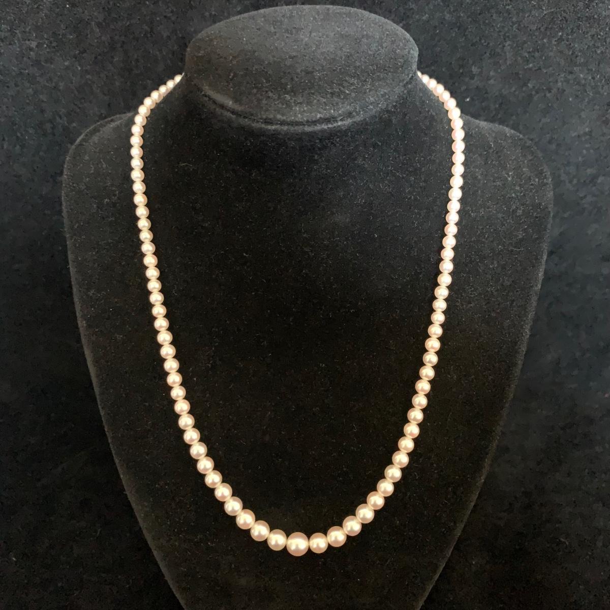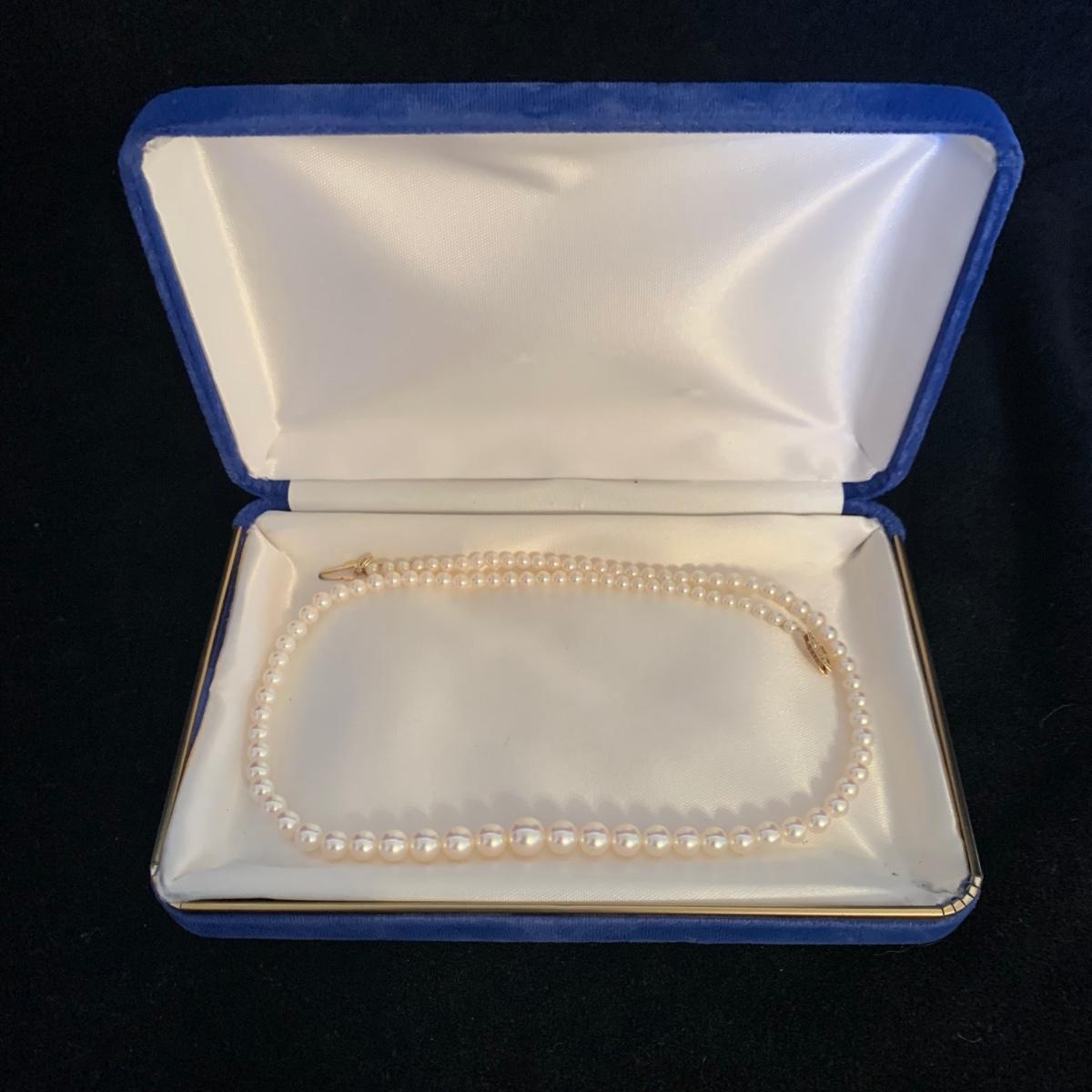 This breathtaking set of pearl jewelry includes a pair of stud earrings for pierced ears and a necklace. Both items are stamped 14K. The earrings have small diamond-like gemstones. The necklace is 18“. Two jewelry boxes are included.