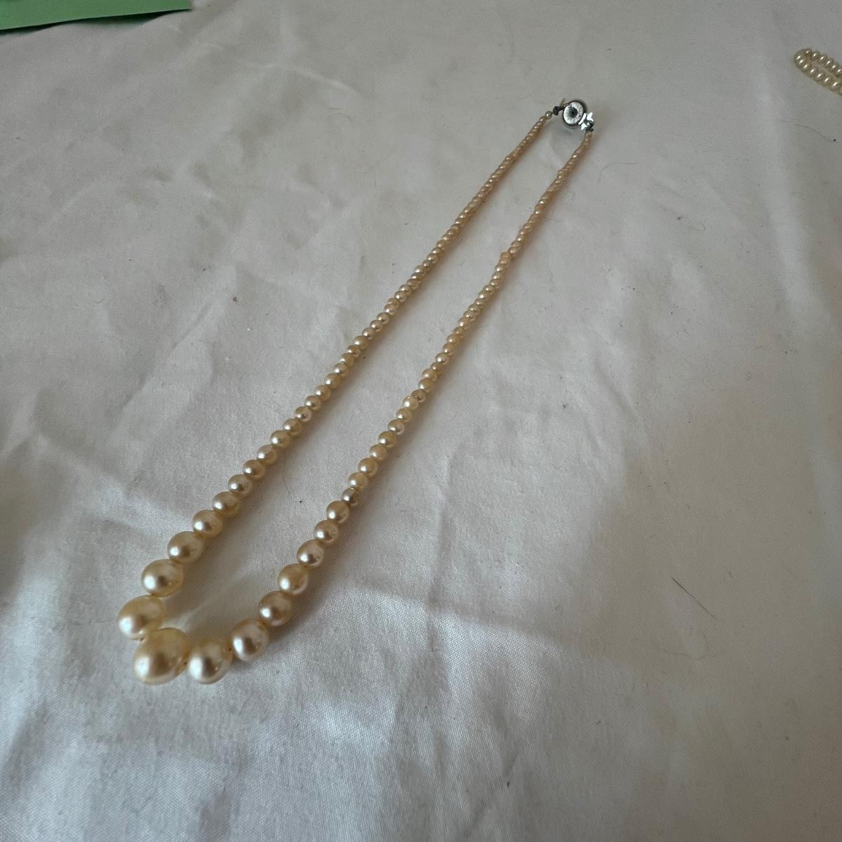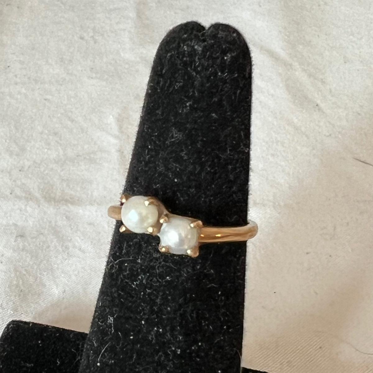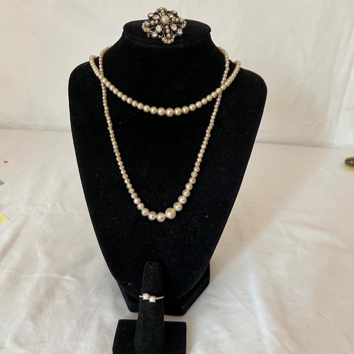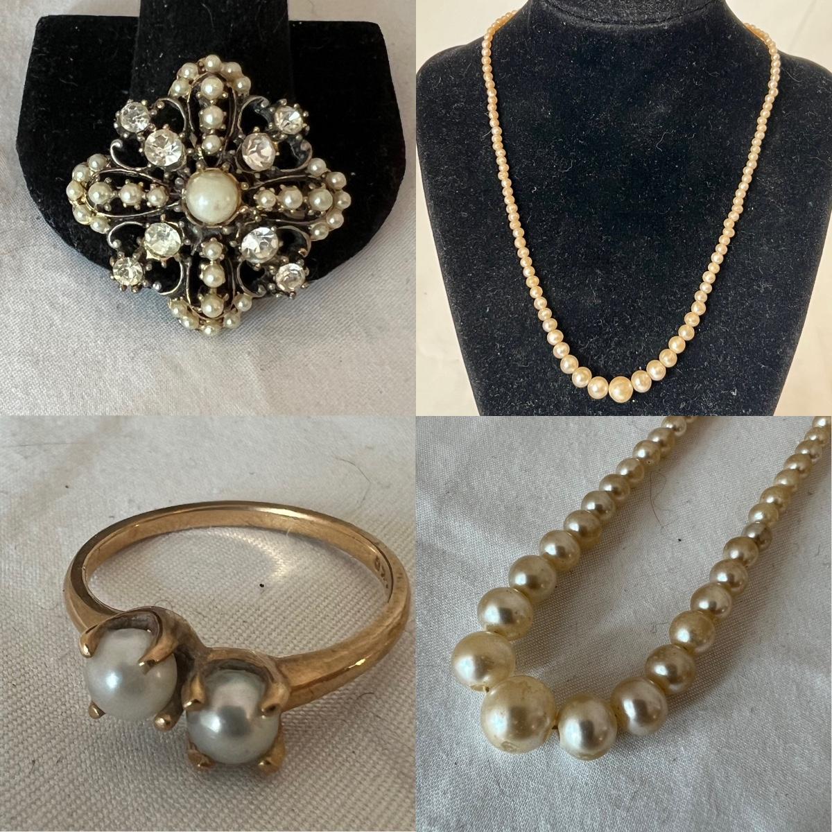 An assortment of pearl jewelry includes a ring, two necklaces and a brooch. The ring has a 14K gold band as does the clasp on one string of pearls. The brooch has synthetic diamonds. Please note we cannot authenticate any pearls.