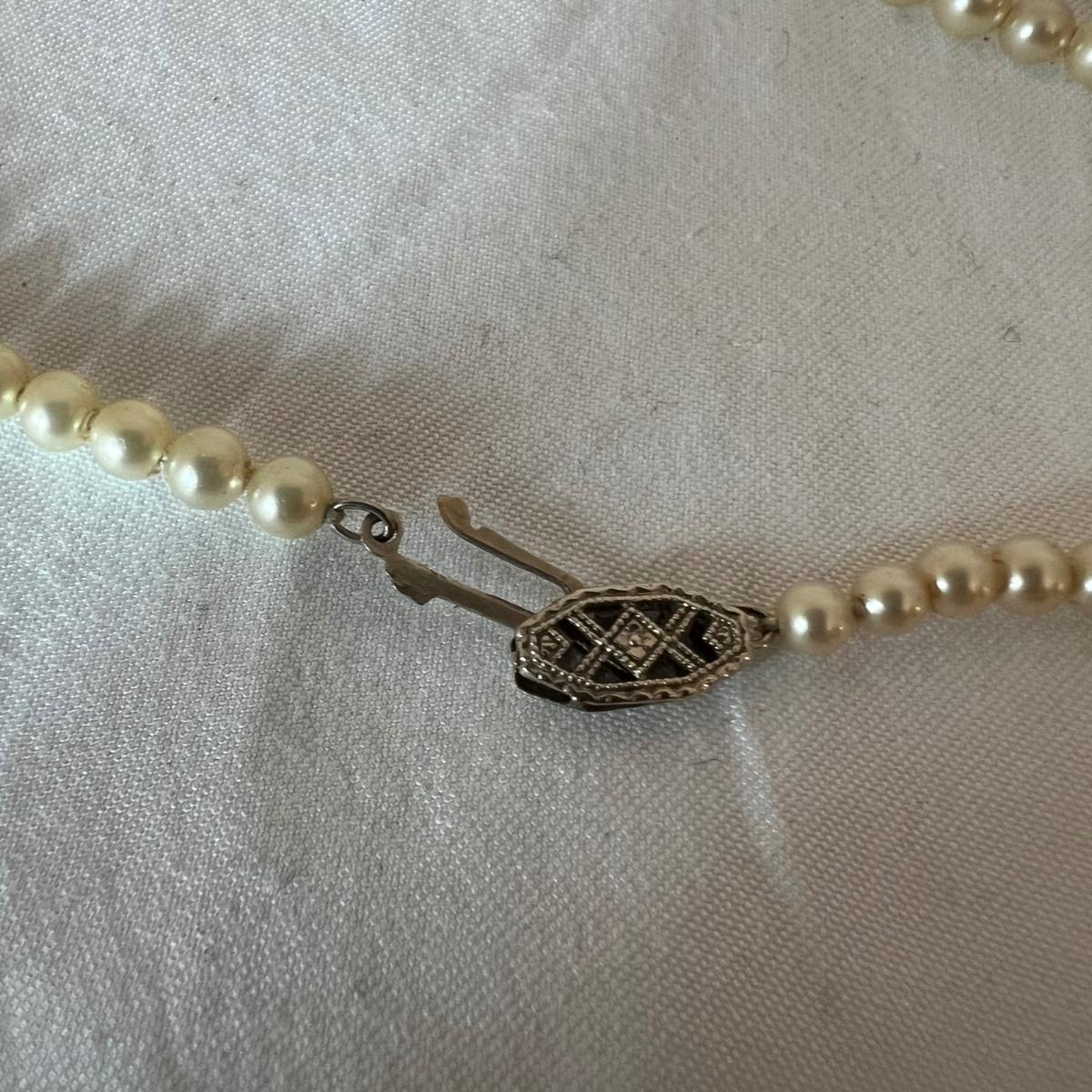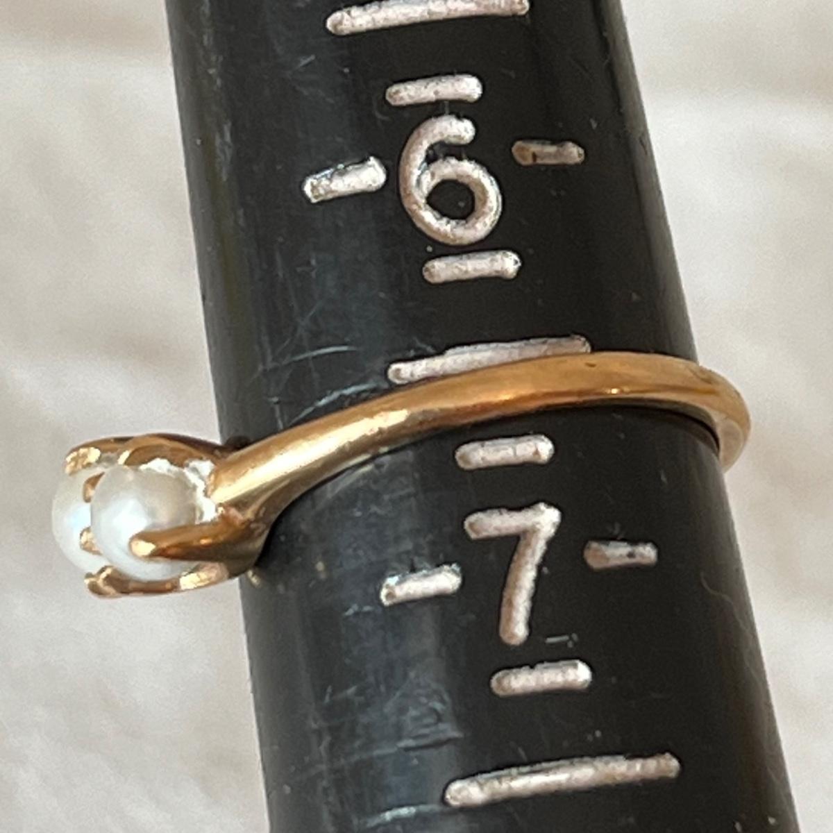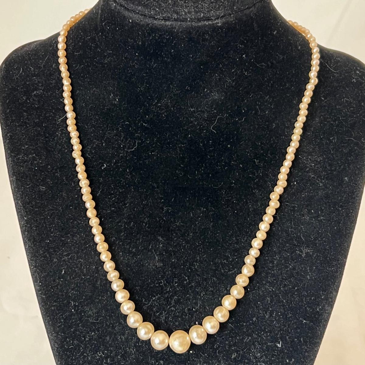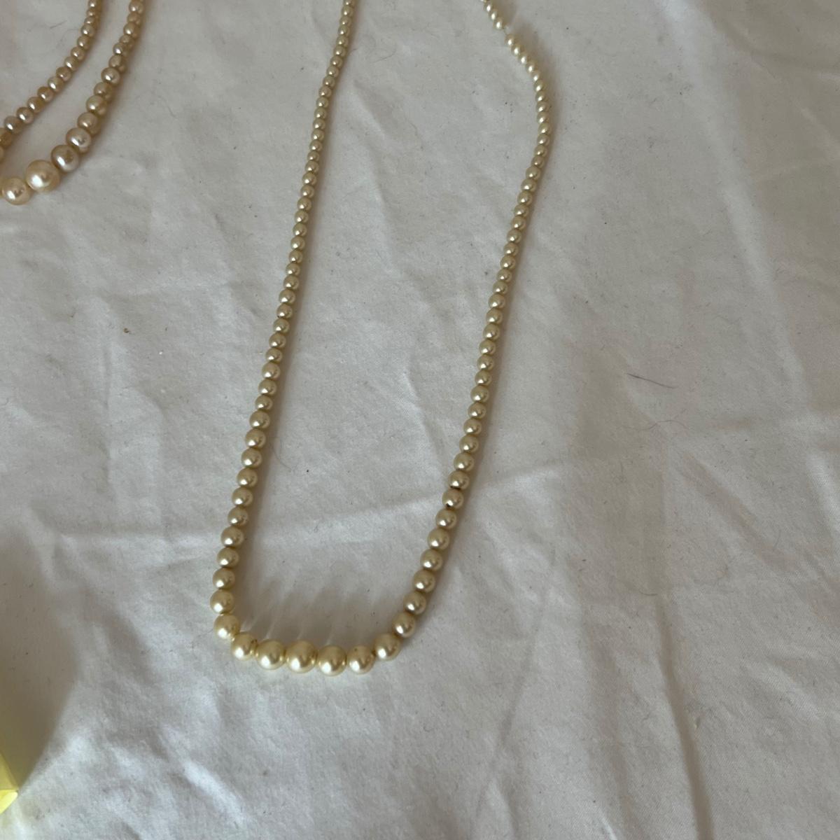 An assortment of pearl jewelry includes a ring, two necklaces and a brooch. The ring has a 14K gold band as does the clasp on one string of pearls. The brooch has synthetic diamonds. Please note we cannot authenticate any pearls.