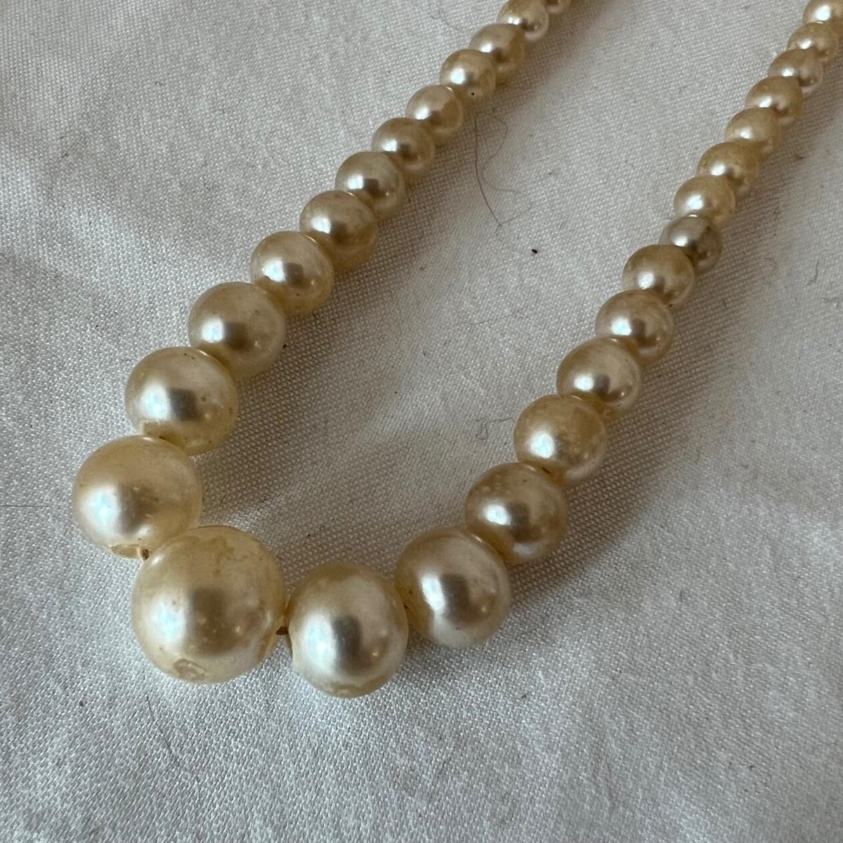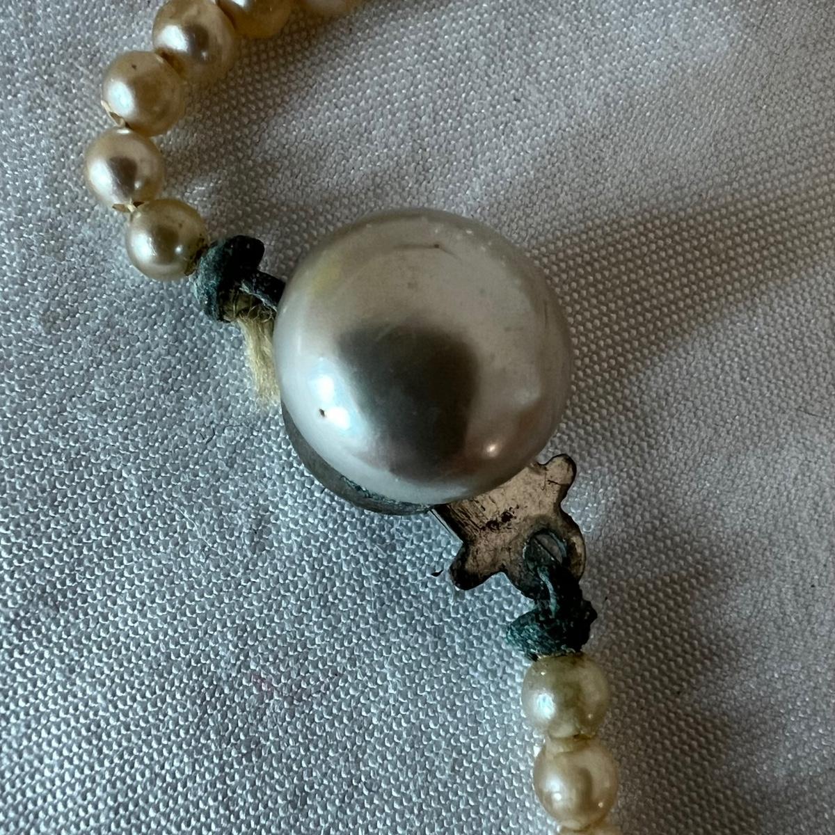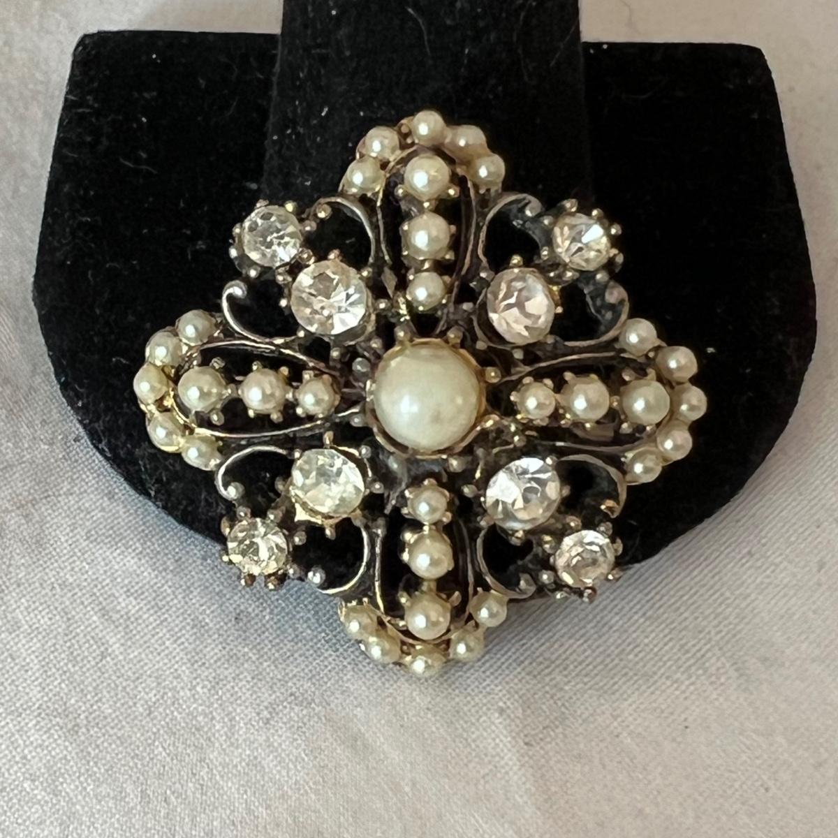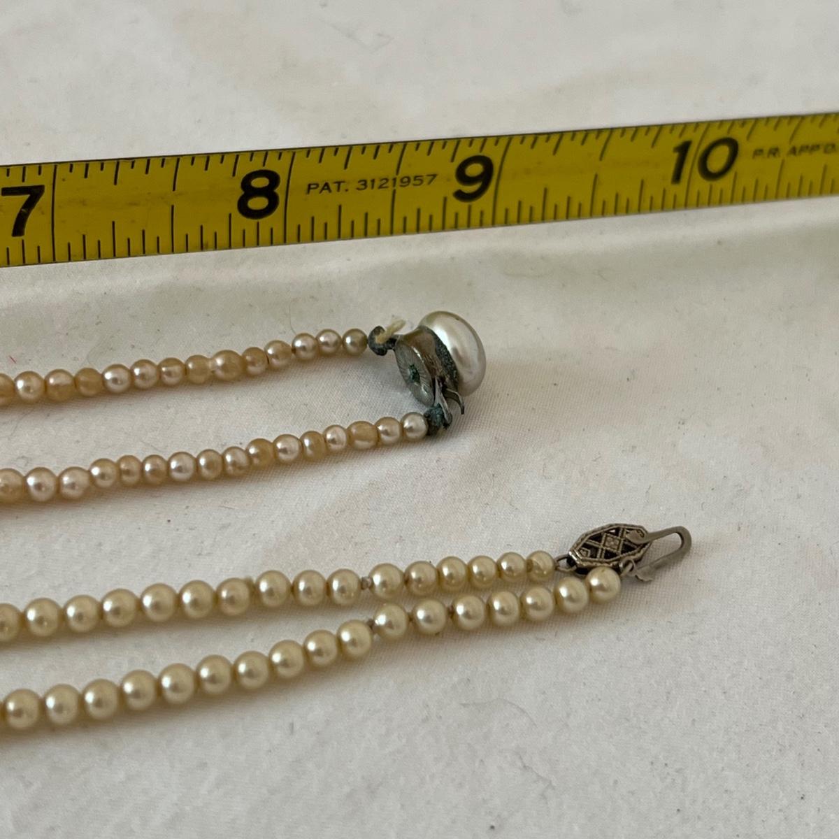 An assortment of pearl jewelry includes a ring, two necklaces and a brooch. The ring has a 14K gold band as does the clasp on one string of pearls. The brooch has synthetic diamonds. Please note we cannot authenticate any pearls.