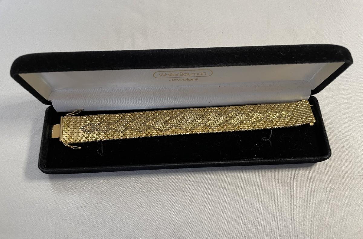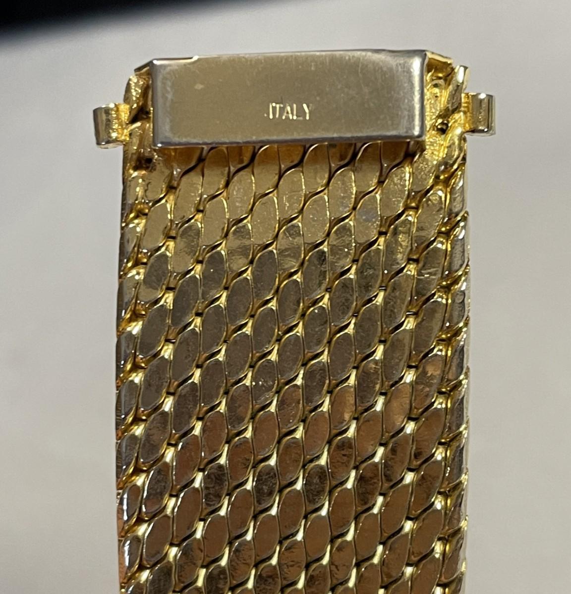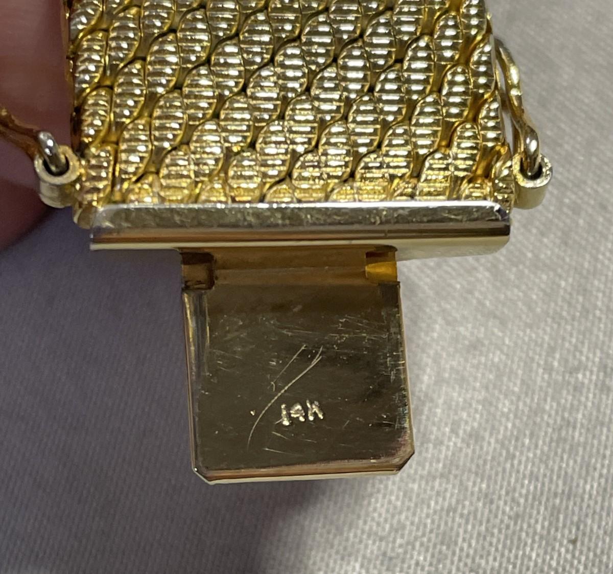 This is a heavy bracelet that is gold plated in 14K gold. It is about 7.25 inches long and just over 0.75 inches wide. It is in excellent, barely used condition.