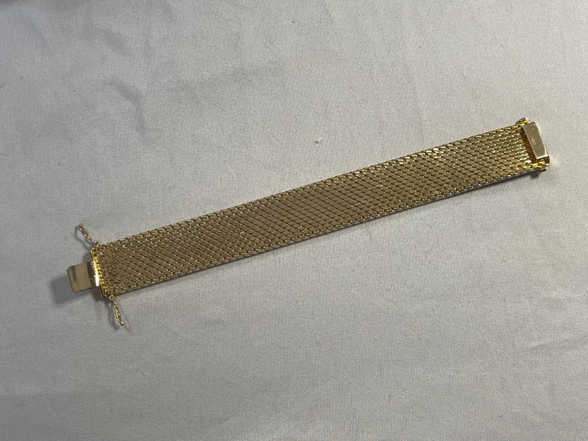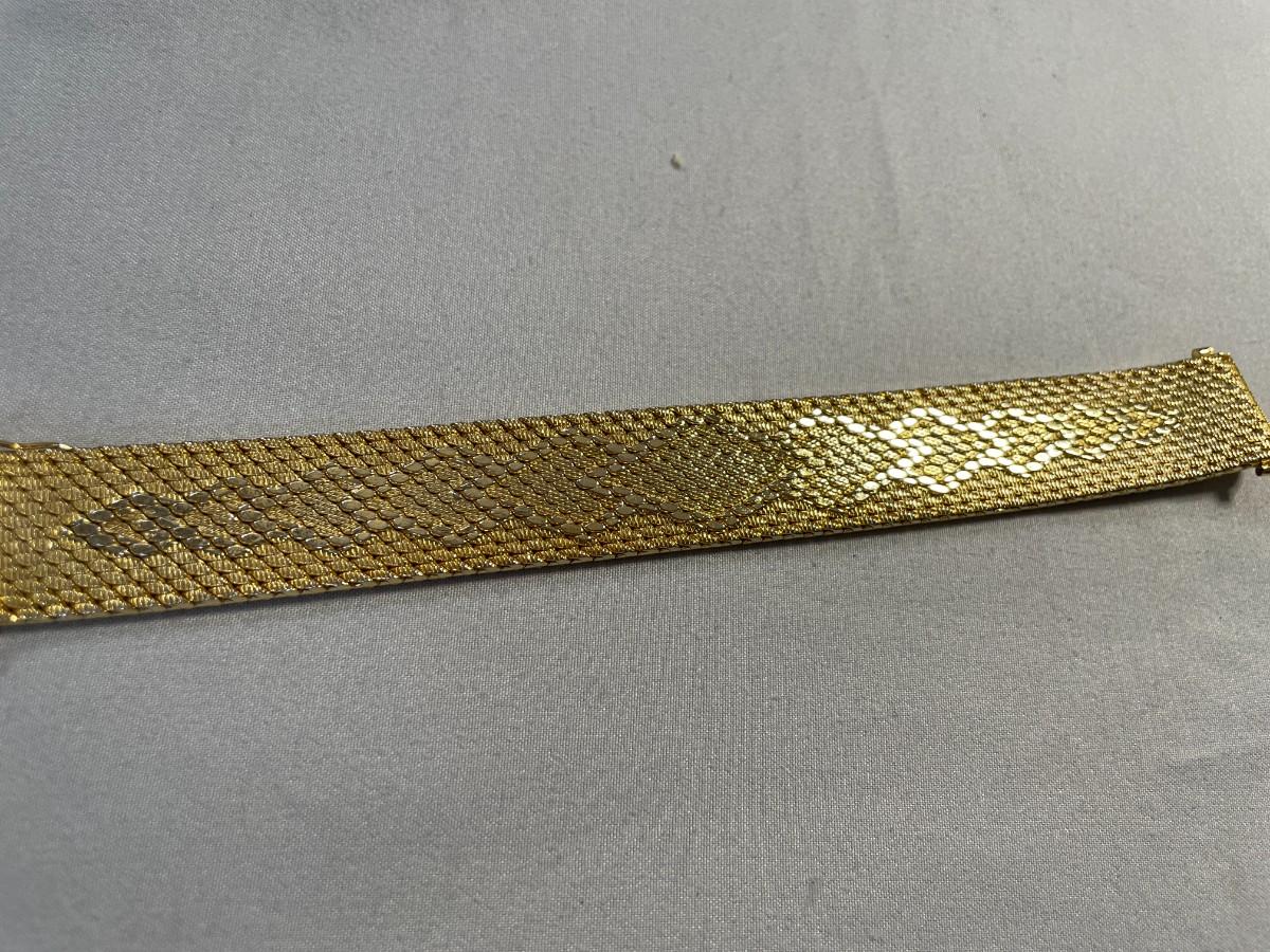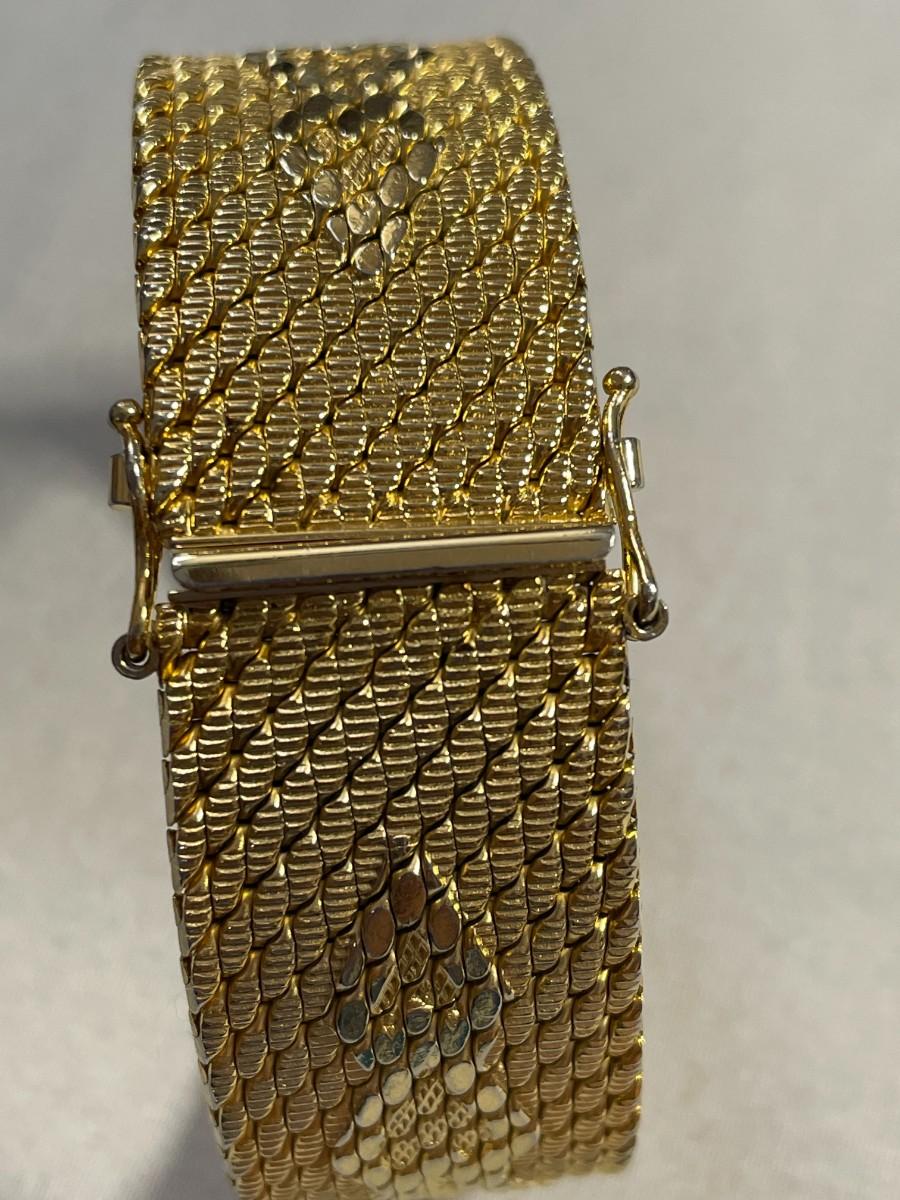This is a heavy bracelet that is gold plated in 14K gold. It is about 7.25 inches long and just over 0.75 inches wide. It is in excellent, barely used condition.