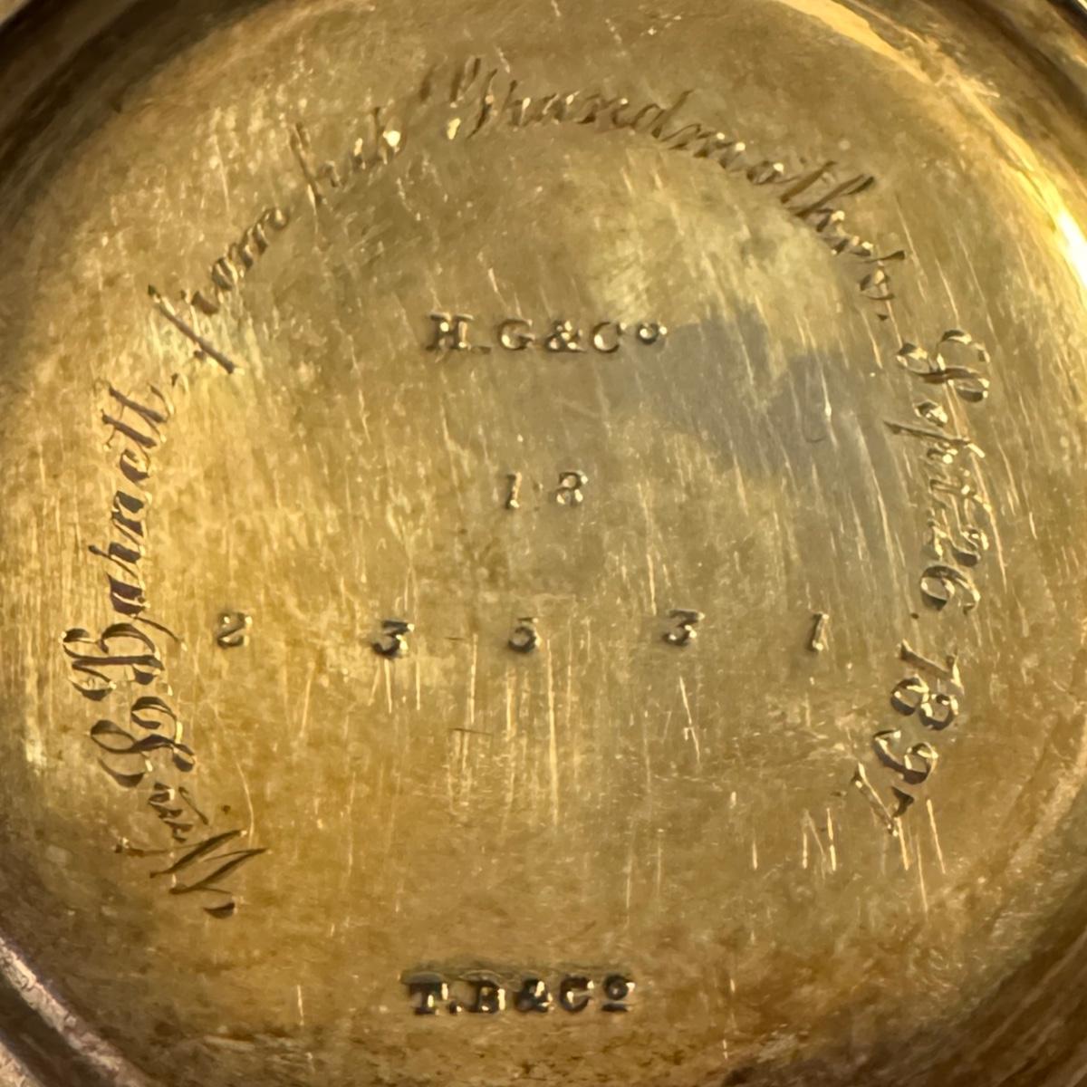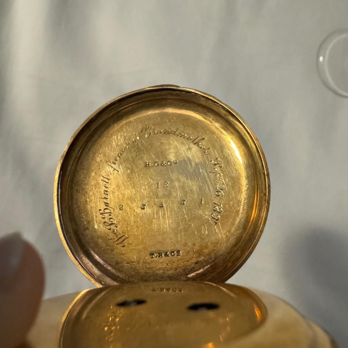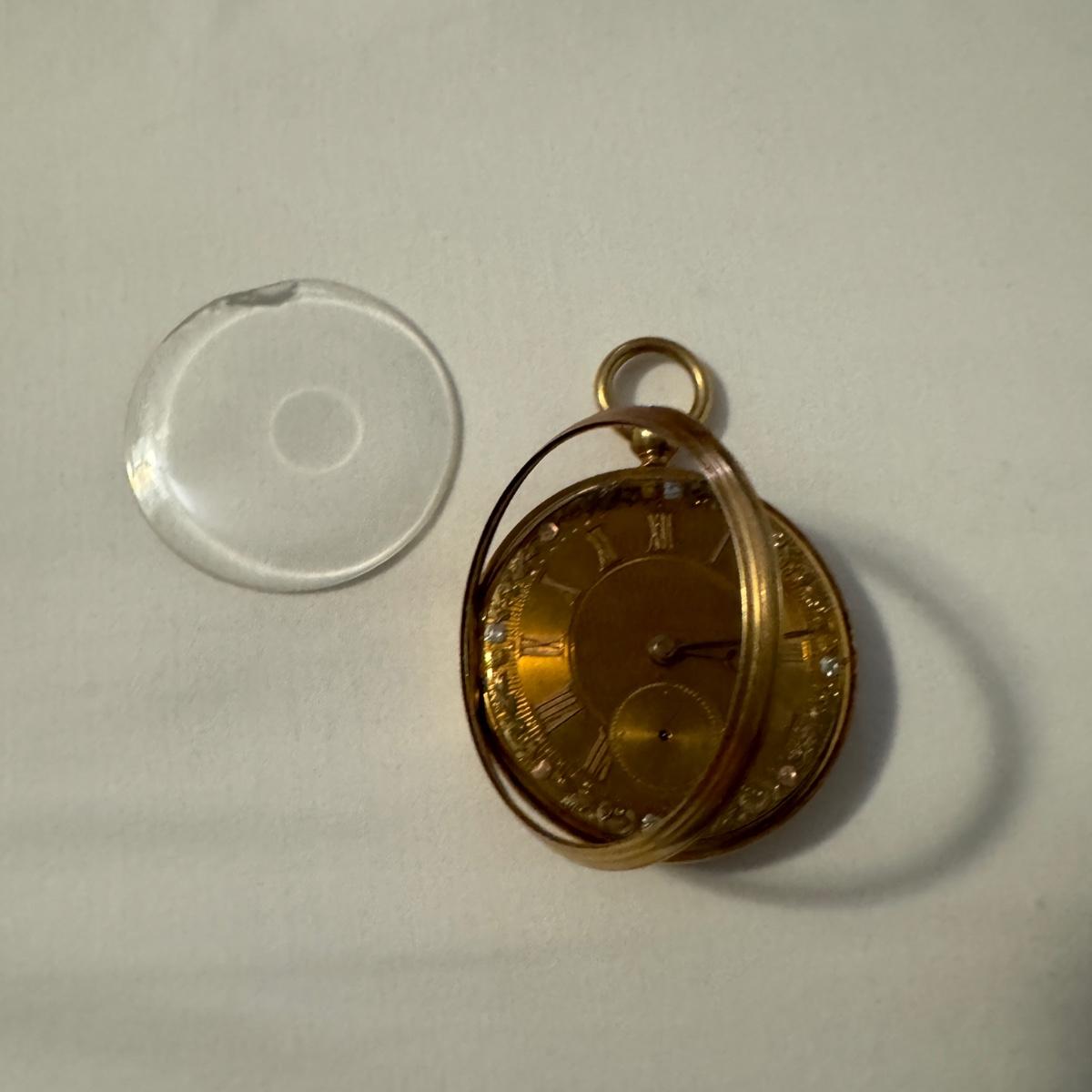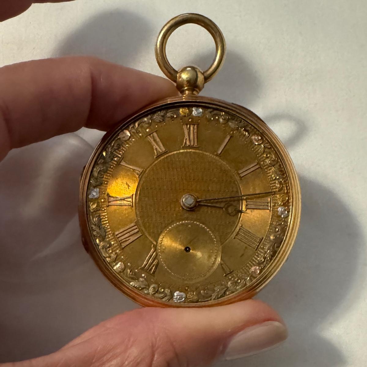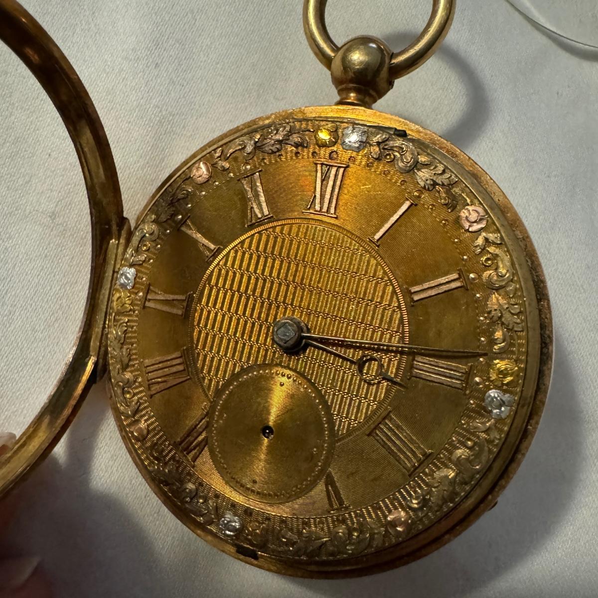 14k pocket watch with diamond accents. The glass front on this watch is unattached and has a chip on the side. The diamonds did not register on our diamond tester so we are unsure of their authenticity. See close up photos for engraving details. It appears to be a gift from former owner grandmother in 1897. . The gold was tested by a local jeweler as 14k but there are no 14k markings. We do not guarantee these results so feel free to come to preview to see test for yourself. Shopping available