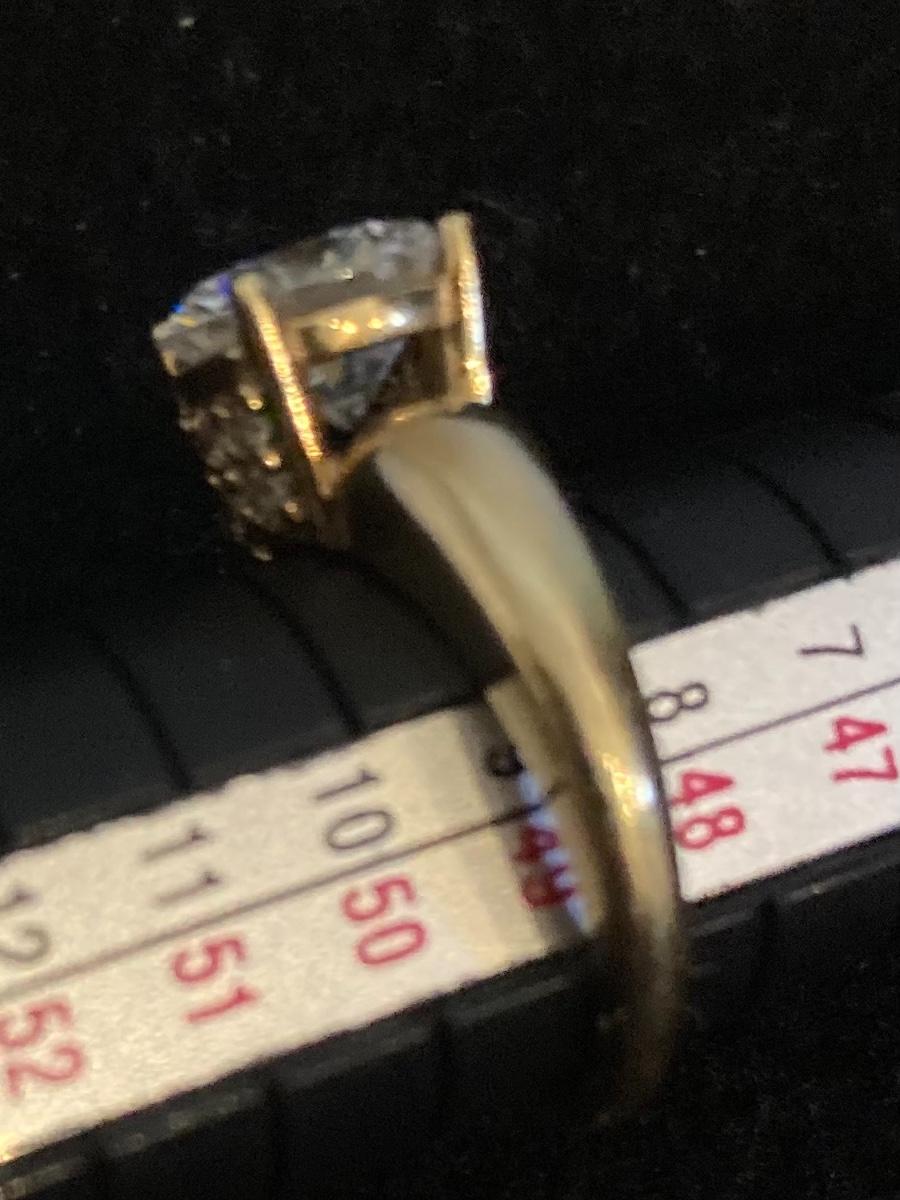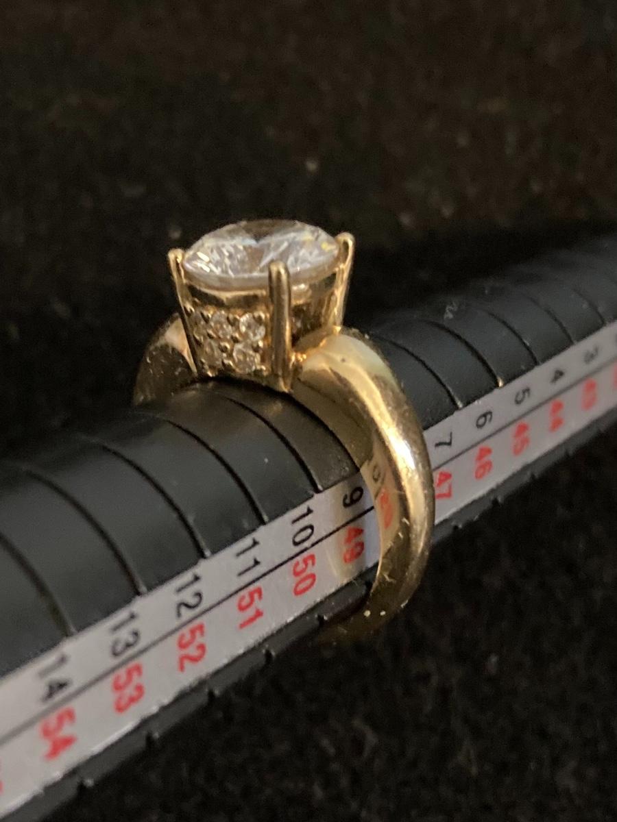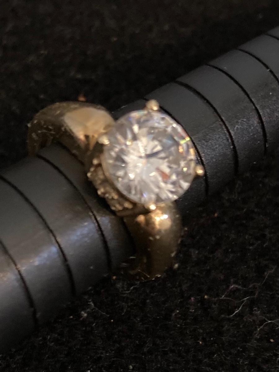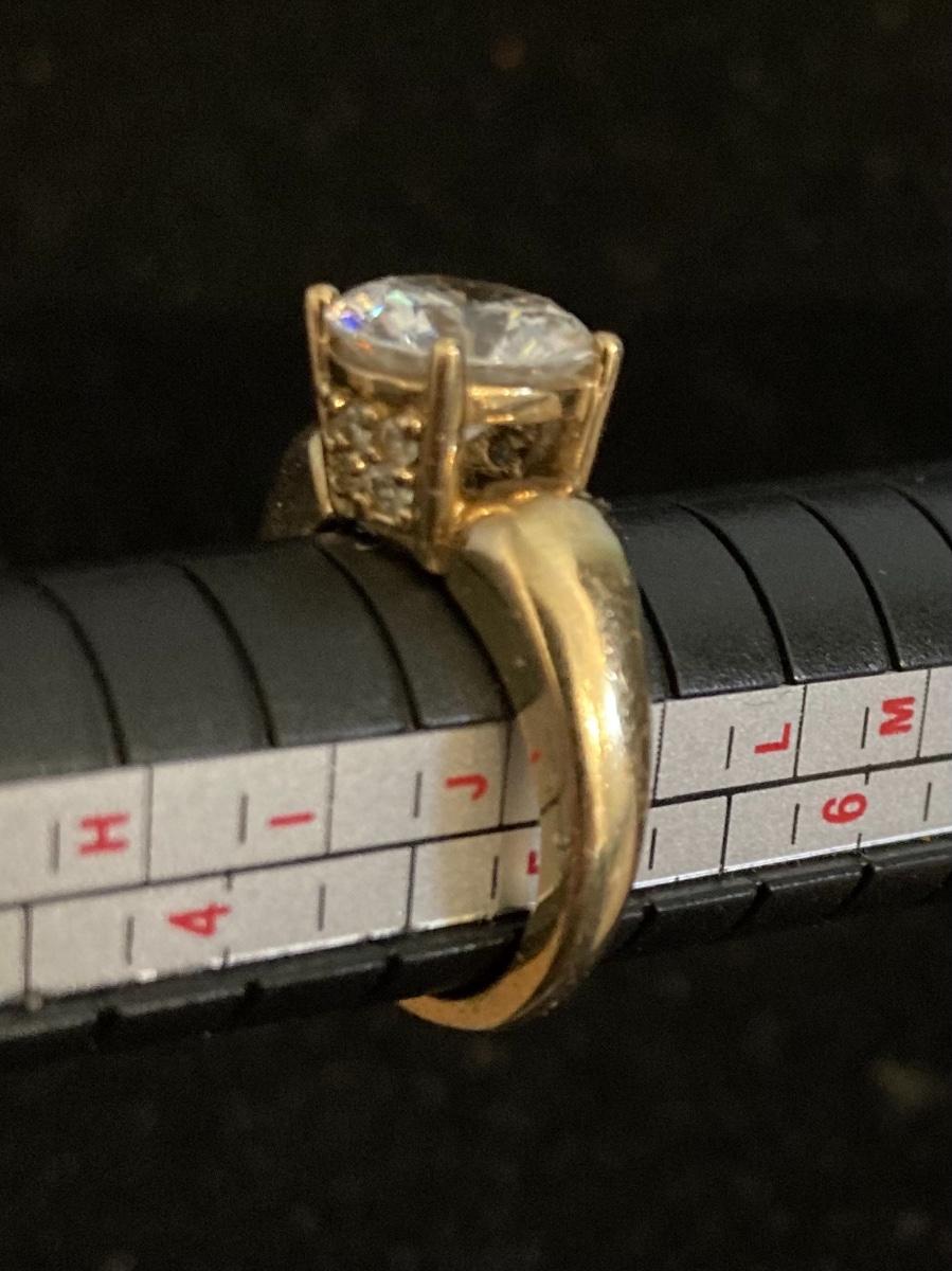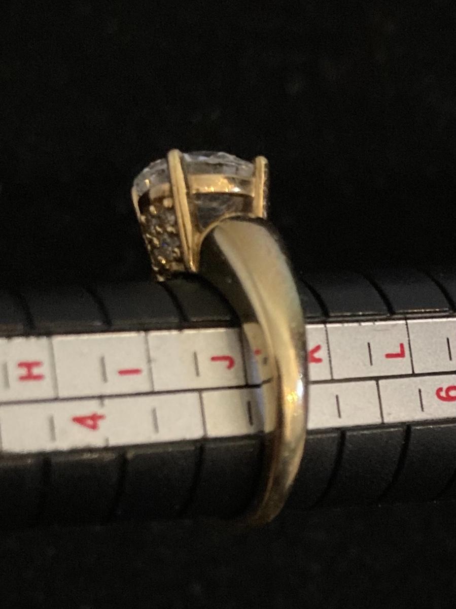 Center stone is approx 3 carats. Tested as 14k. Weight is 5 grams. Very good condition. Please see pictures for details. Packaging and shipping services available. Please contact us, if you need a shipping quote, before bidding.