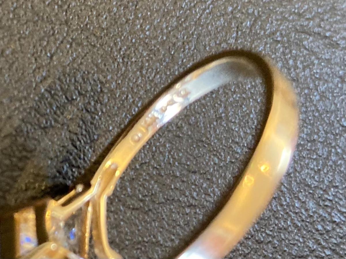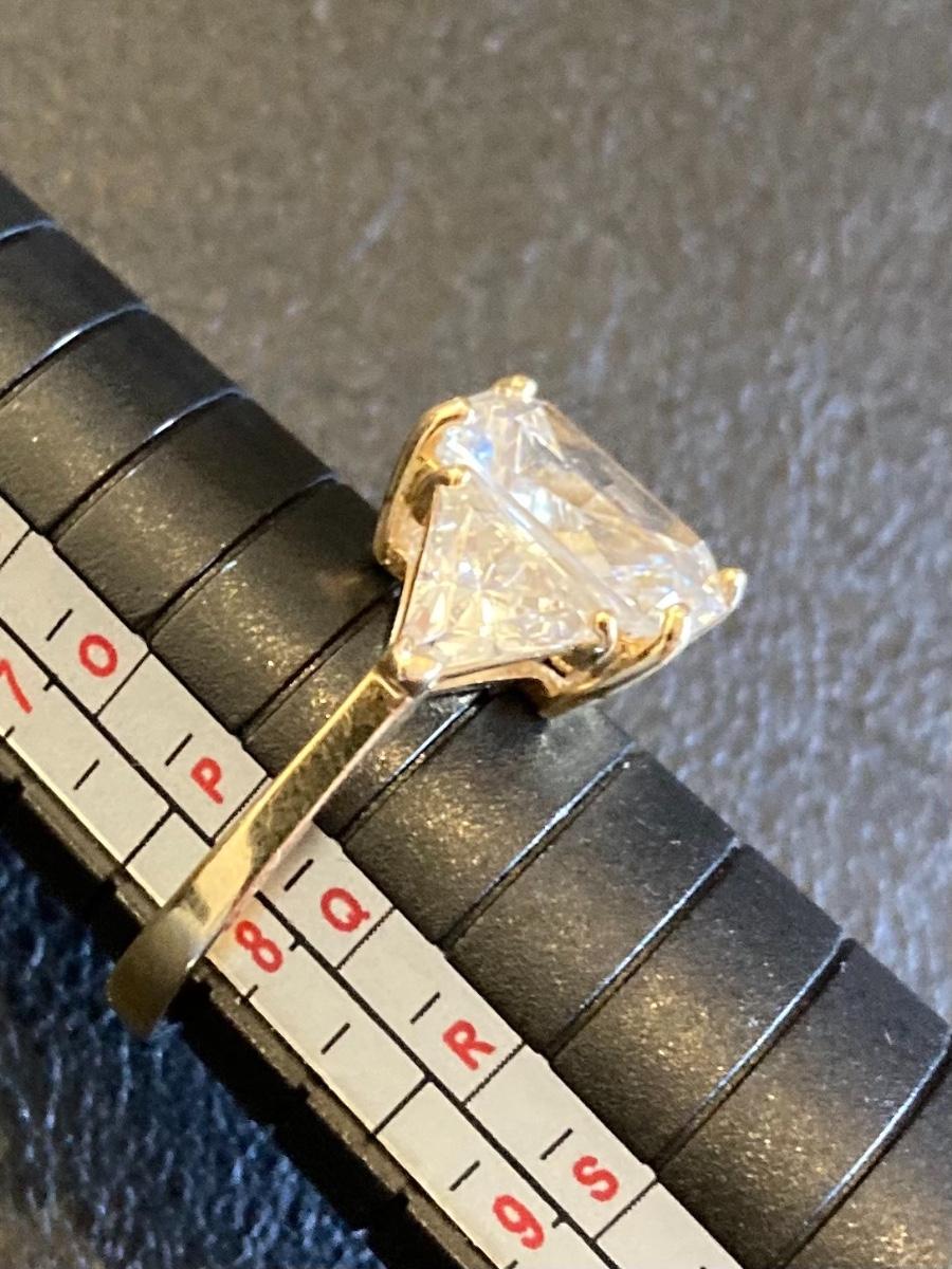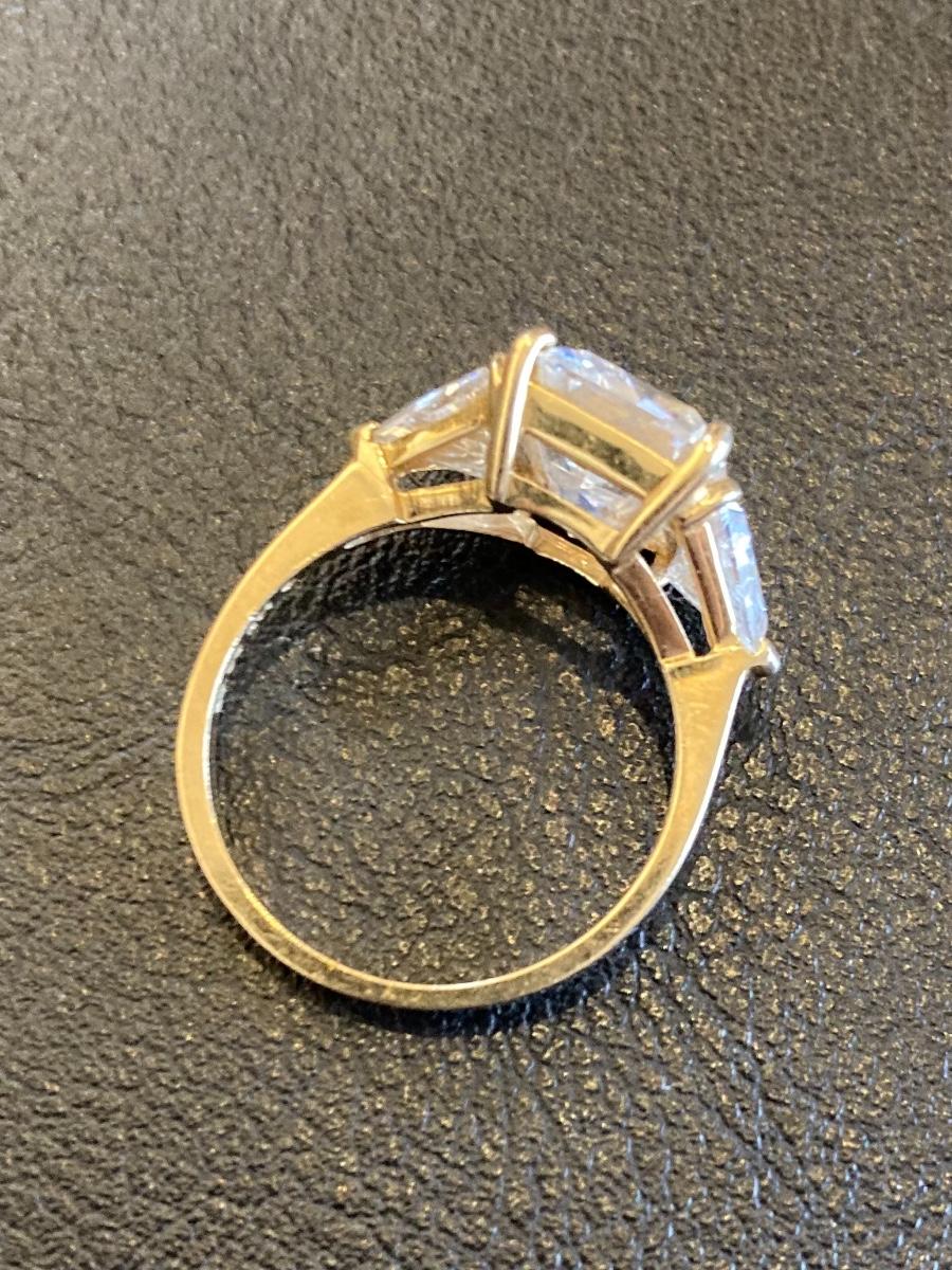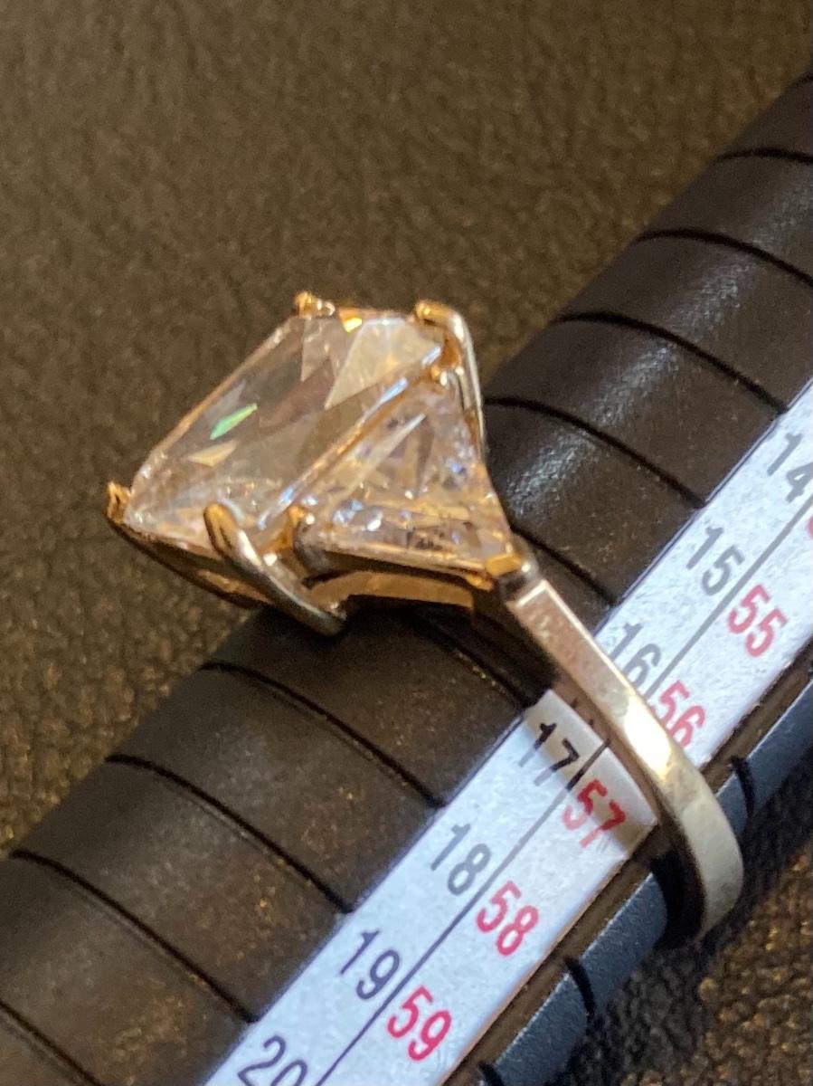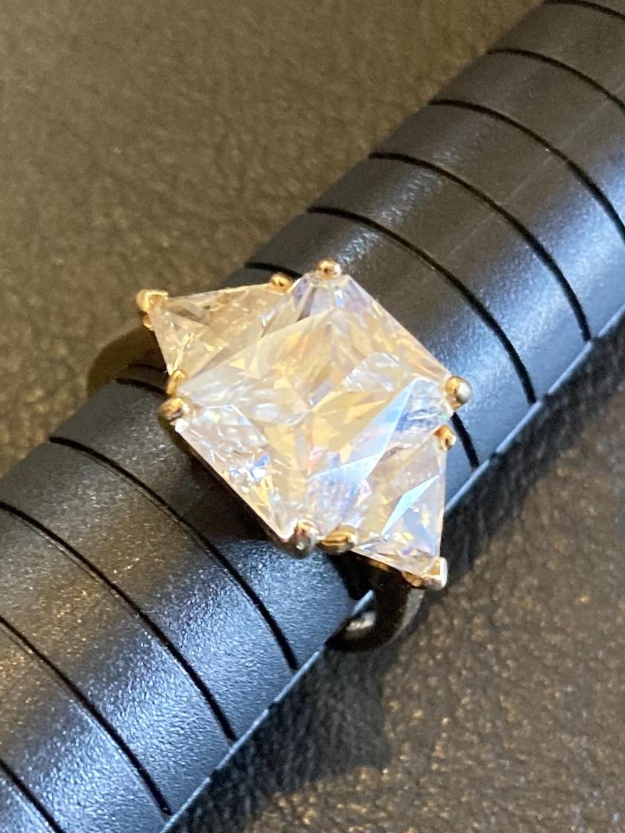 Large square CZ is approx. 5 carats. Two triangle side stones are approx. 1.5 carats each. Weight is 5 grams.