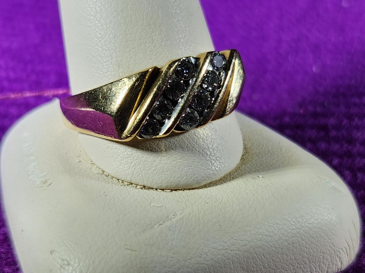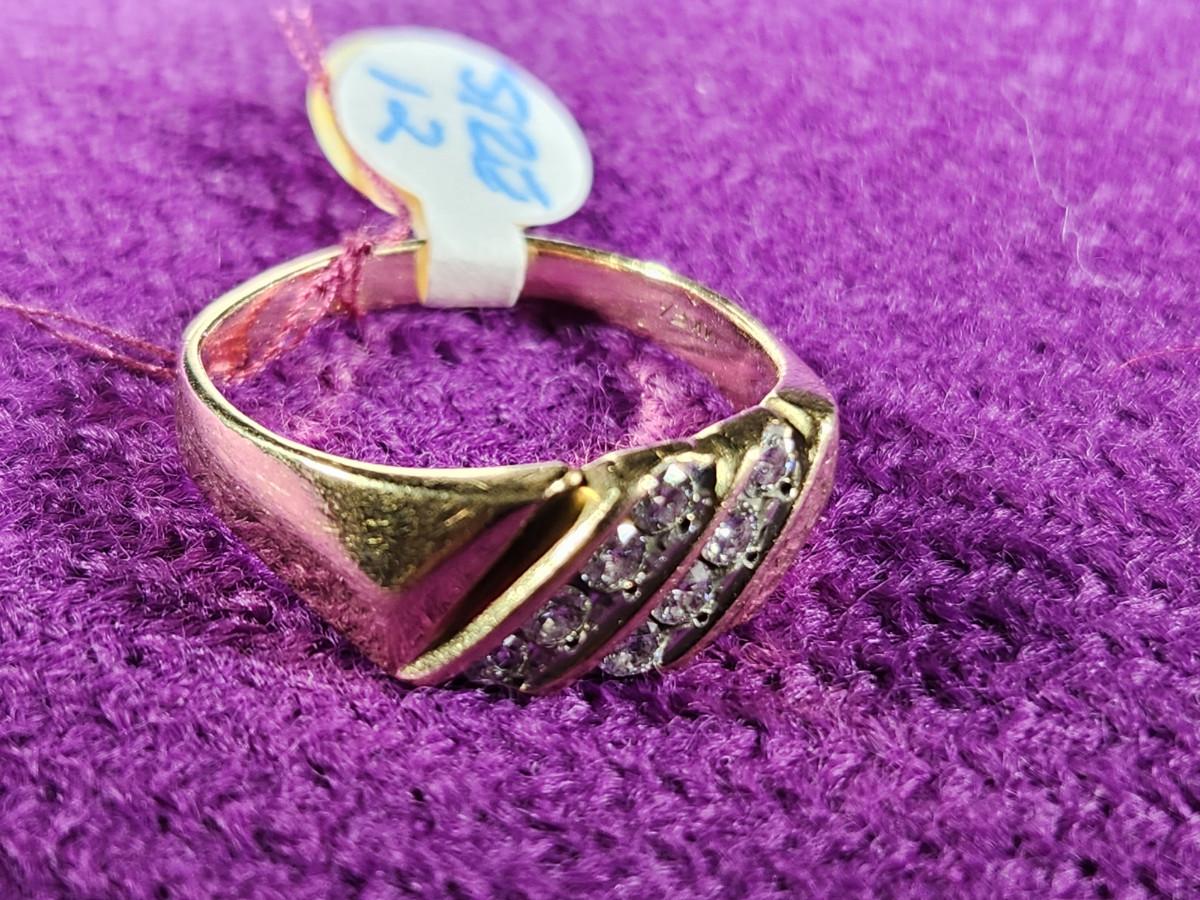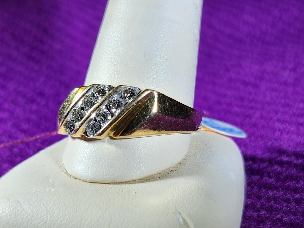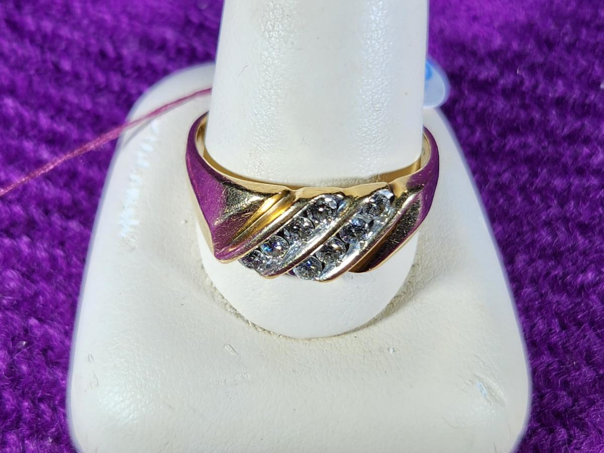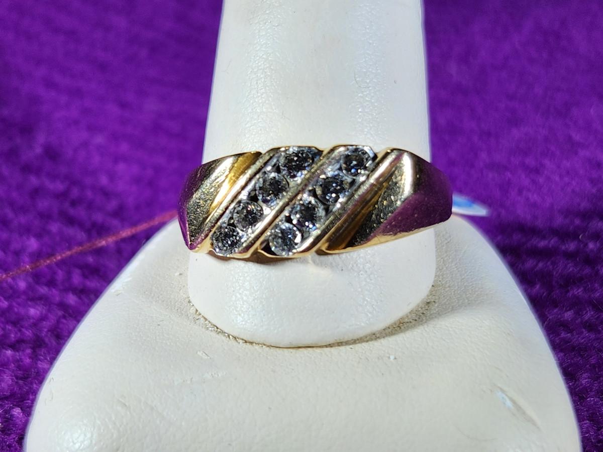 This auction lot is for a 14K Gold Ring with Diamonds. The ring weighs about .279ozt with diamonds. The gems have tested as diamonds but have not been graded. the ring is a size 12 and is marked as 14K. Photos do not show this ring to its full beauty.
