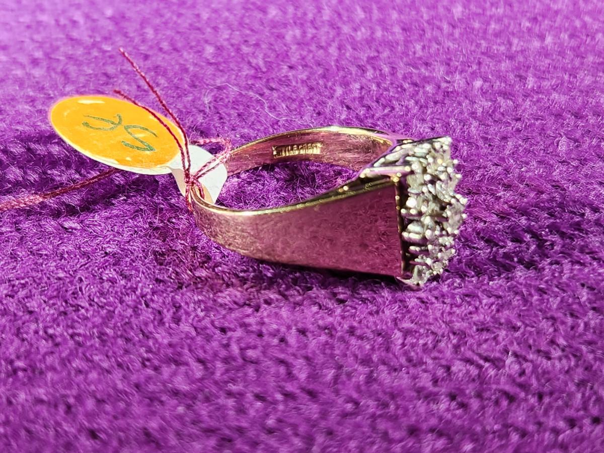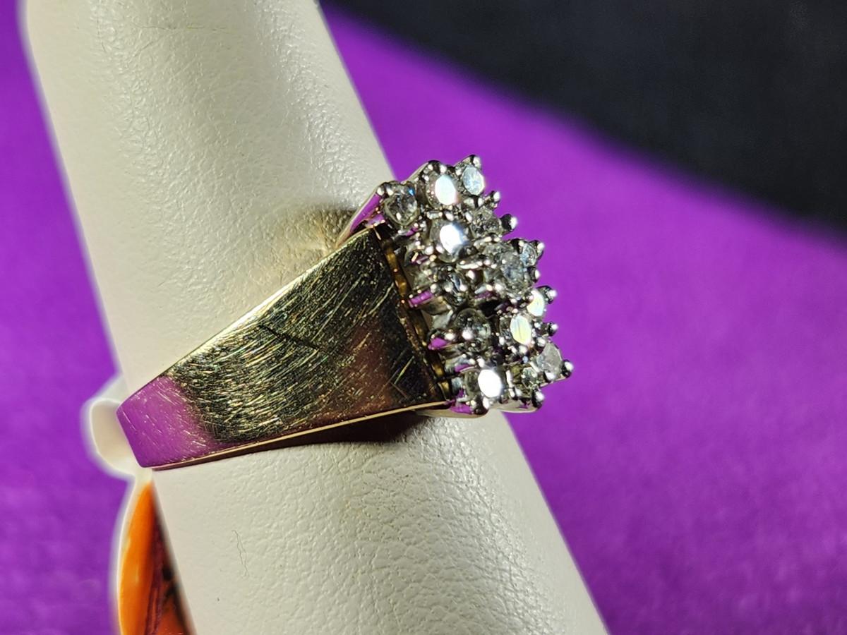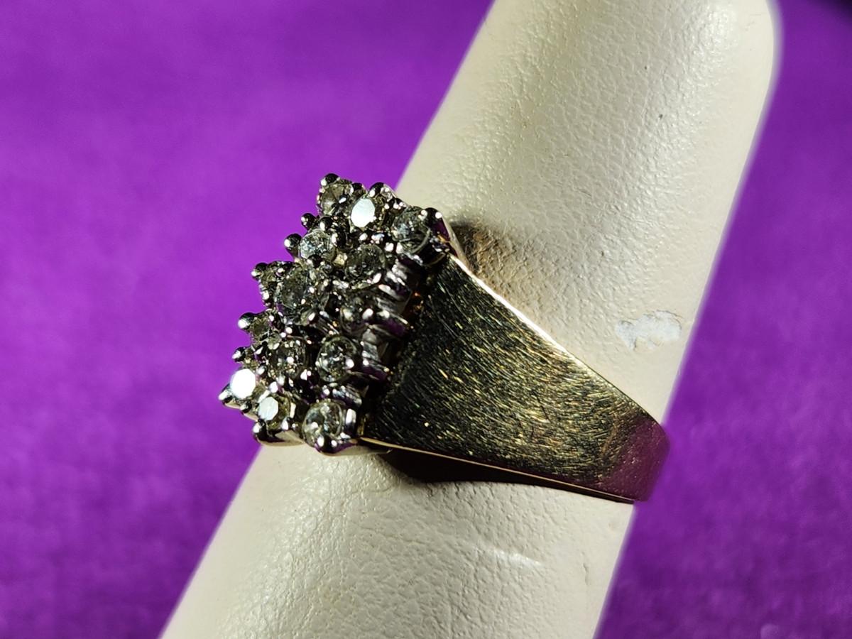 This auction lot is for a 14K Gold Ring with Diamonds. The ring weighs about .170ozt with diamonds. Gems have tested as diamonds but have not been graded. The ring is a size 6.5 and is marked as 14K.