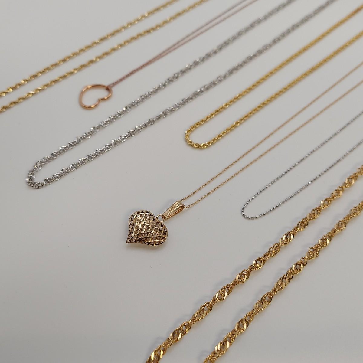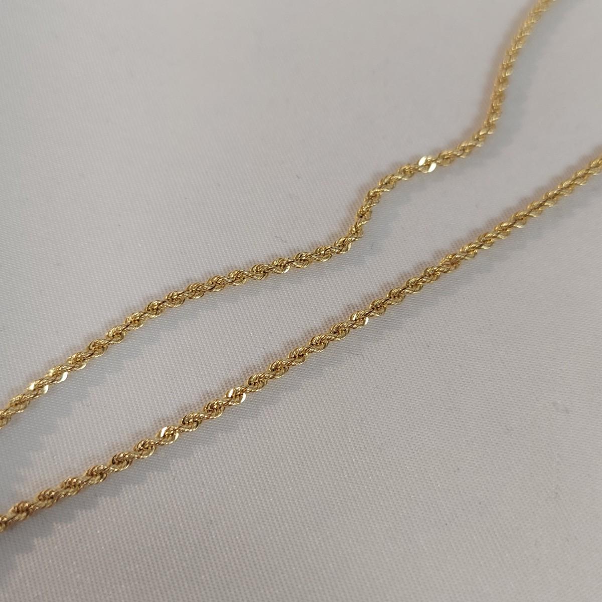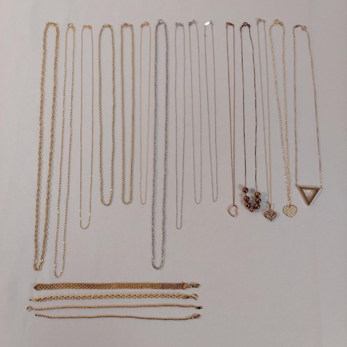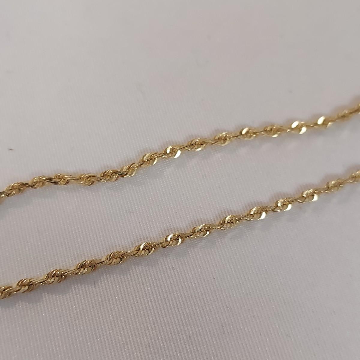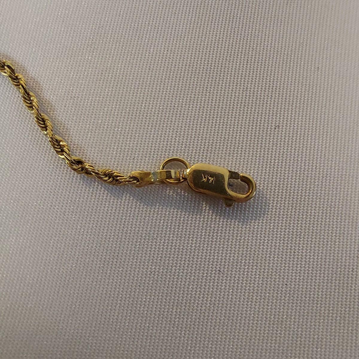 Several 14k gold rope chain necklaces and bracelets. Lot includes 15 necklaces and four bracelets. All pieces are stamped 14k except for the triangle pendant, the beads and two of the heart pendants. Necklaces range from 18-24" long. Please see photos for all markings found. All sales are final. No returns or refunds. Please bid accordingly.