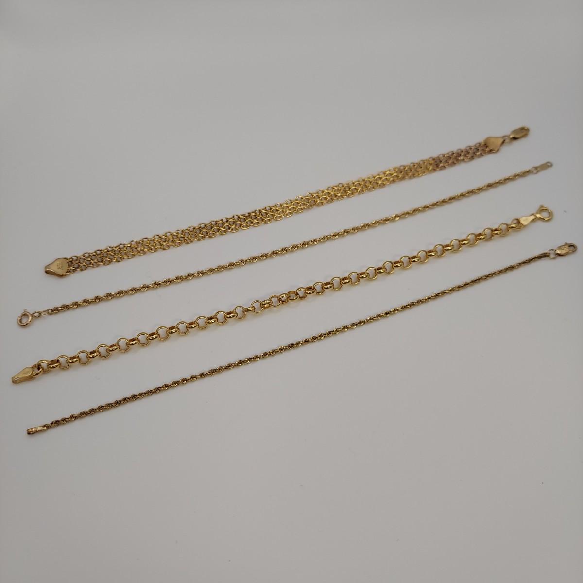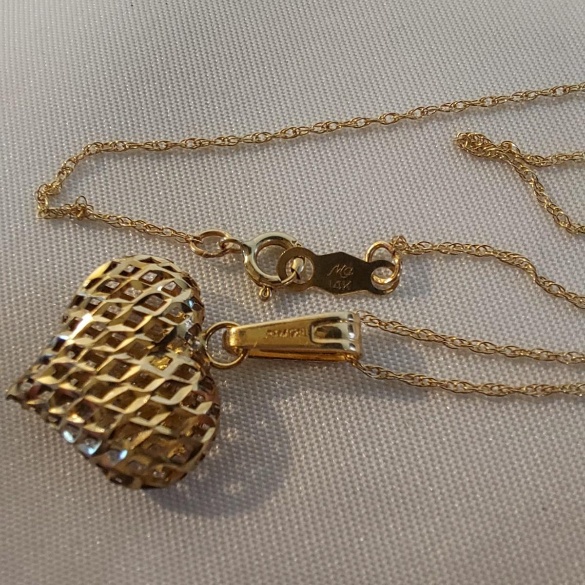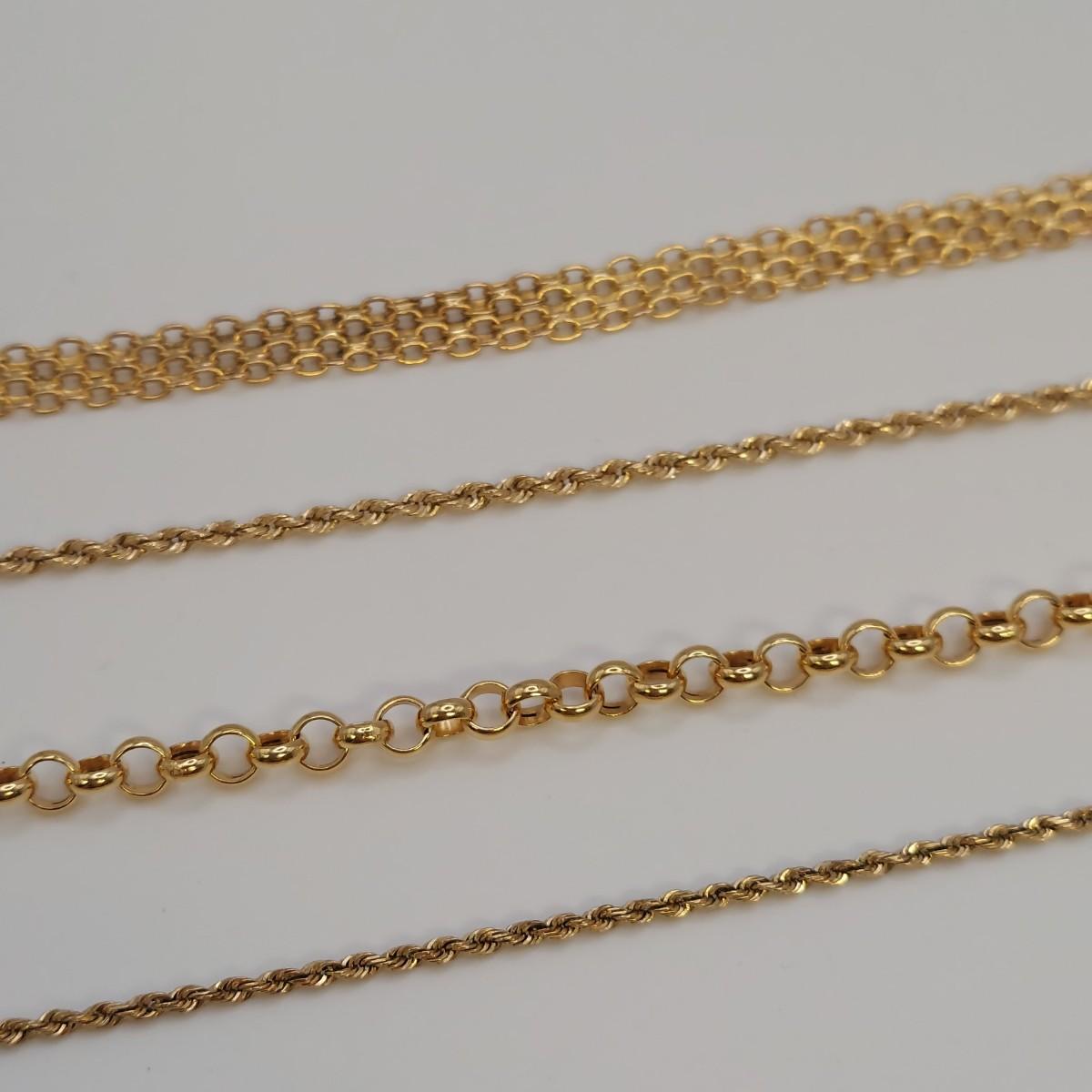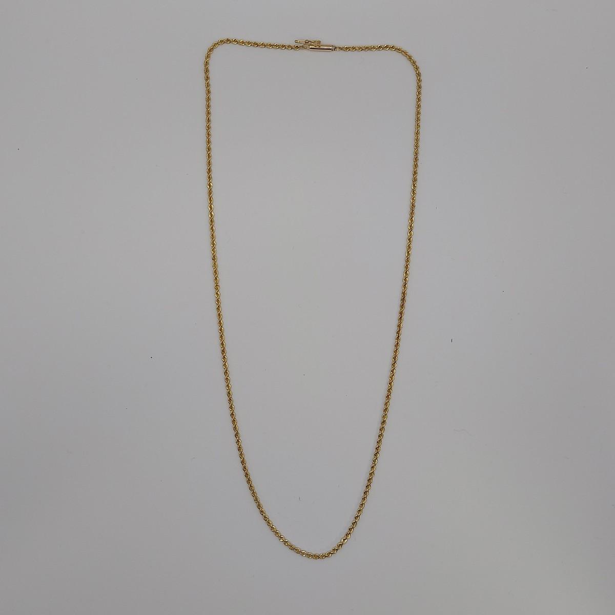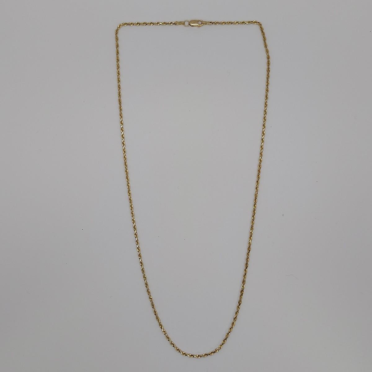 Several 14k gold rope chain necklaces and bracelets. Lot includes 15 necklaces and four bracelets. All pieces are stamped 14k except for the triangle pendant, the beads and two of the heart pendants. Necklaces range from 18-24" long. Please see photos for all markings found. All sales are final. No returns or refunds. Please bid accordingly.