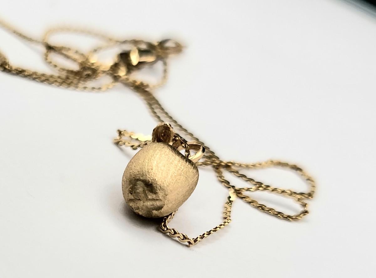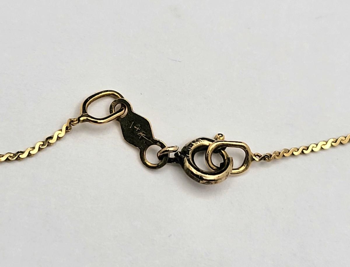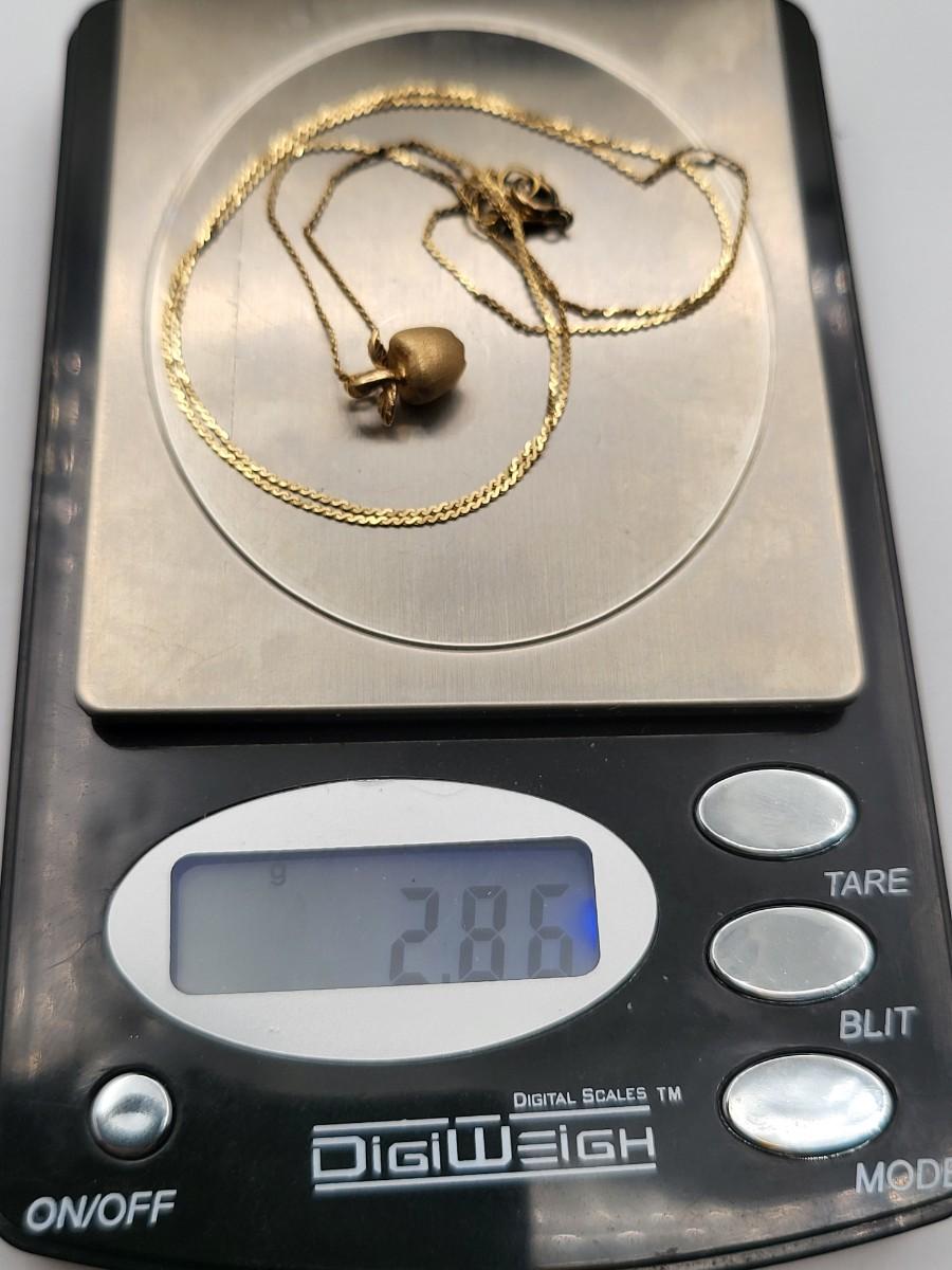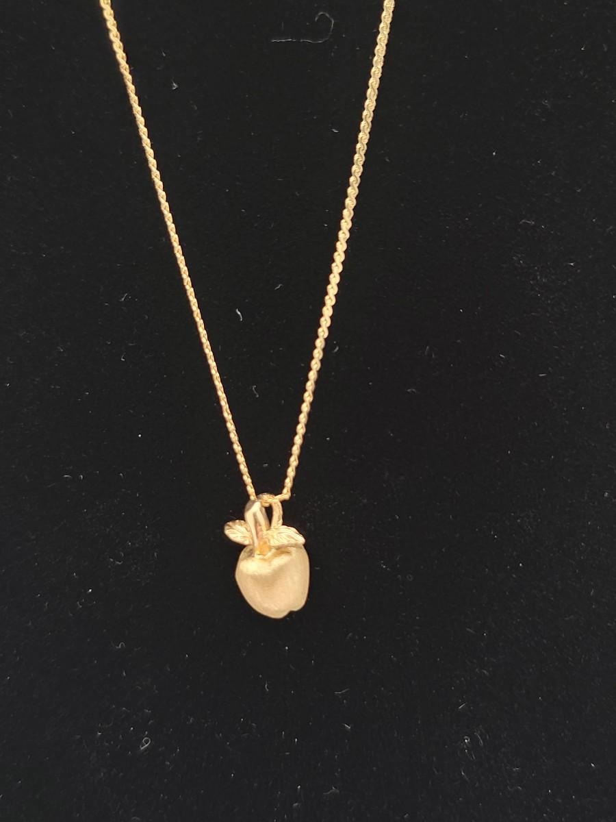The 20" chain is stamped 14k and the dainty satin finish apple (just under .5" tall) is stamped 585 (14k). The marking is hard to see but is on the underside of one of the leaves.