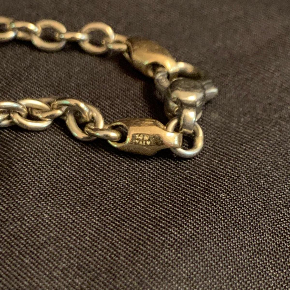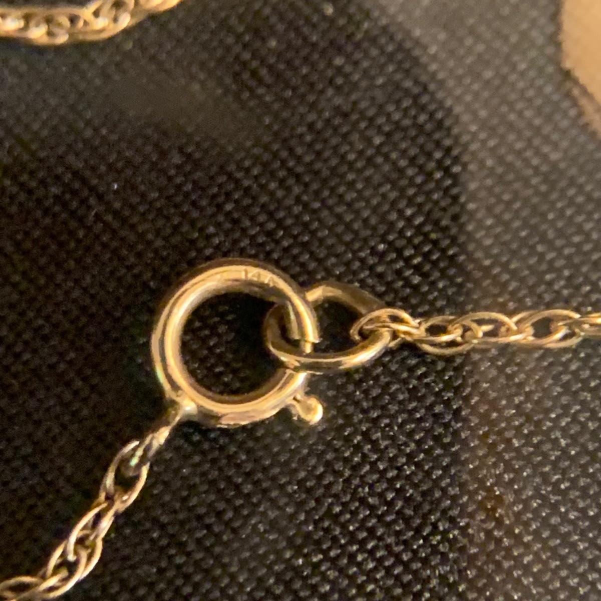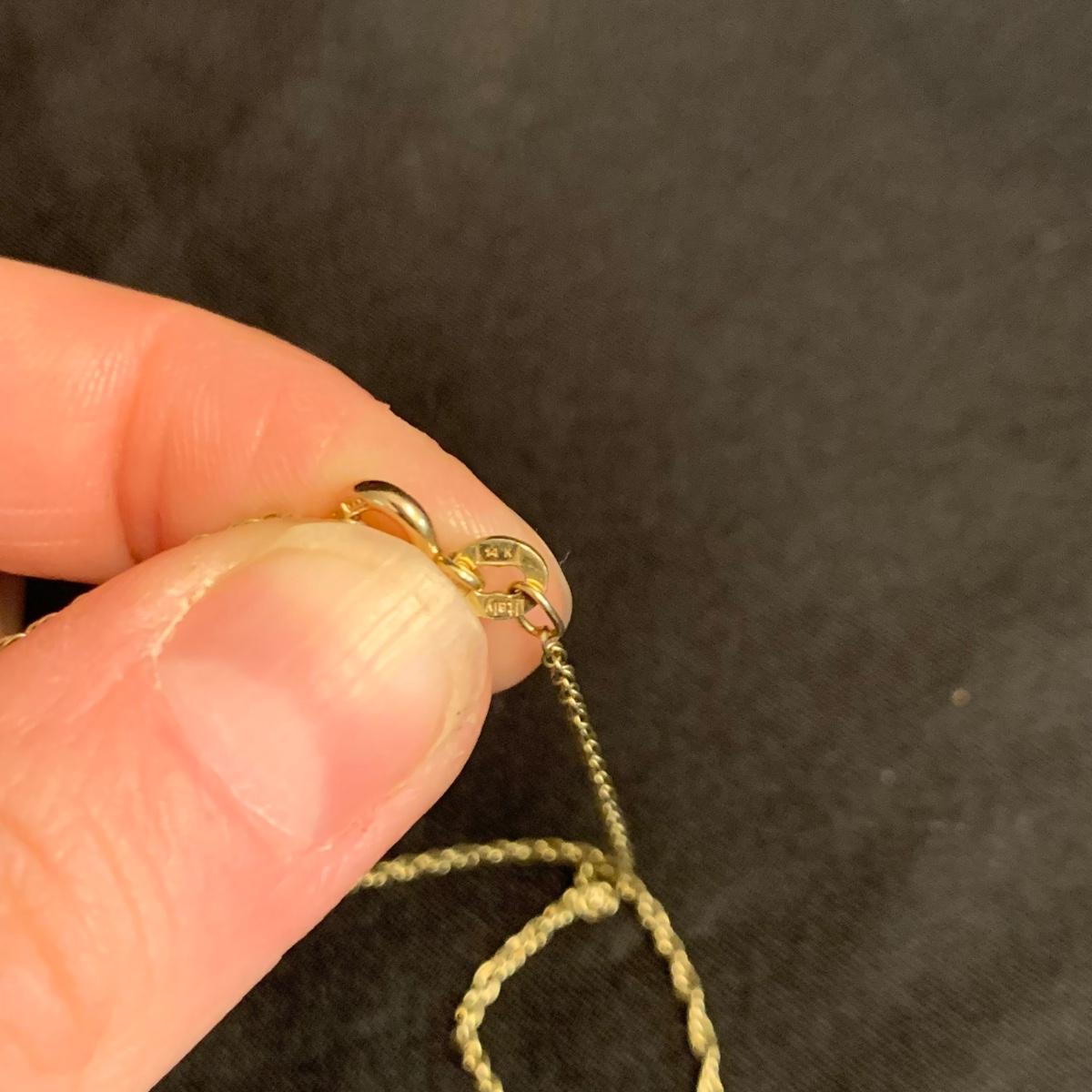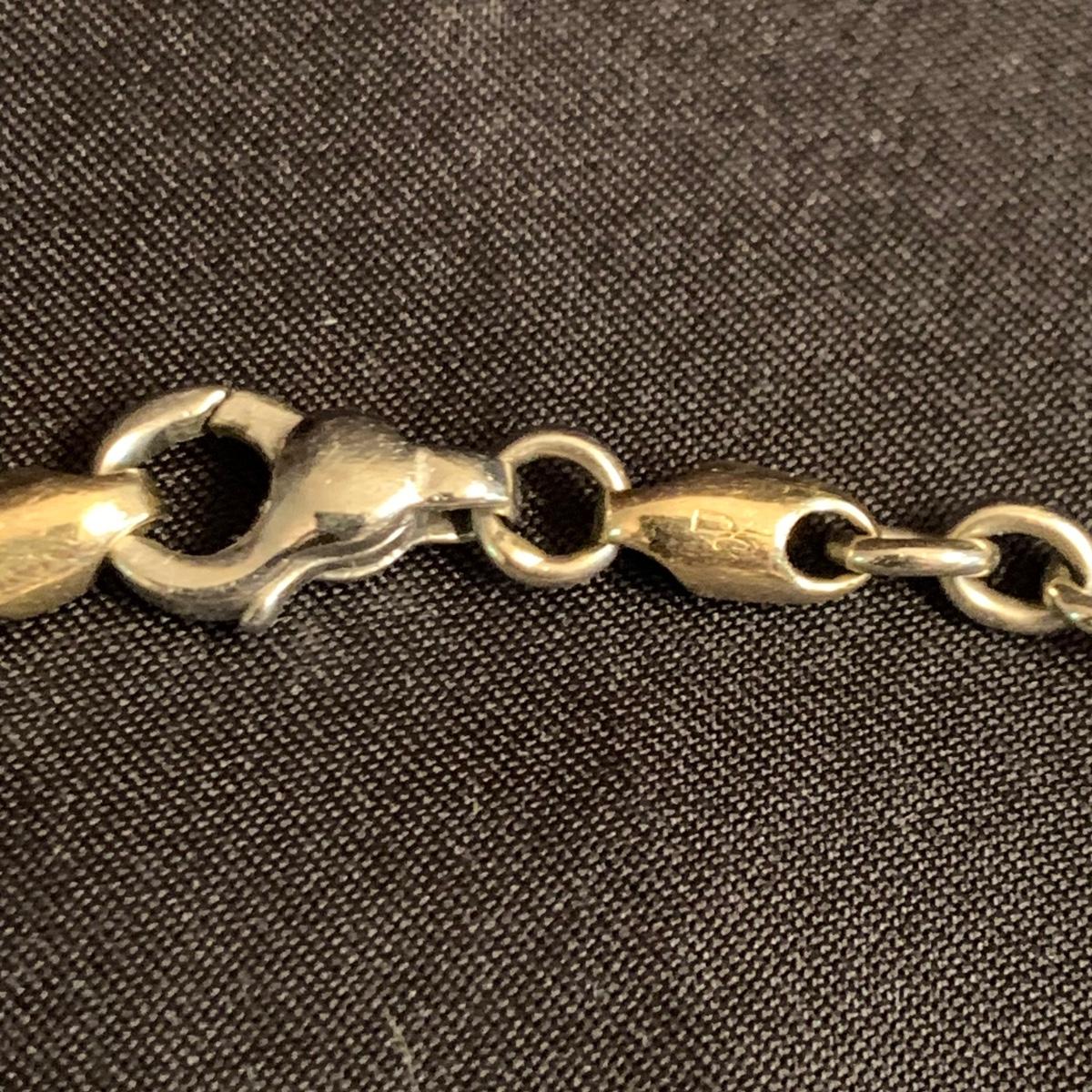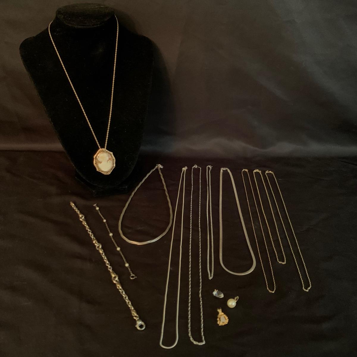 In this lot there are nine necklace chains, two bracelets, and four pendants. There are three chains marked “˜14K’ and four marked “˜925’ or “˜Sterling’. One silver and one gold necklace do not have visible marks. The chain bracelet is marked 14K and 585; it is 8.5” long. The small bracelet with the pearly beads is marked Sterling; it is 5.5” long. No marks are seen on the pendants. The two longest Sterling chains are 24“ and the shortest Sterling chain that has three strands wrapped around each other is 16”.