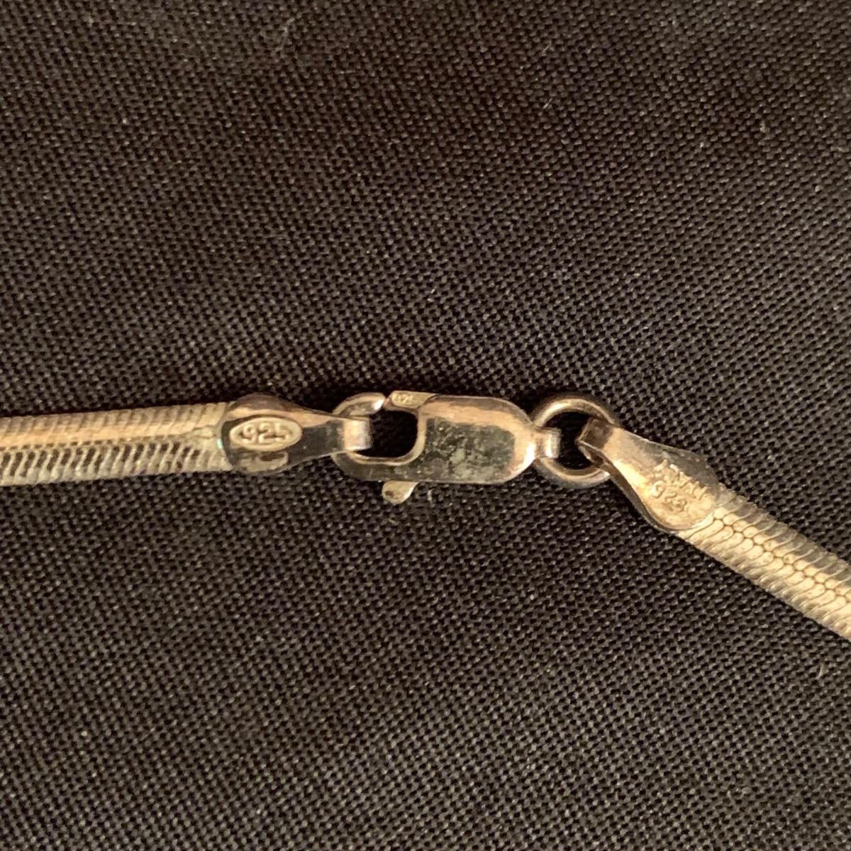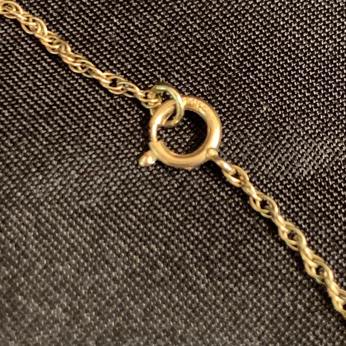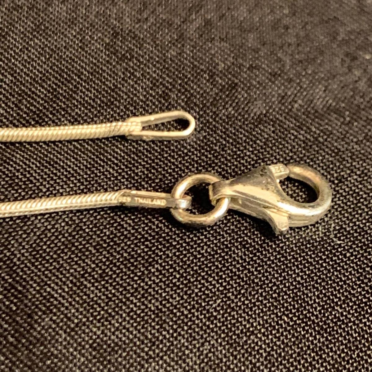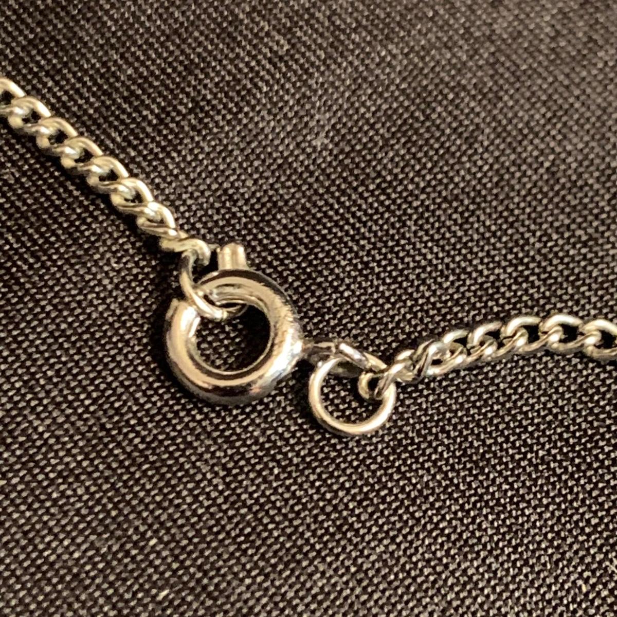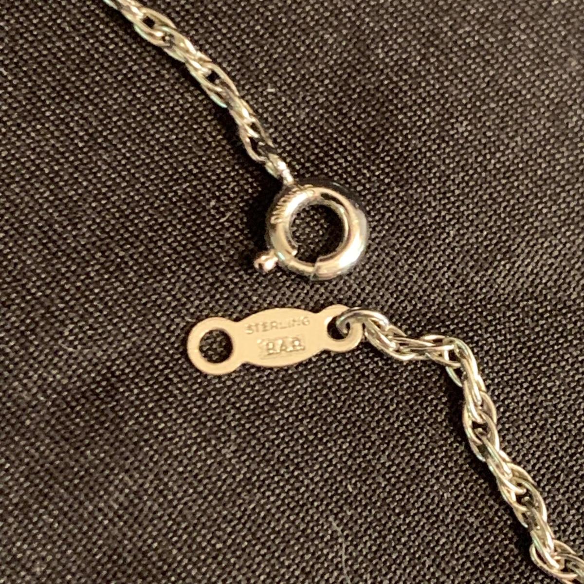 In this lot there are nine necklace chains, two bracelets, and four pendants. There are three chains marked “˜14K’ and four marked “˜925’ or “˜Sterling’. One silver and one gold necklace do not have visible marks. The chain bracelet is marked 14K and 585; it is 8.5” long. The small bracelet with the pearly beads is marked Sterling; it is 5.5” long. No marks are seen on the pendants. The two longest Sterling chains are 24“ and the shortest Sterling chain that has three strands wrapped around each other is 16”.