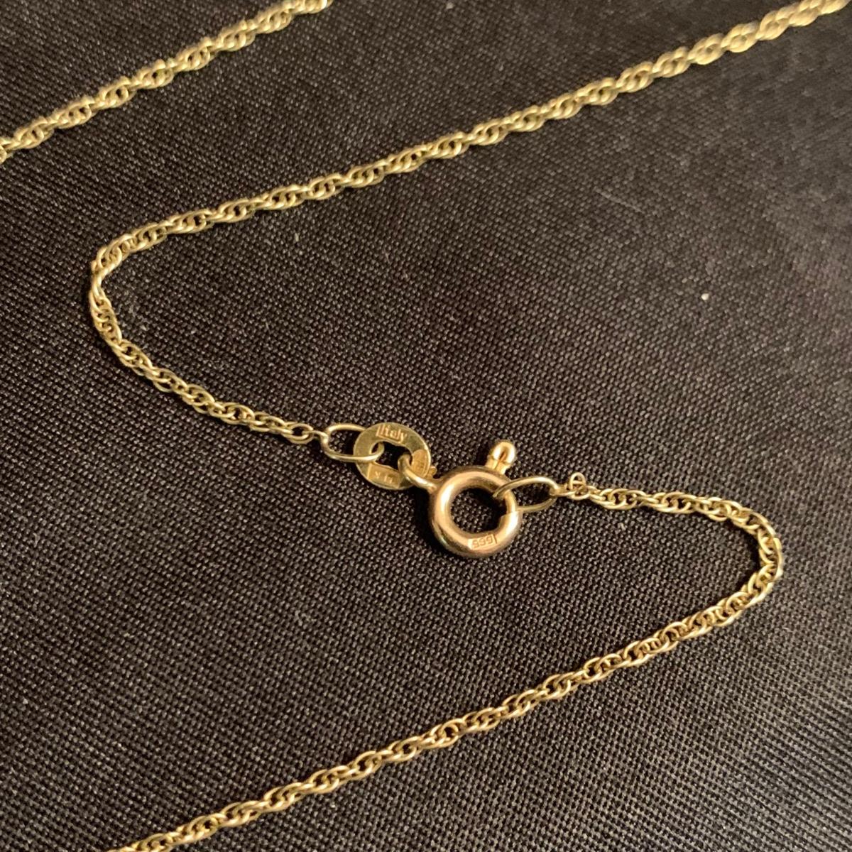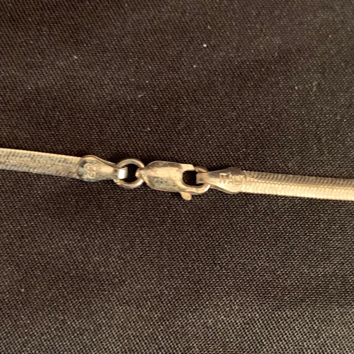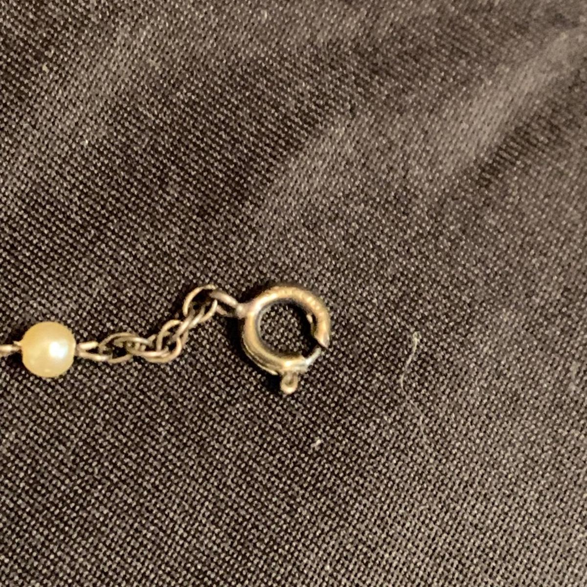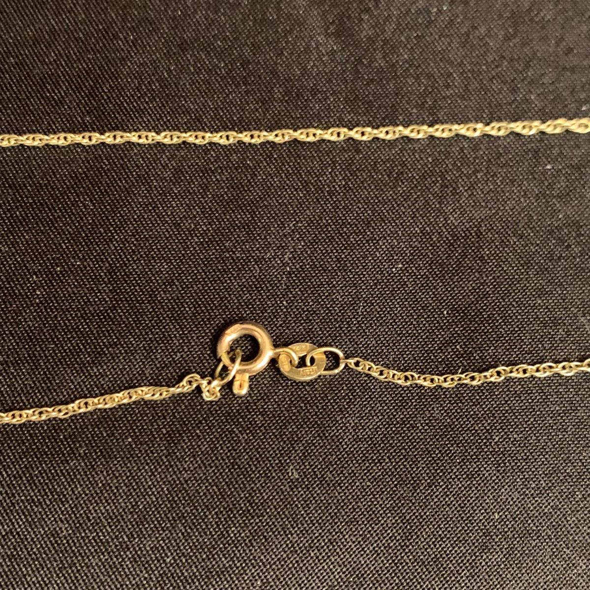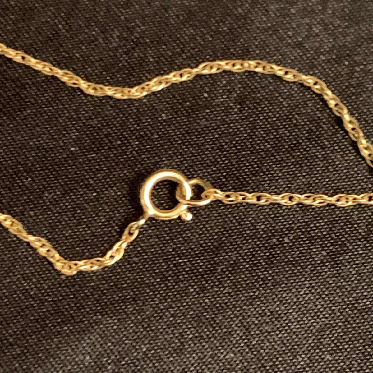 In this lot there are nine necklace chains, two bracelets, and four pendants. There are three chains marked “˜14K’ and four marked “˜925’ or “˜Sterling’. One silver and one gold necklace do not have visible marks. The chain bracelet is marked 14K and 585; it is 8.5” long. The small bracelet with the pearly beads is marked Sterling; it is 5.5” long. No marks are seen on the pendants. The two longest Sterling chains are 24“ and the shortest Sterling chain that has three strands wrapped around each other is 16”.