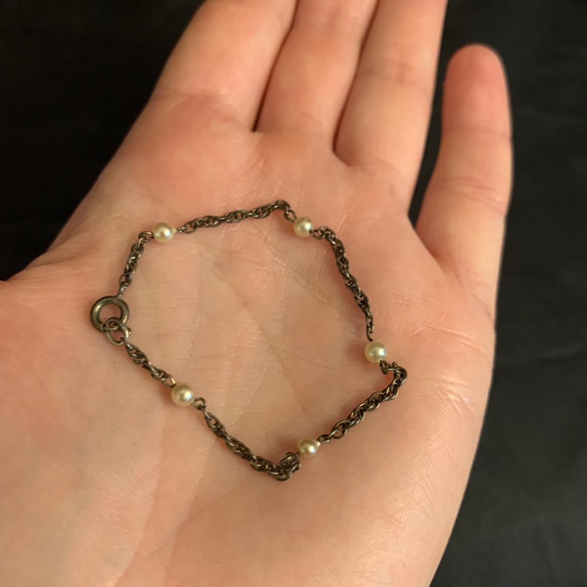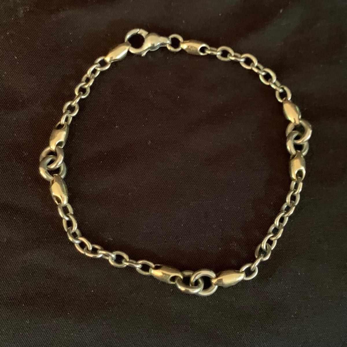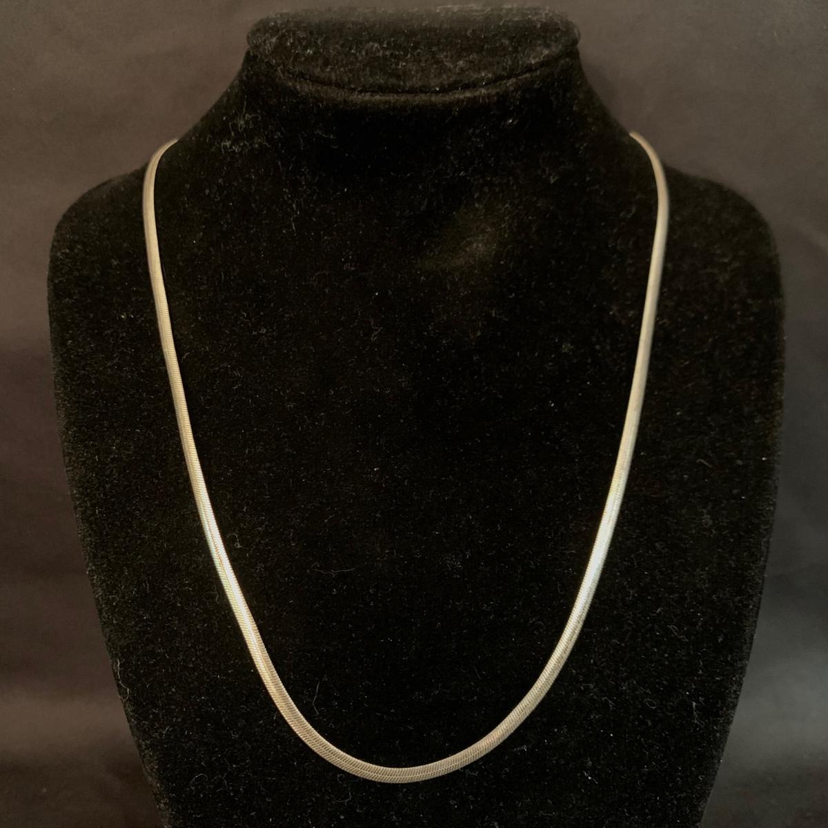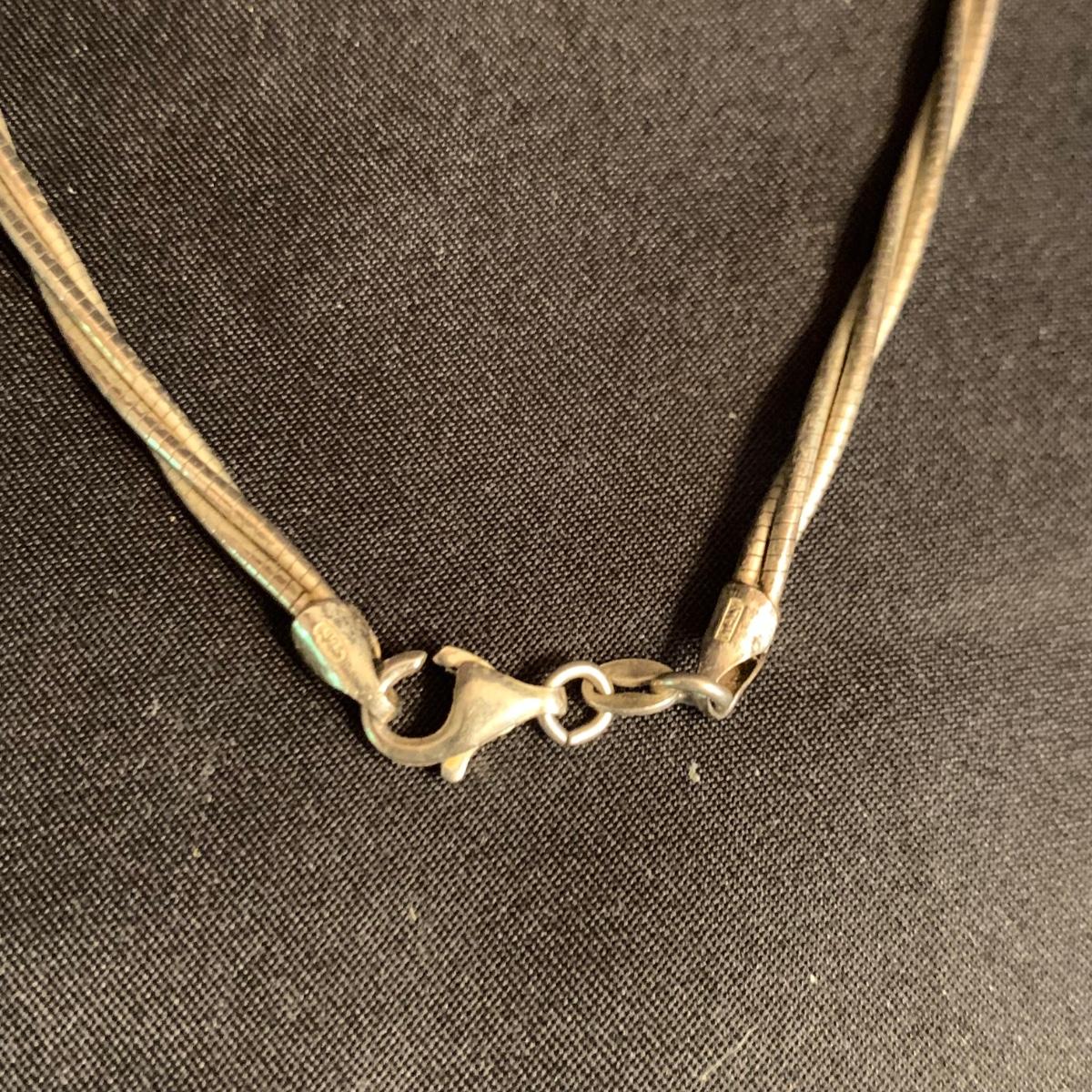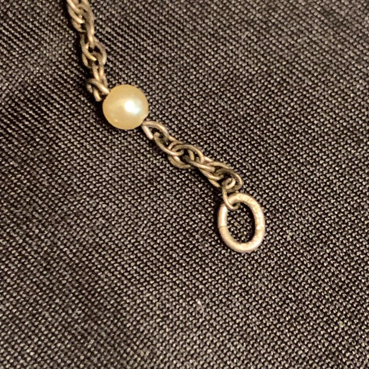 In this lot there are nine necklace chains, two bracelets, and four pendants. There are three chains marked “˜14K’ and four marked “˜925’ or “˜Sterling’. One silver and one gold necklace do not have visible marks. The chain bracelet is marked 14K and 585; it is 8.5” long. The small bracelet with the pearly beads is marked Sterling; it is 5.5” long. No marks are seen on the pendants. The two longest Sterling chains are 24“ and the shortest Sterling chain that has three strands wrapped around each other is 16”.