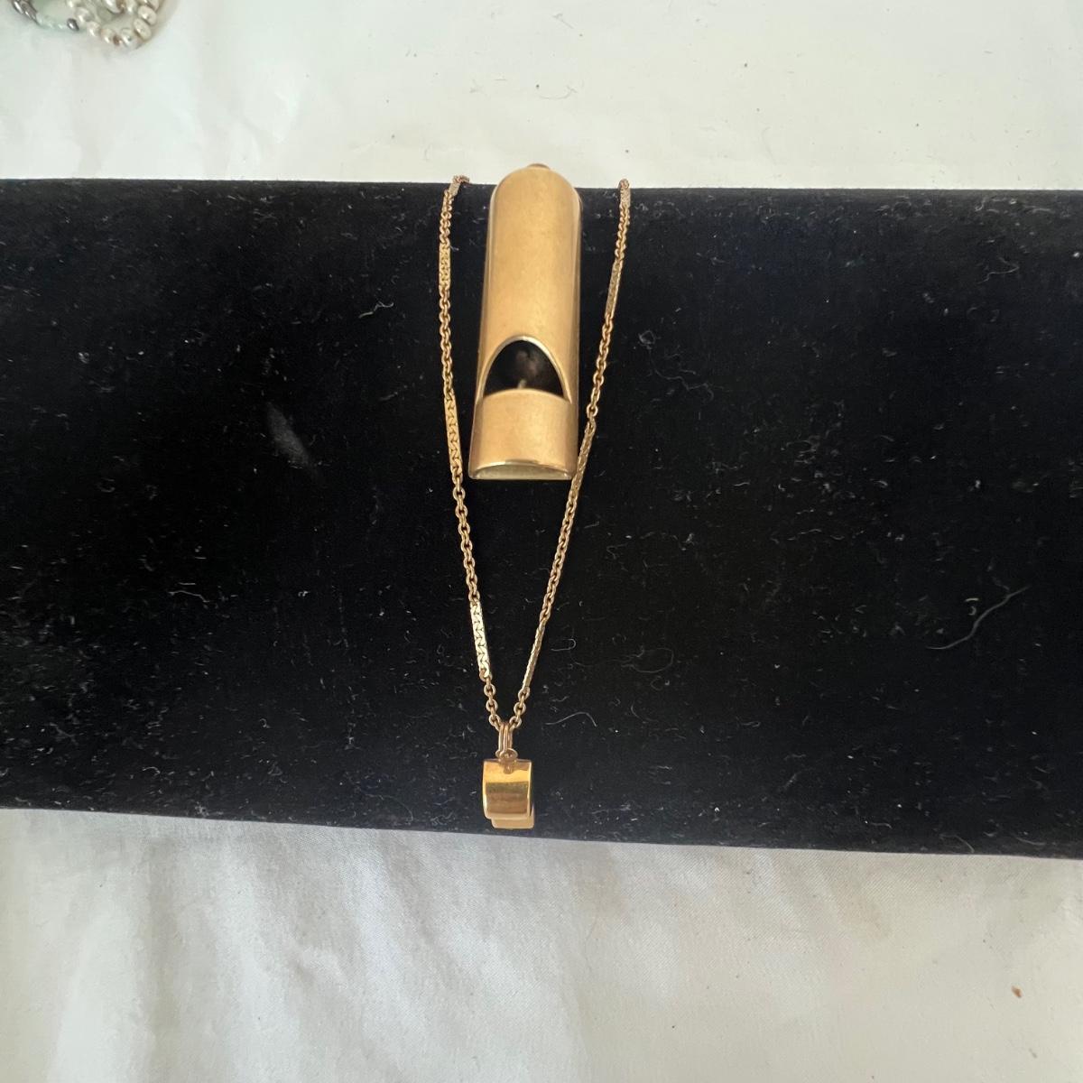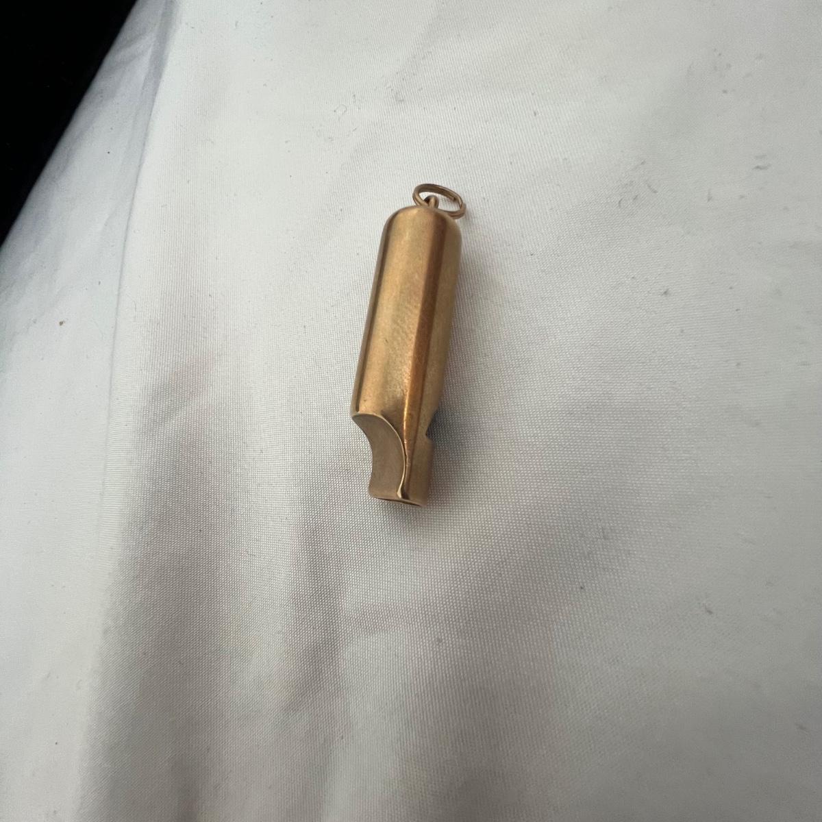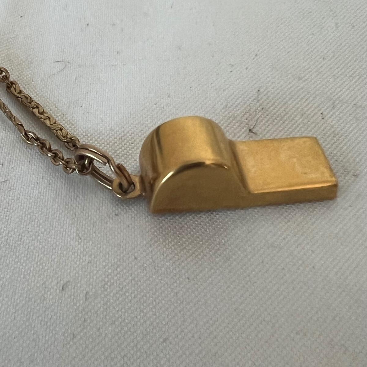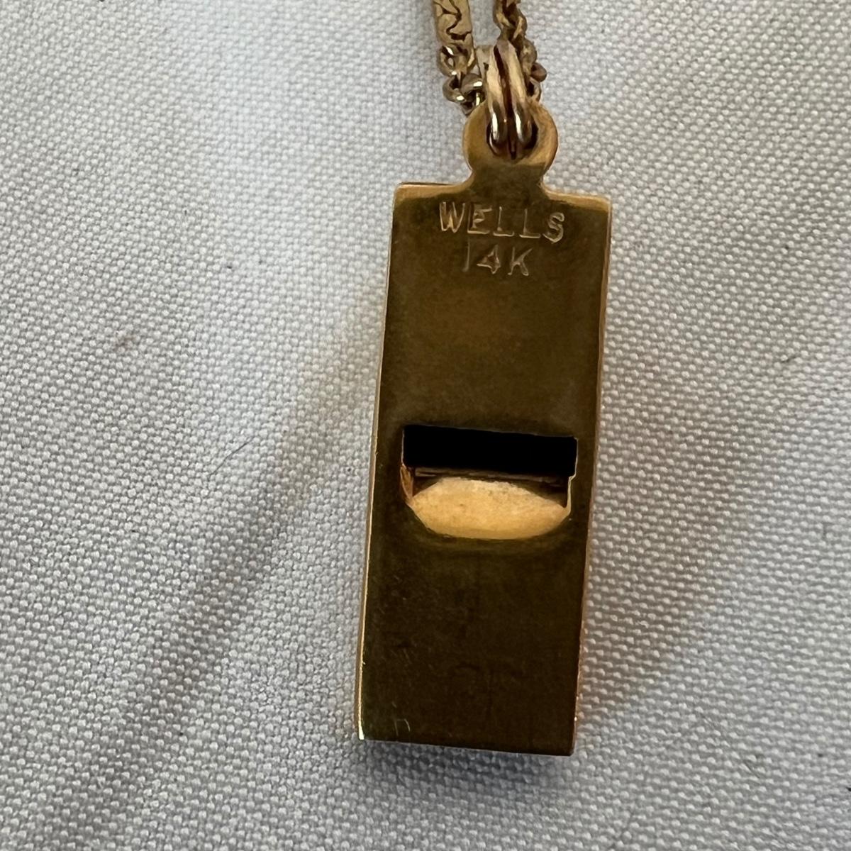 Two gold whistles that are both marked 14K. They both are working whistles; the larger whistle produces a strong sound and measures approximately 0.5” x 1.5”. The smaller whistle is on a 12K gold plated chain which measures 24” long.