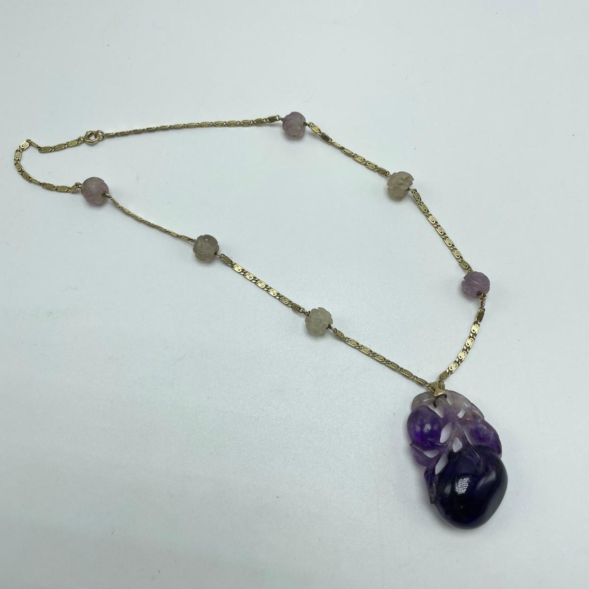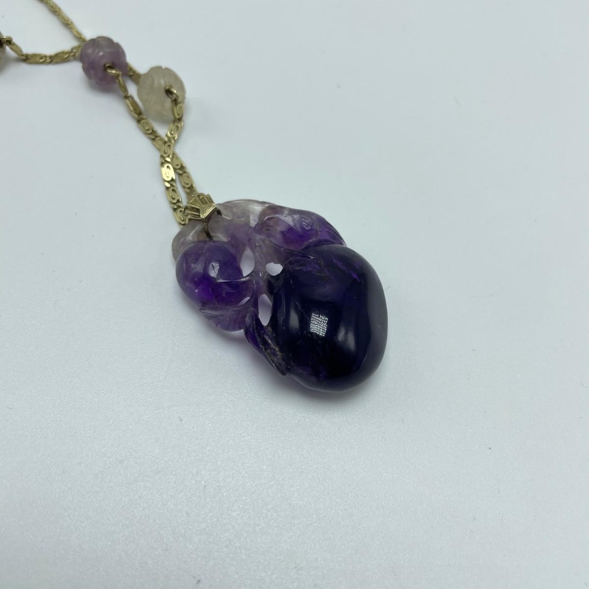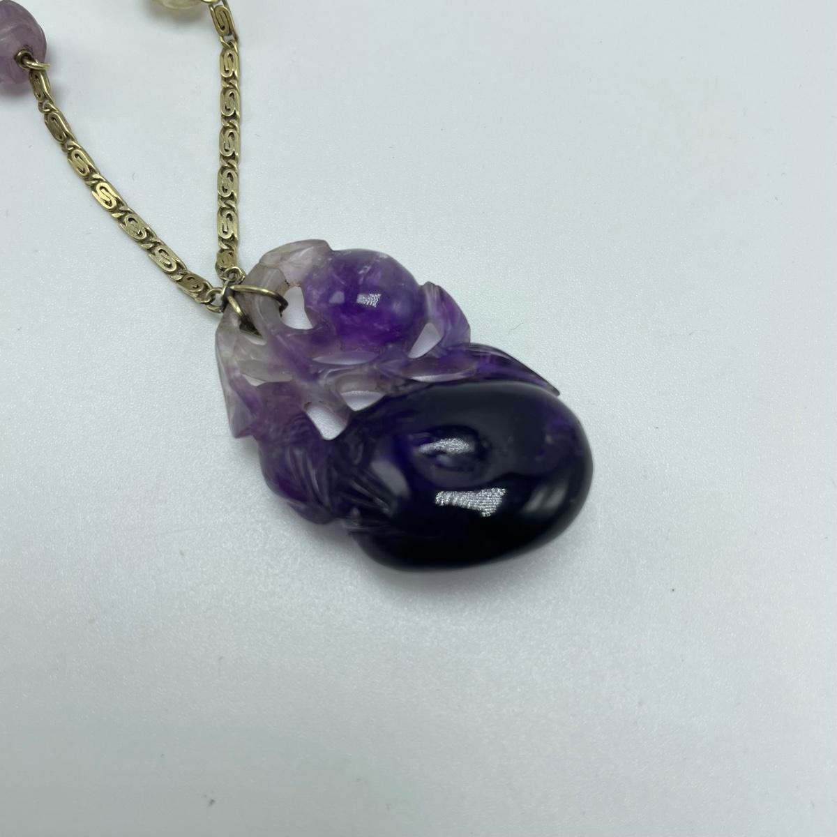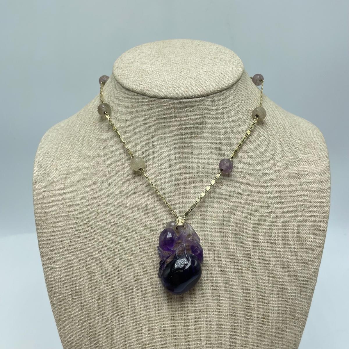 Stunning carved amethyst pendant with beads on a chain stamped 14K. The pendant has intricate details including a bird and branch. See images. Starting bid is at or near melt value. All sales are final. No returns or refunds. Please bid accordingly.