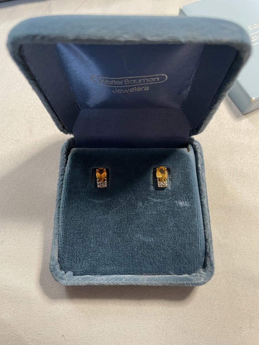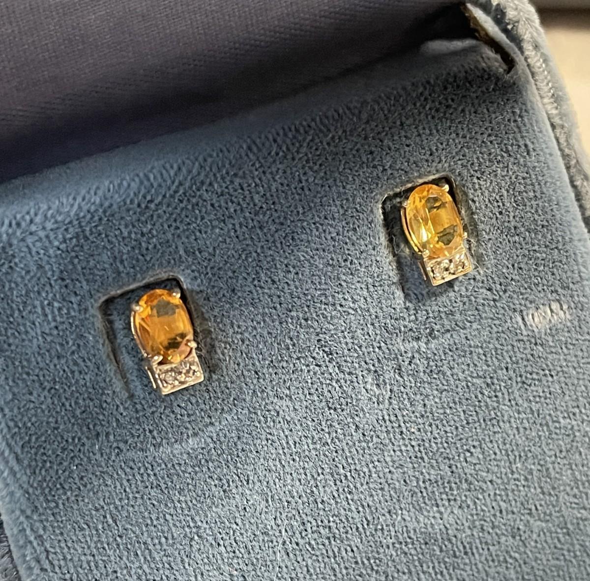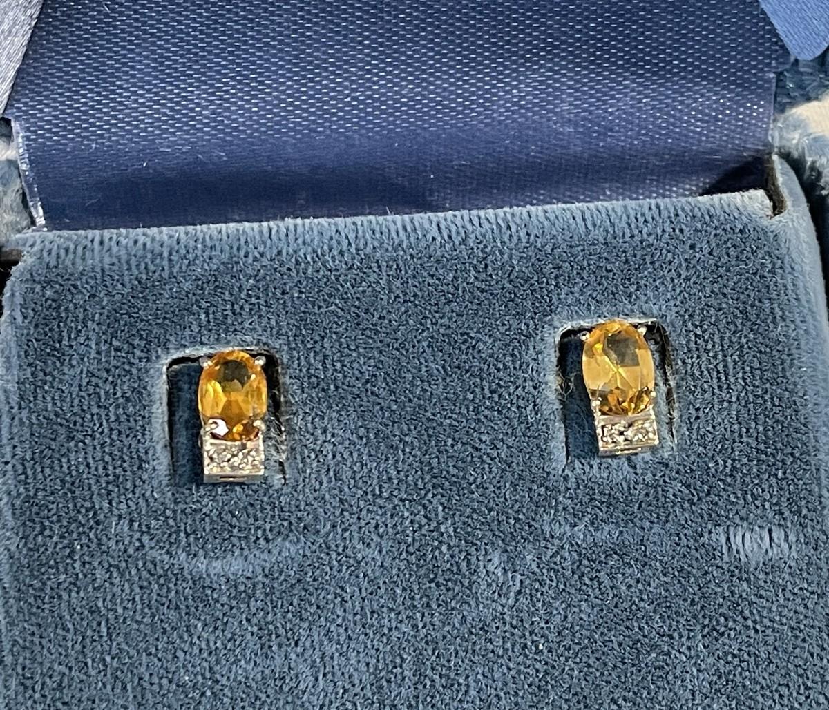 These earrings are not marked, but we tested them and they tested positive for 14K gold and the small chip at the bottom tested positive for diamond. We believe that the main stone is something like citrine or topaz. Beautifule pair of earrings that could be worn with a casual outfit or to dress up for a formal occasion.