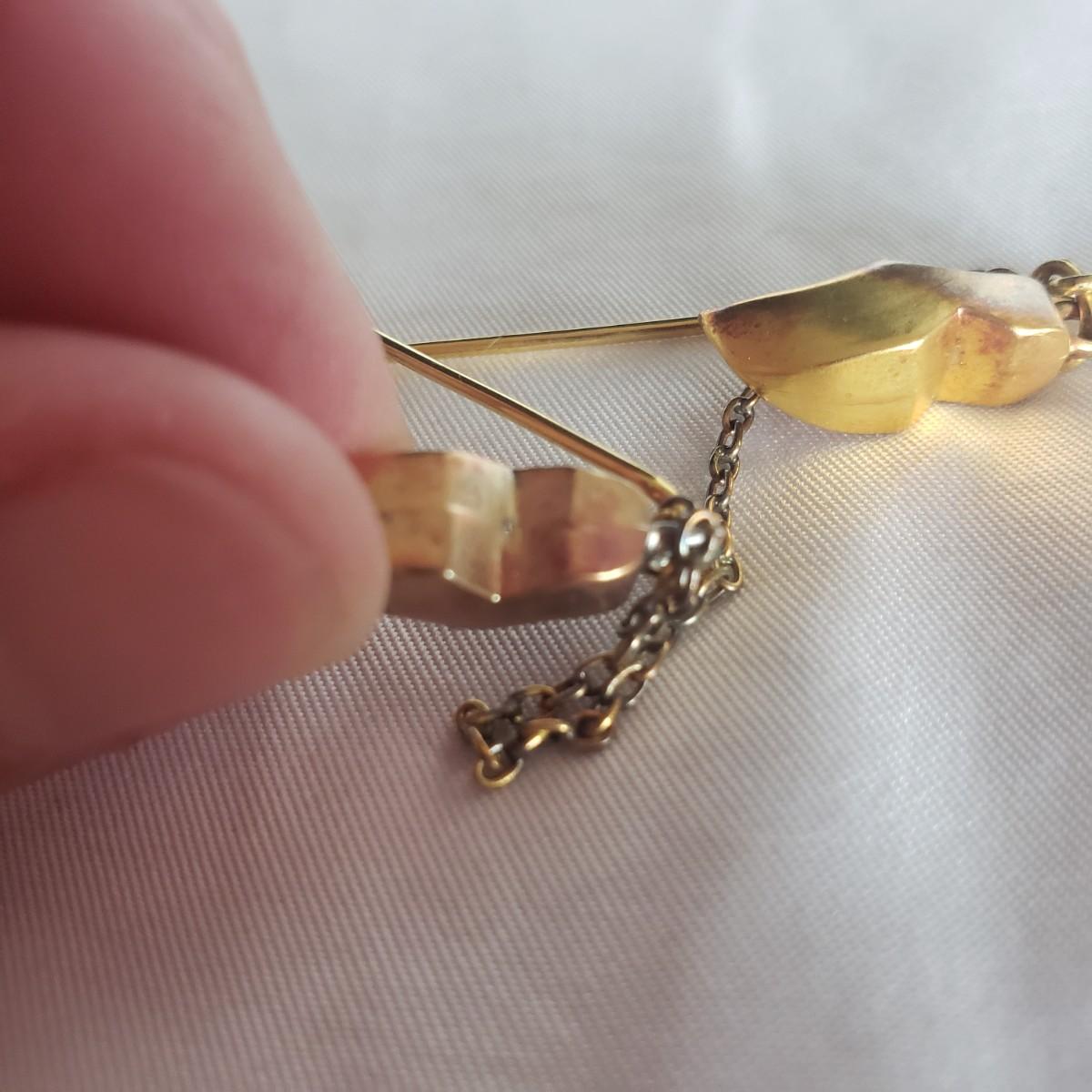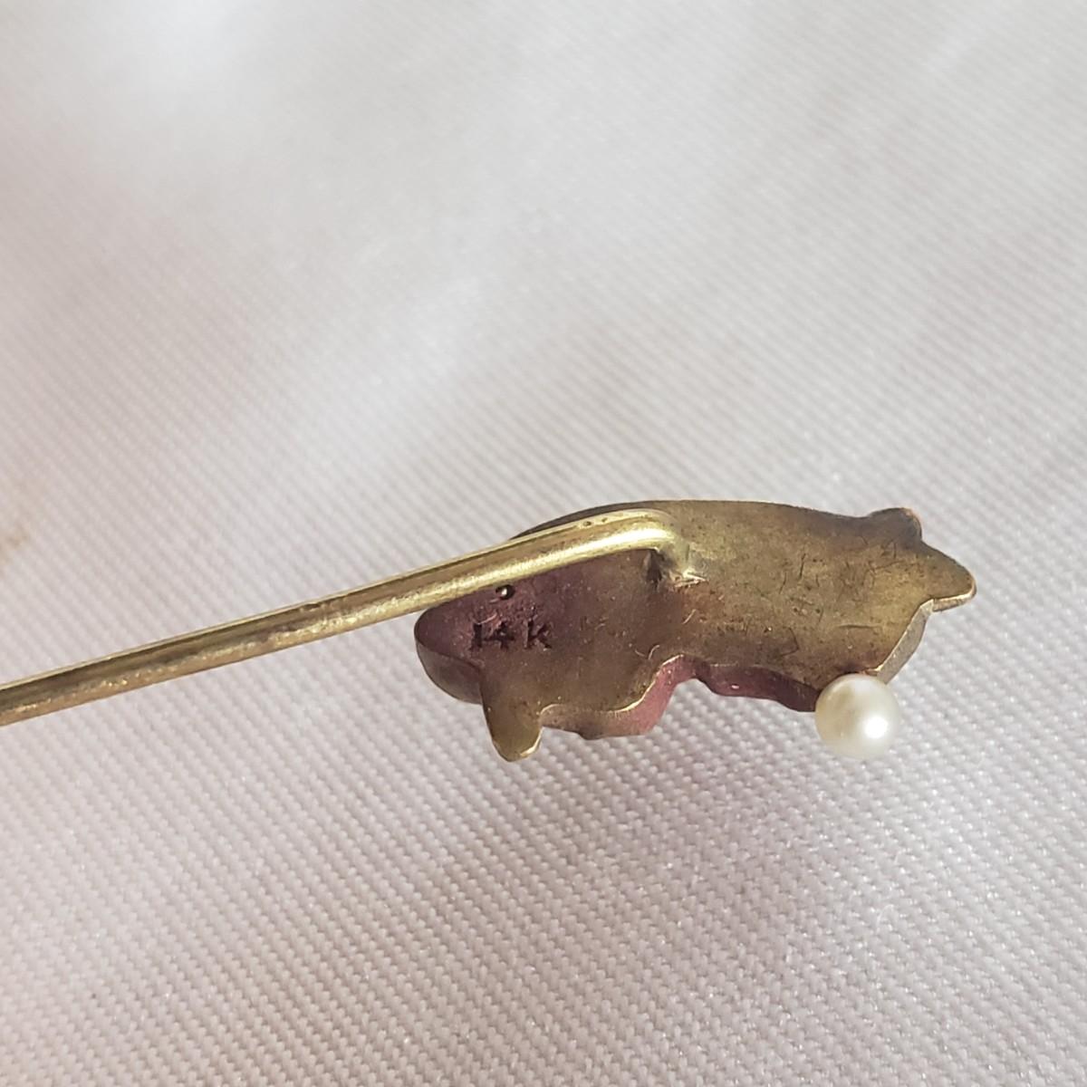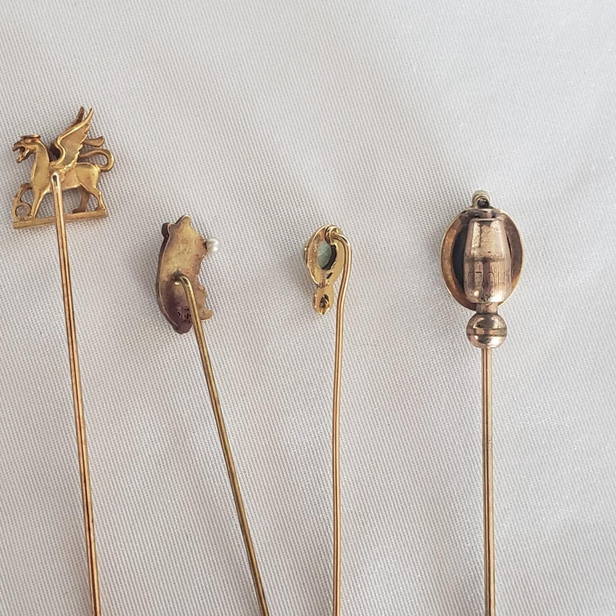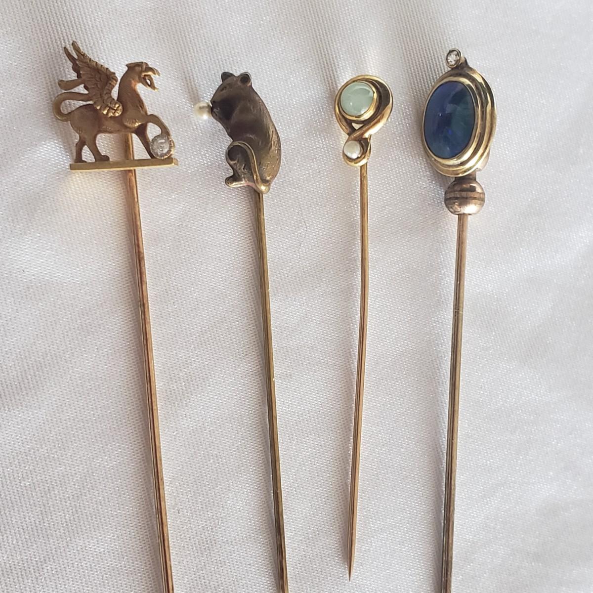 This eight pin lot will dazzle your coat or shirt! The first four pins, are stamped 14K and tested negative for diamonds on the blue oval pin and the Griffin. The mouse pin appears to be holding a pearl like morsel. The light green stone swirls into a pearl like smaller stone. The clog pins do not have any markings. The two clogs are connected with a chain. The last three pins do not have any markings. The oblong red stone measures 2".