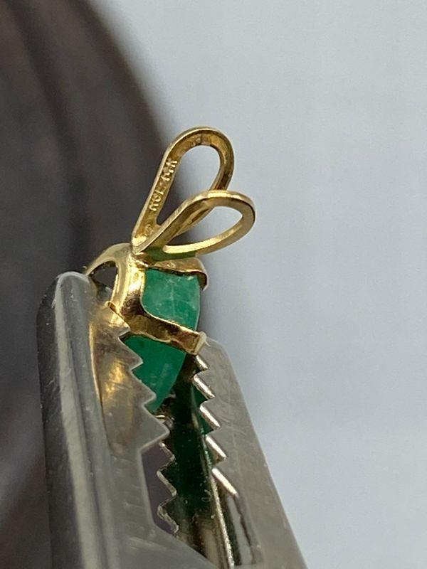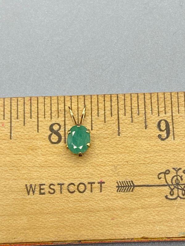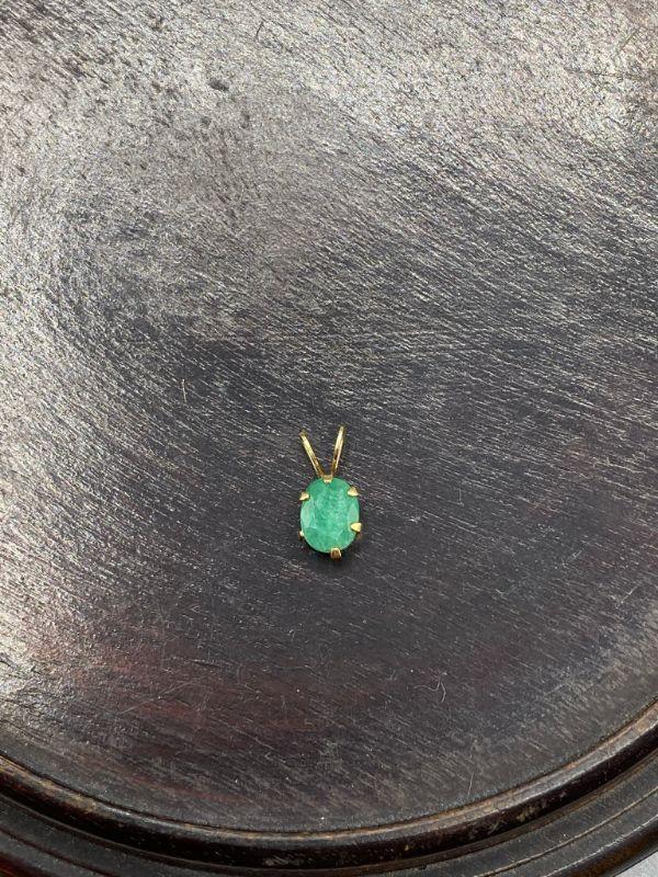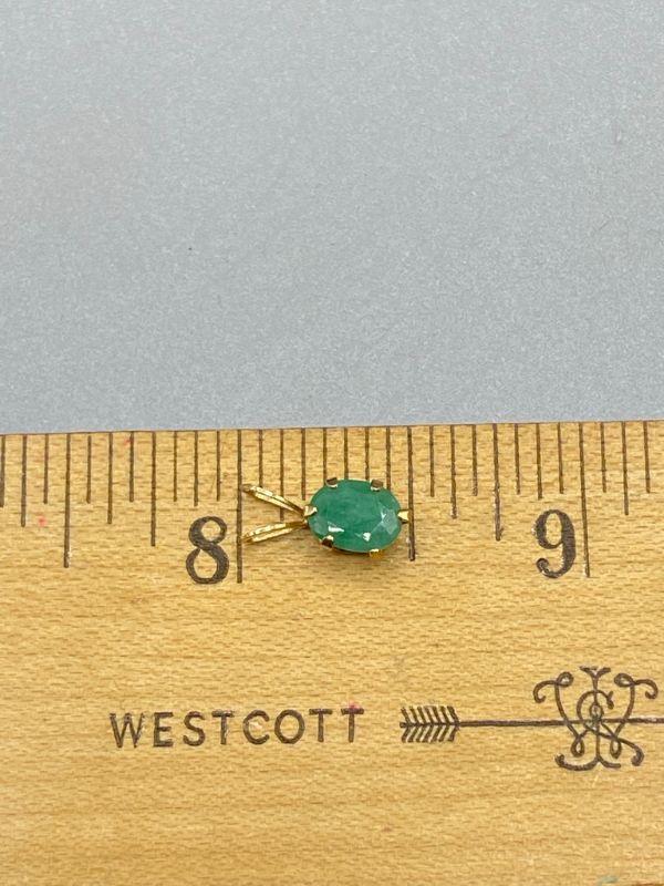 Small and simple 14k yellow gold and cut jadeite pendant. Stamped in the loop. Oval shape with faceted sides. Under 1/4" size.