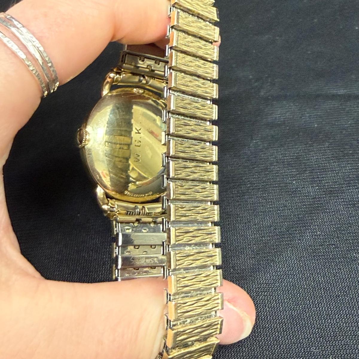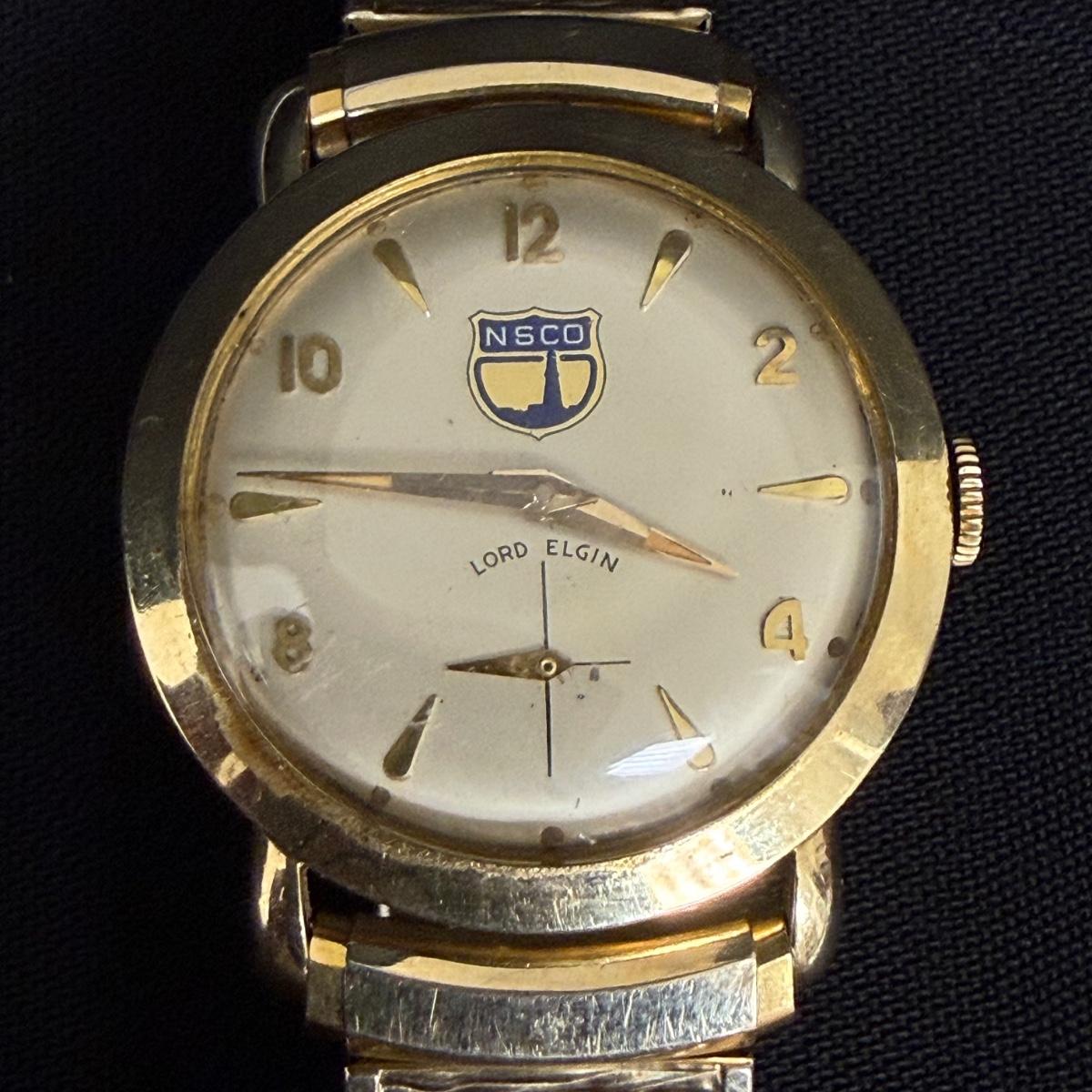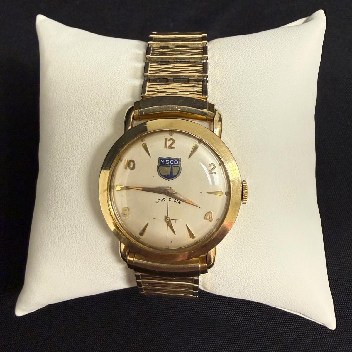 This Lord Elgin wrist watch is marked 14 karat gold and has a stretch band. It features a logo that reads NSCO. Watch is not currently ticking/keeping time.