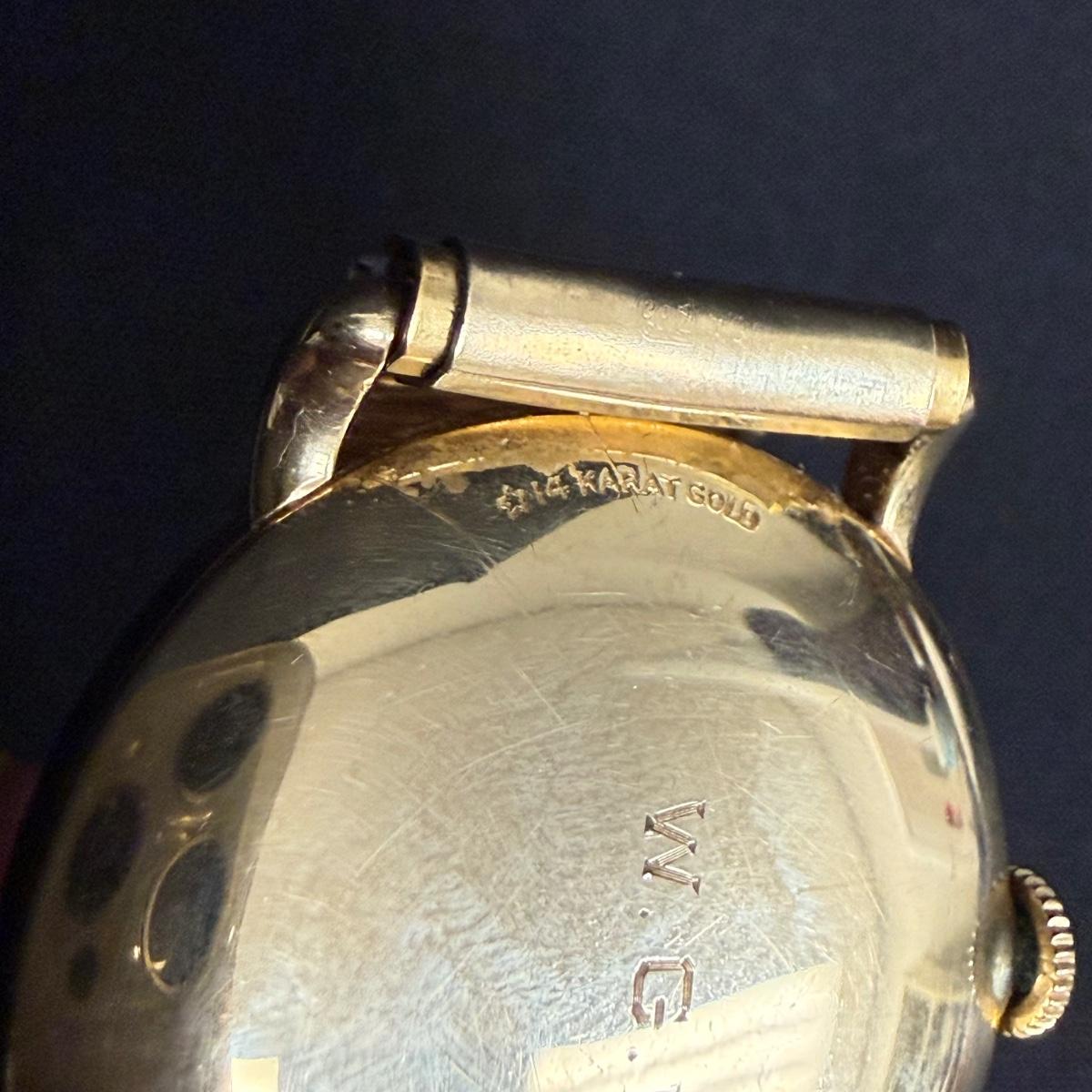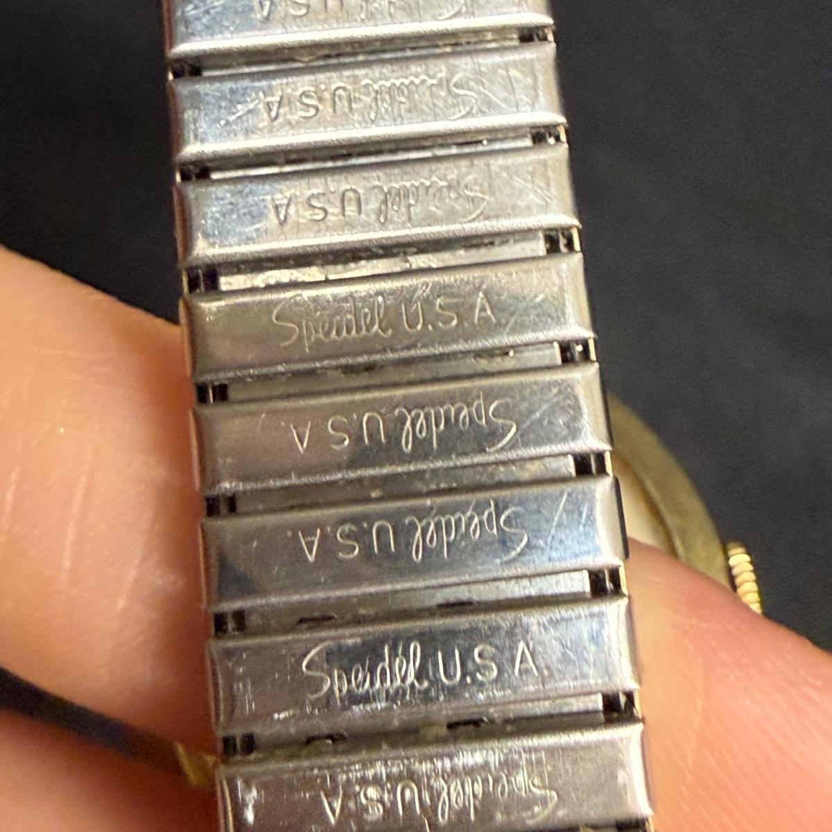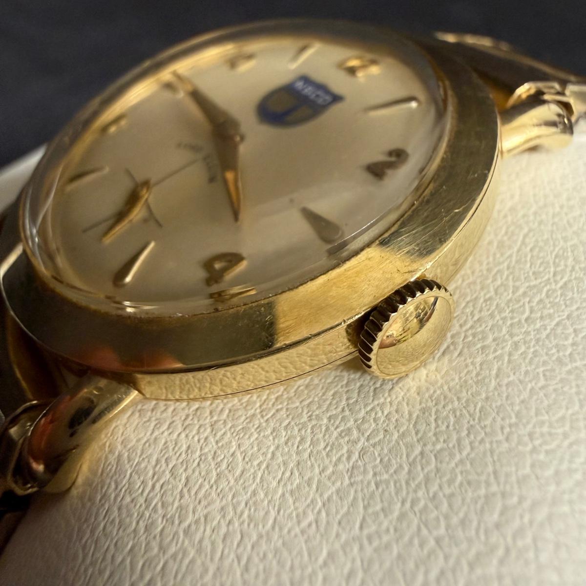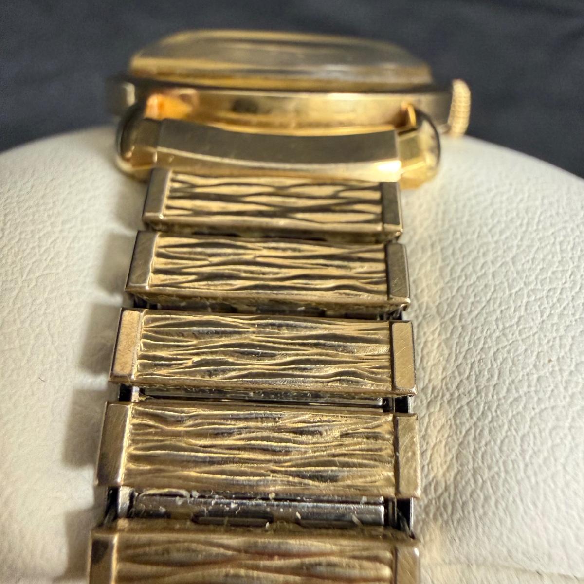 This Lord Elgin wrist watch is marked 14 karat gold and has a stretch band. It features a logo that reads NSCO. Watch is not currently ticking/keeping time.