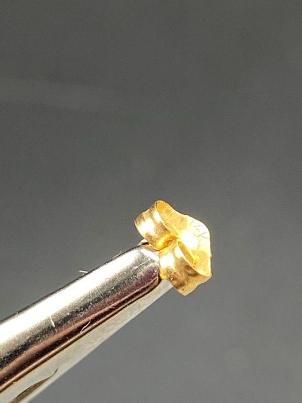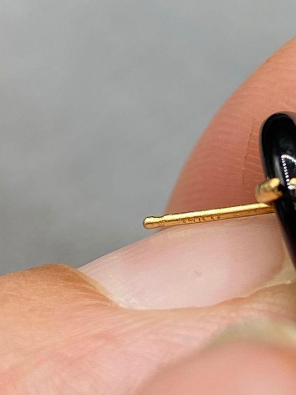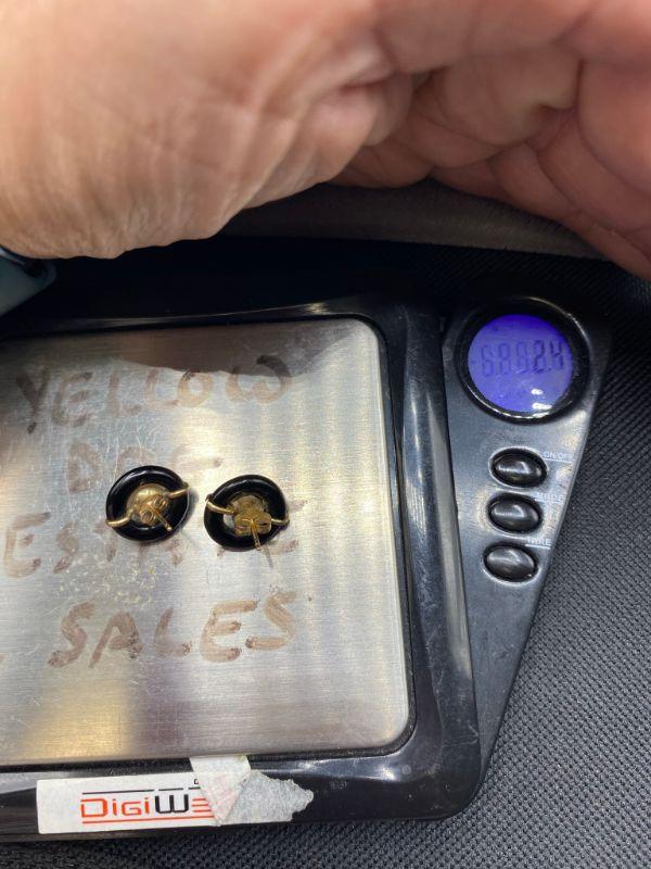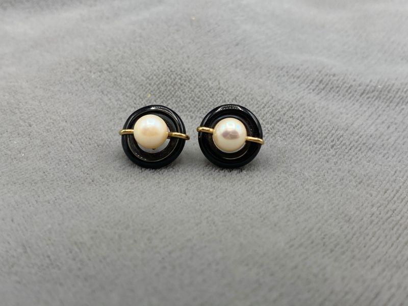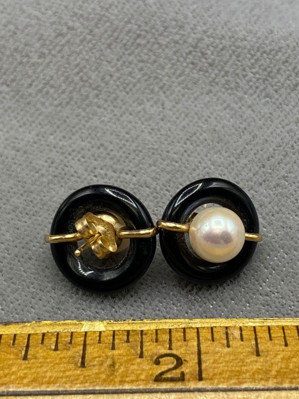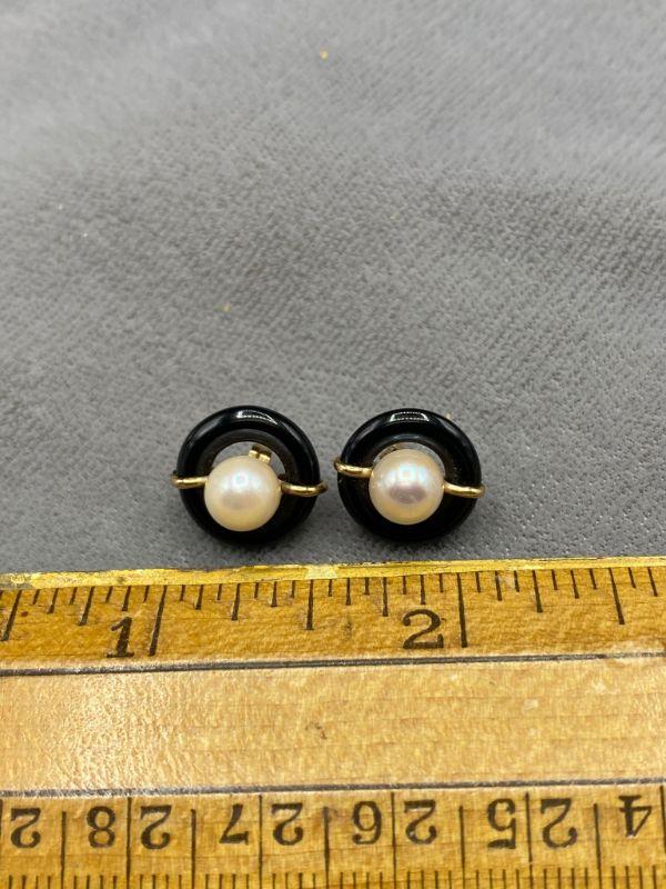 14k onyx and pearl earrings. Yellow gold setting allows the pearl to float in the center of the onyx ring. There is a split in the gold on the side of one earring. Stamped on the post and the earring backs. About 1/2" size.