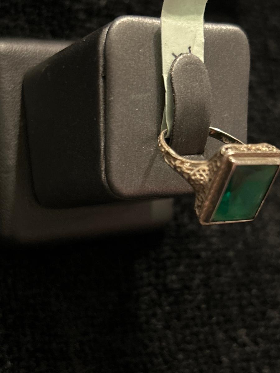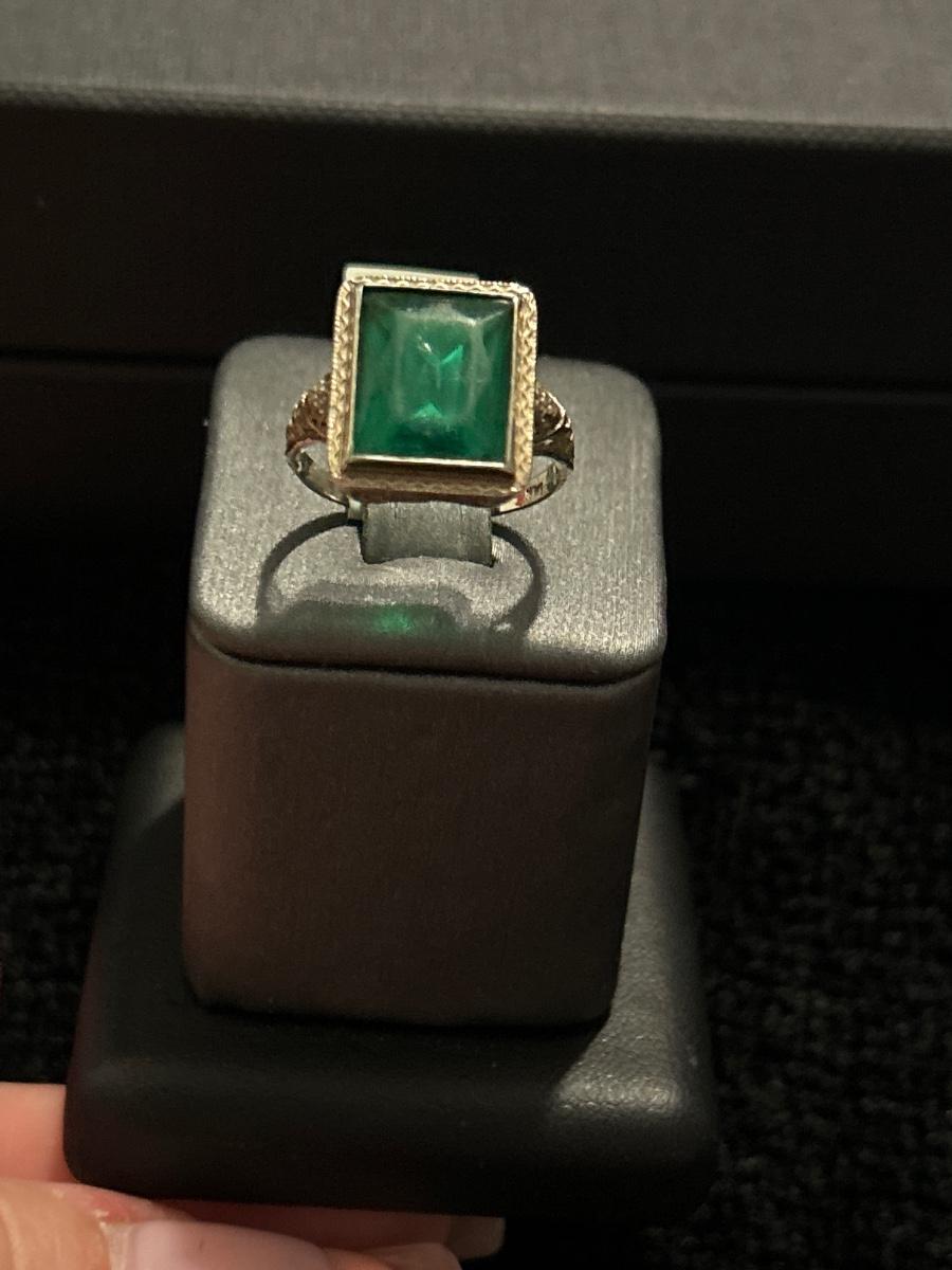 14k white gold vintage, art deco ring with side detail, the center stone is a little loose, very detailed on the sides. I am not sure if it is a genuine emerald or no.