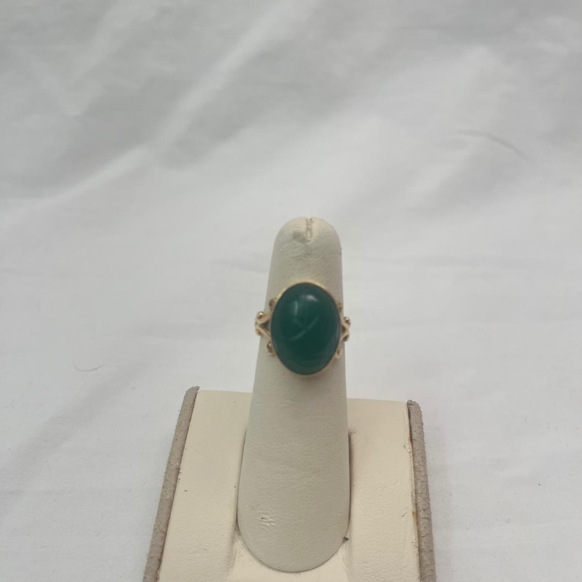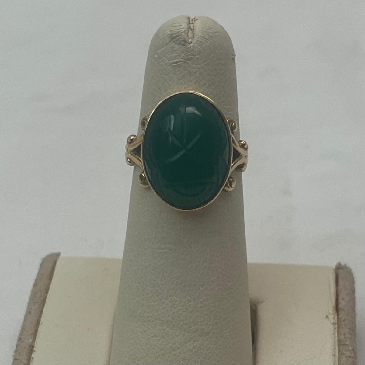 Lot includes a Gold ring marked 14k with a jade colored stone with carving. Ring is a size six.