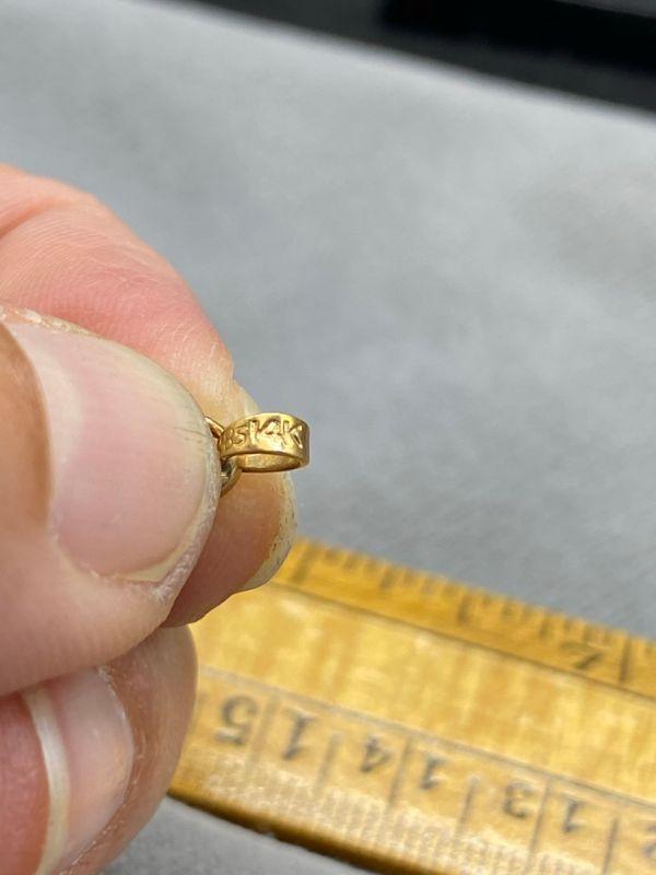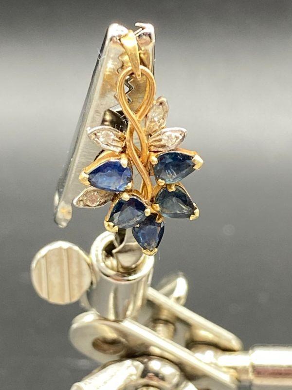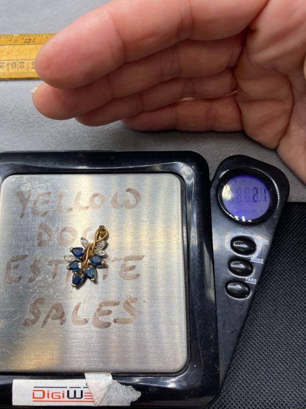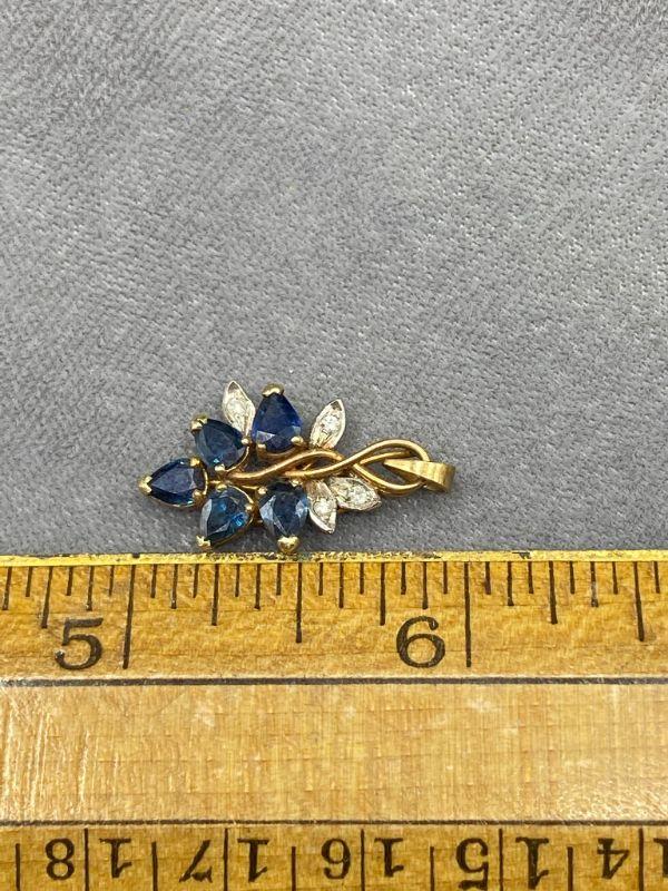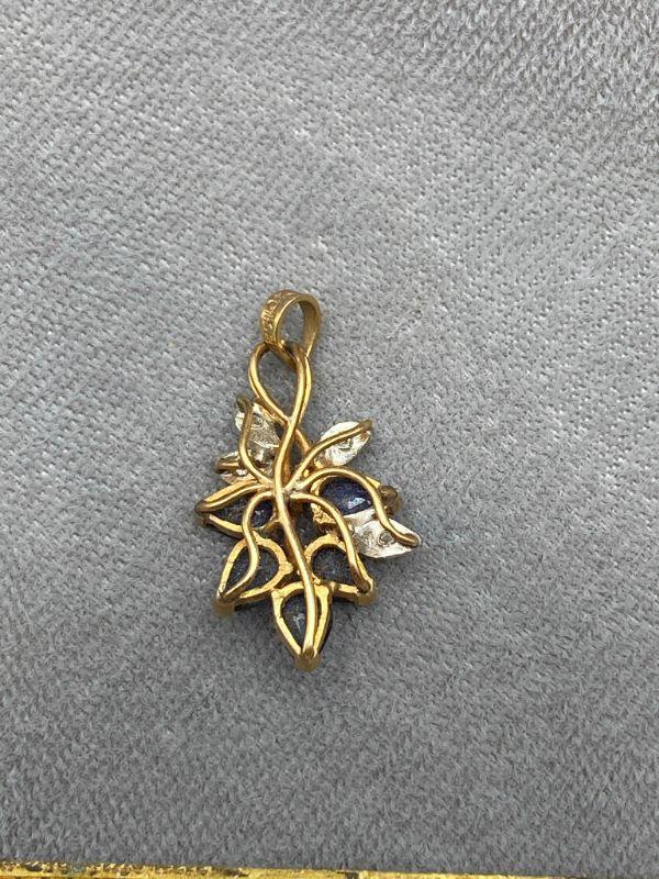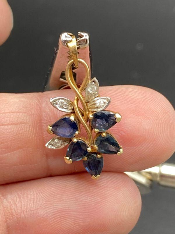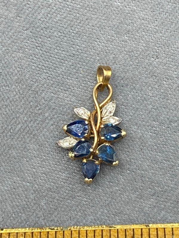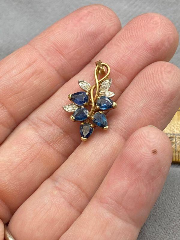14k Sapphire pendant. Yellow gold in a leaf cluster look. 5 sapphires and what look to be diamond chips possibly. Stamped 14k & 585 on the pendant loop. About 1" length. 2.1g t.w.