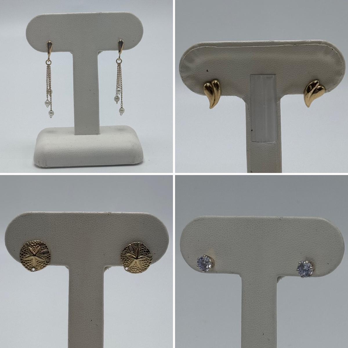 This lot includes eight pairs of 14K earrings. Most of them are marked with 14K and others were tested. Please see photos for all earrings and markings. All sales are final. No returns or refunds. Please bid accordingly. Shipping available. All sales are final. No returns or refunds. Please bid accordingly.