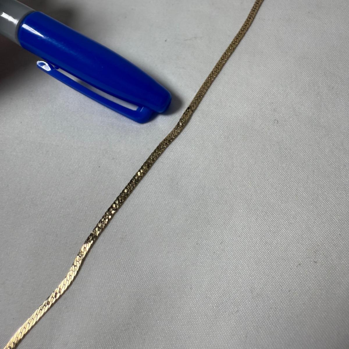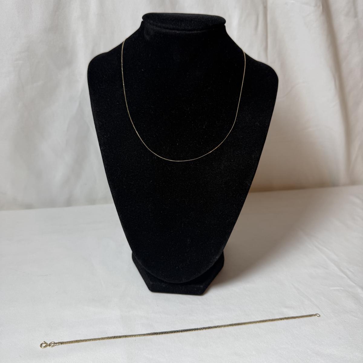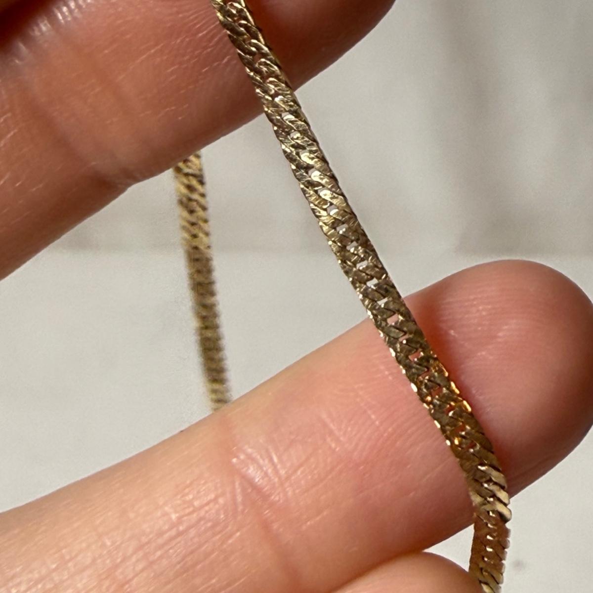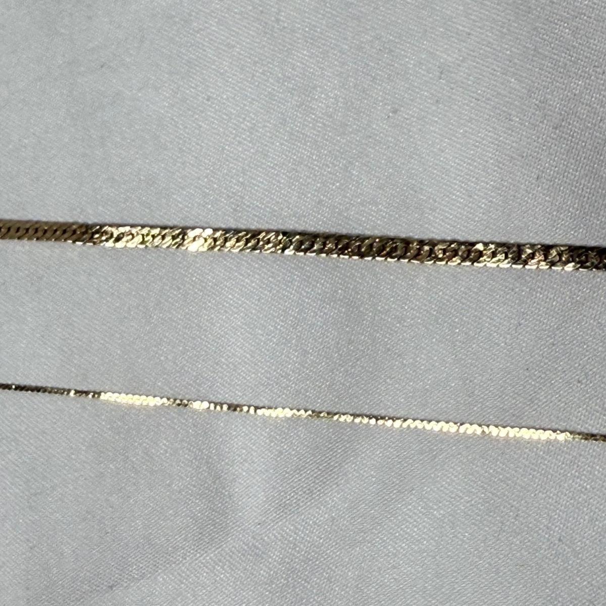 Sweet brand necklace chain is marked as ‘14K Plumb’. It is very delicate and is 16“. Curb style chain bracelet is marked ‘Baroness 14K’. It is just under 8.5”. The bracelet has a small part where it is not totally flush with the rest, see photo.