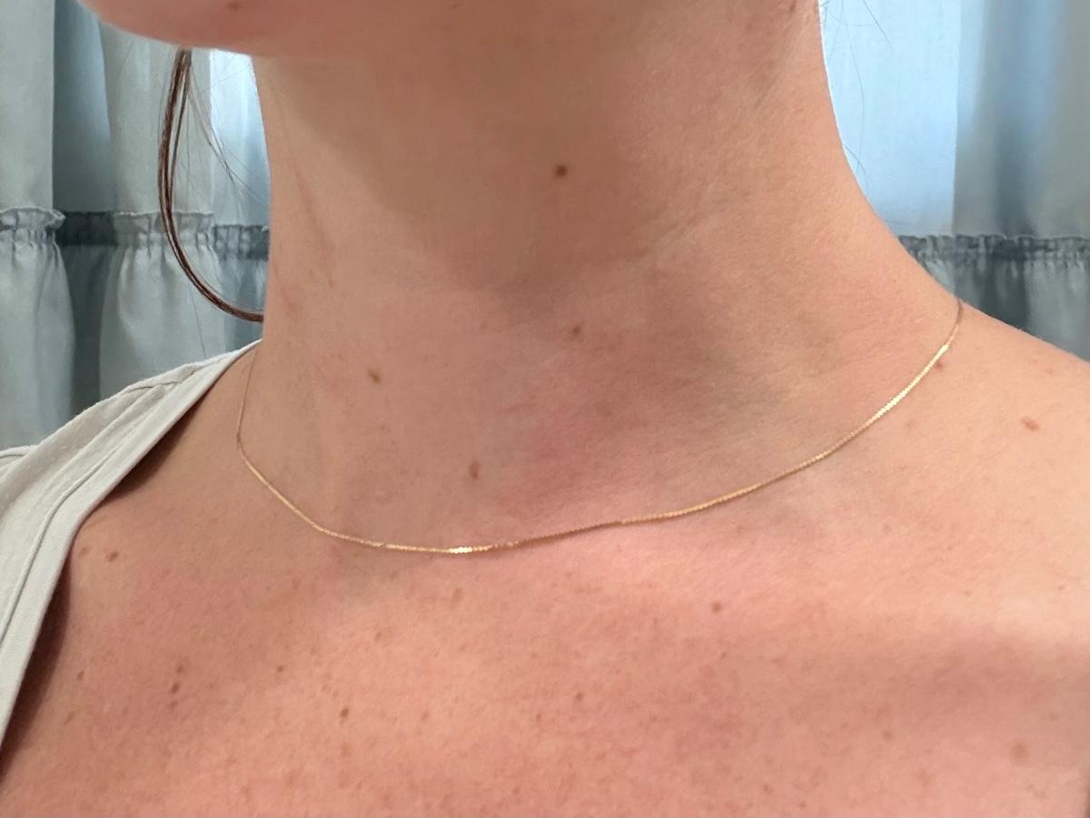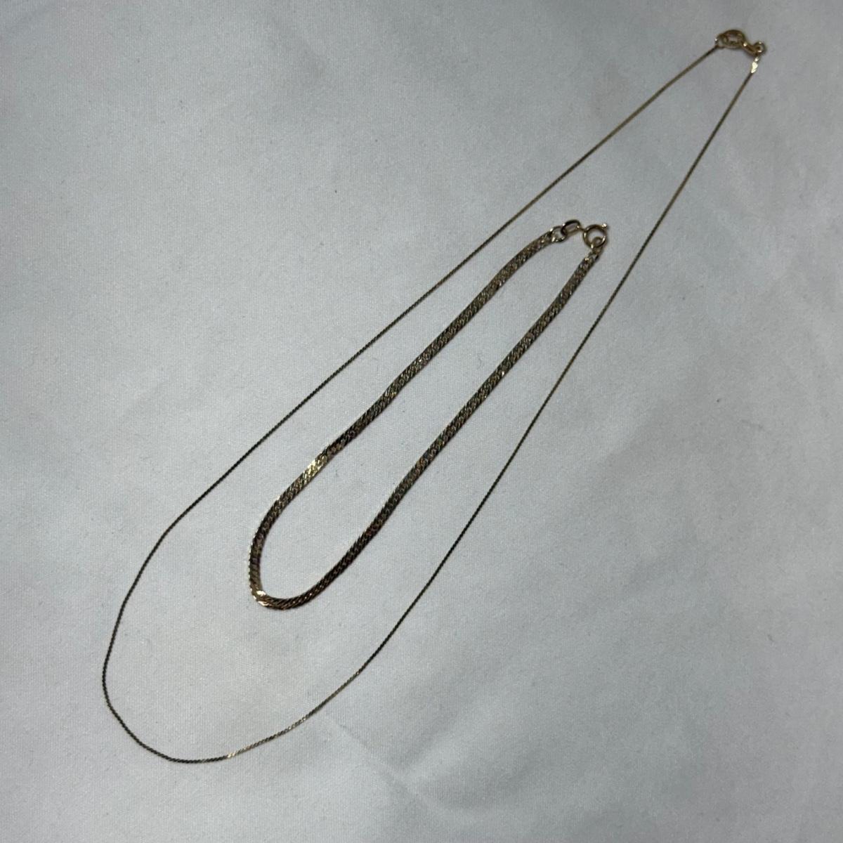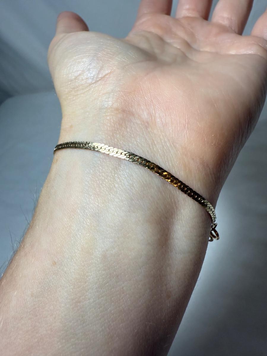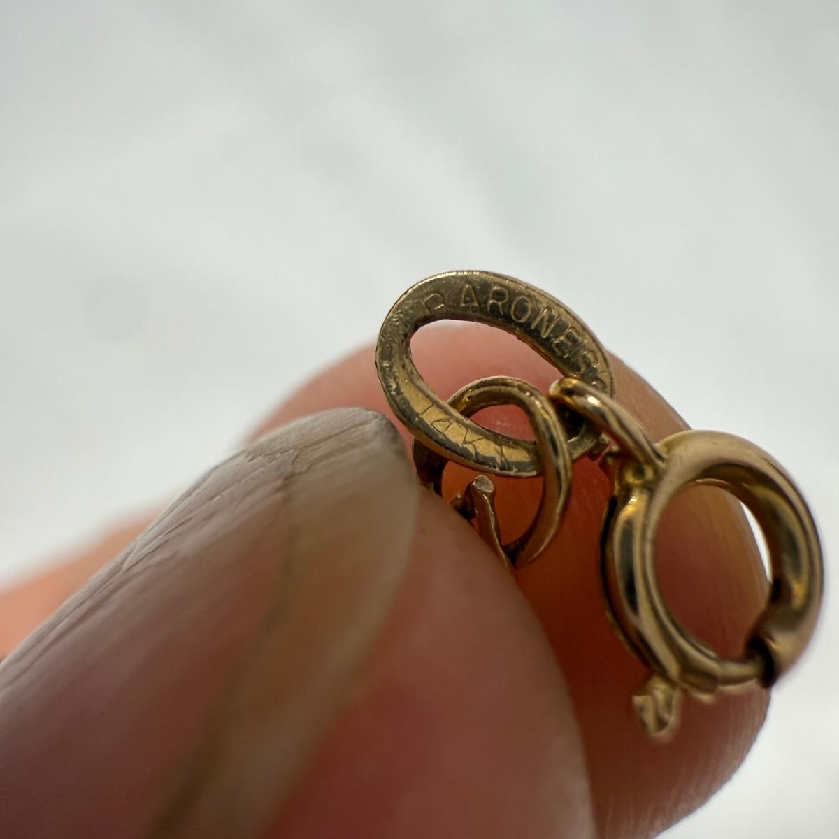 Sweet brand necklace chain is marked as ‘14K Plumb’. It is very delicate and is 16“. Curb style chain bracelet is marked ‘Baroness 14K’. It is just under 8.5”. The bracelet has a small part where it is not totally flush with the rest, see photo.
