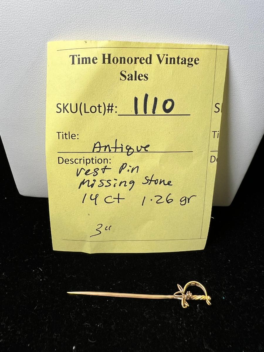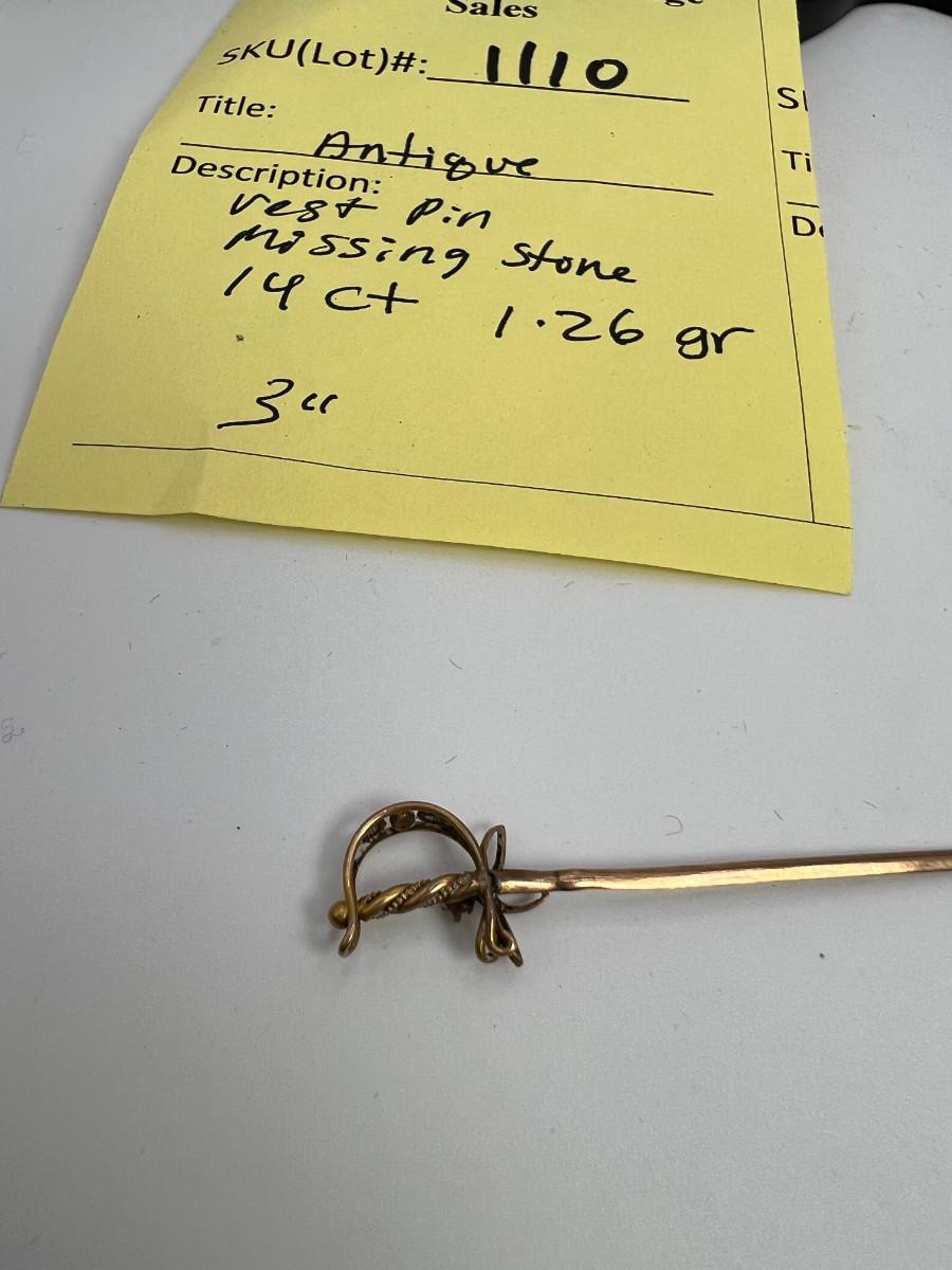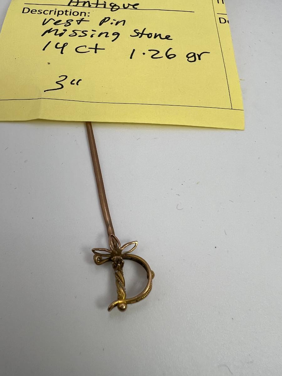 Antique 1800s vest Pin 14K, 1.26 Gram Missing stone