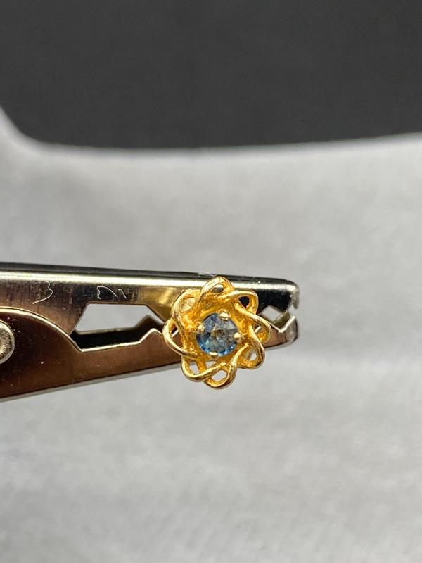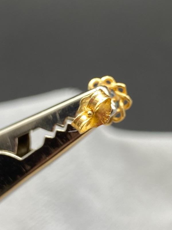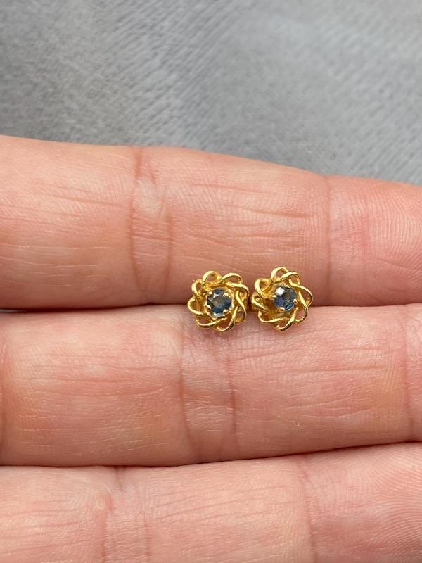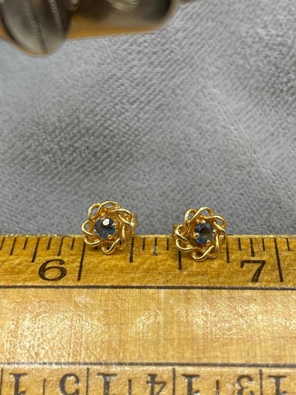 14k yellow gold and sapphire earrings. Gold is twisted around the stone. Small, 1/4" wide. Could not find a mark on earrings but did on the back.