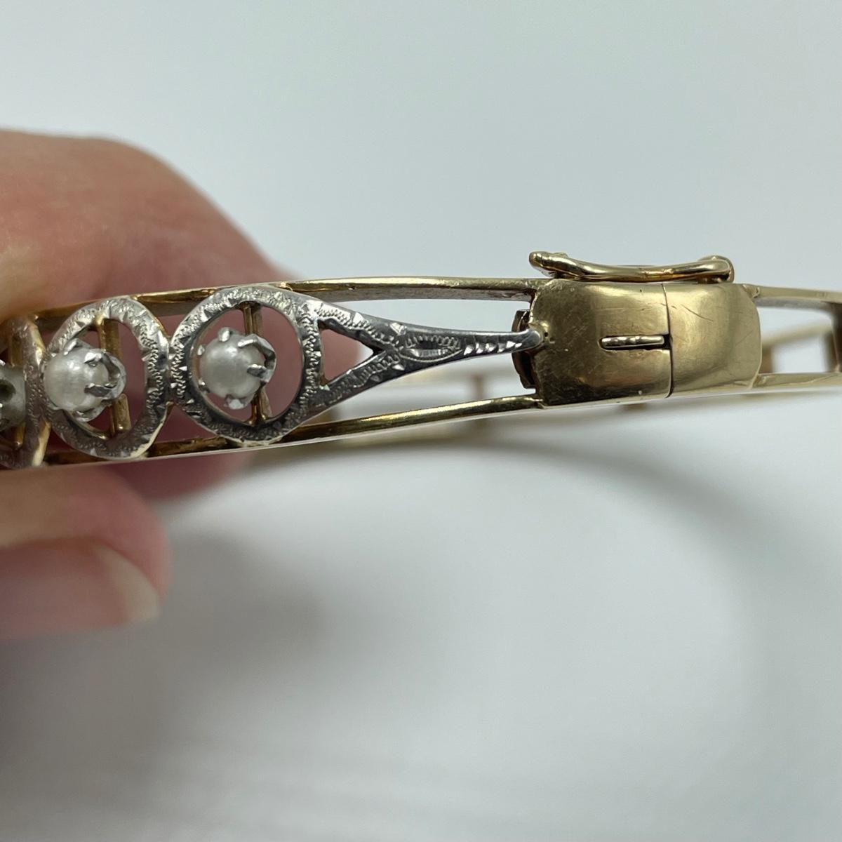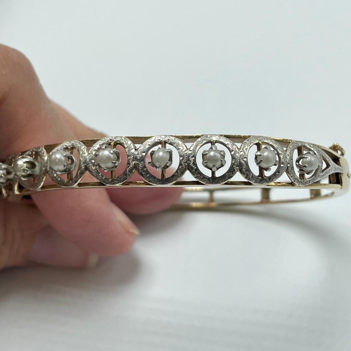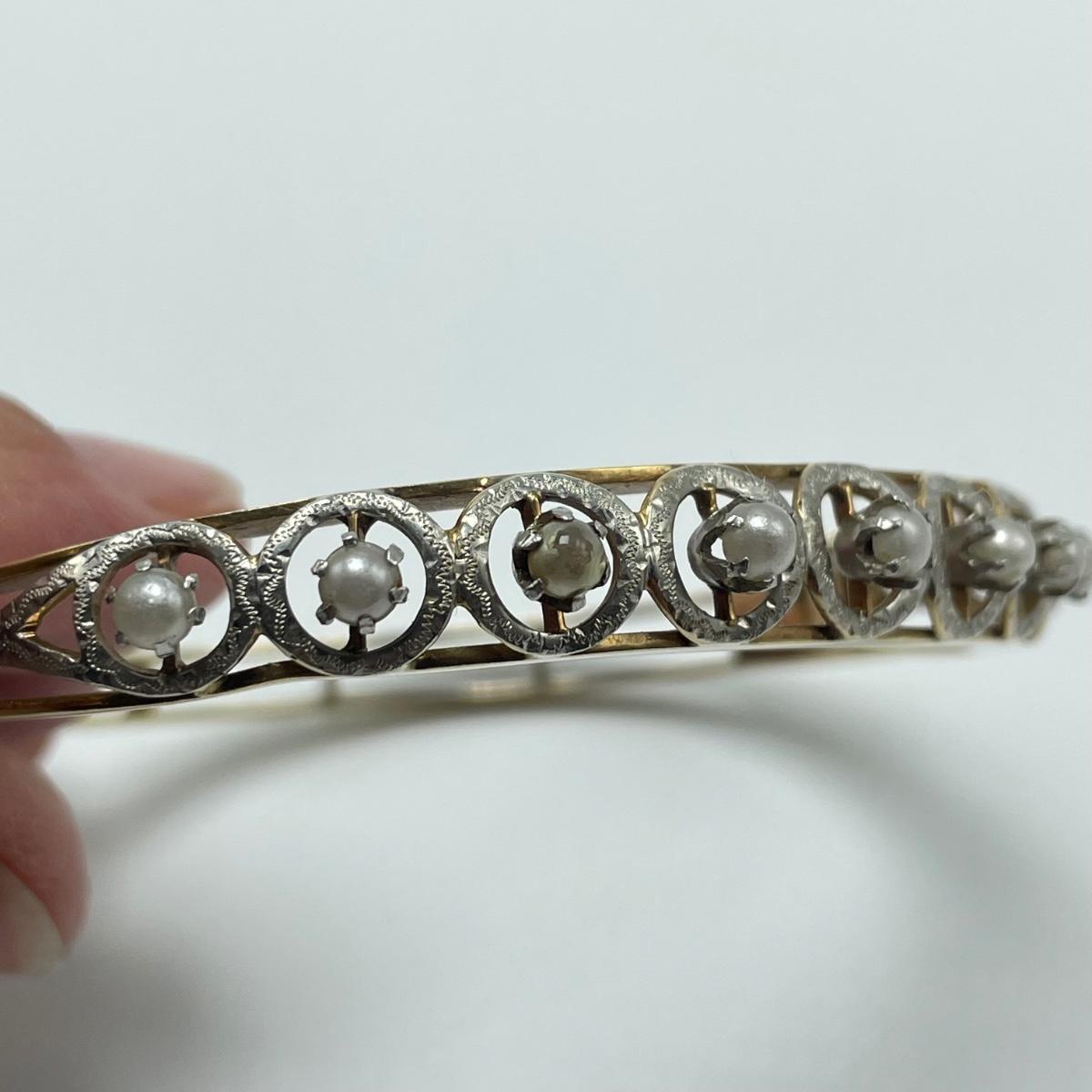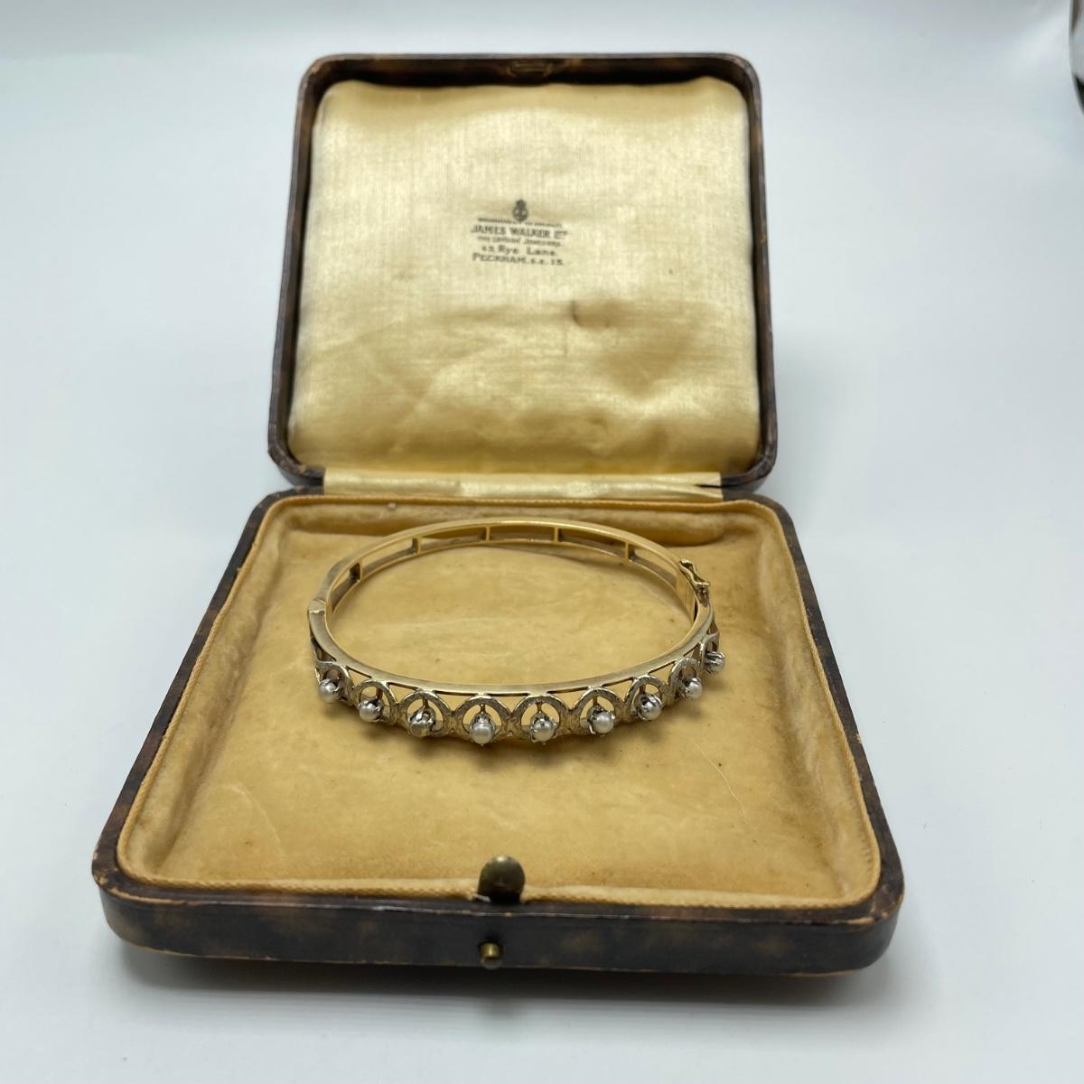Stunning bracelet with silver settings holding what appears to be seed pearls. One pearl shows some discoloration, see images. Clasp is stamped 14K. James Walker Ltd leather box included. Starting bid is at or near melt value. All sales are final. No returns or refunds. Please bid accordingly.