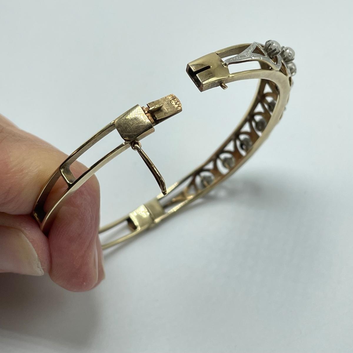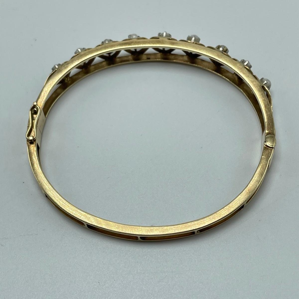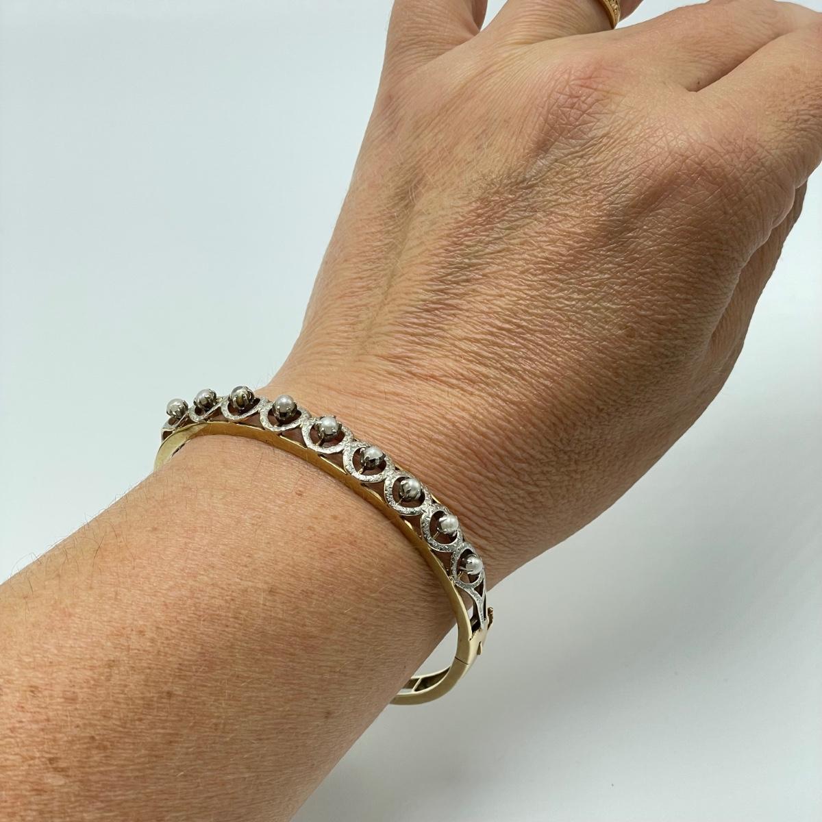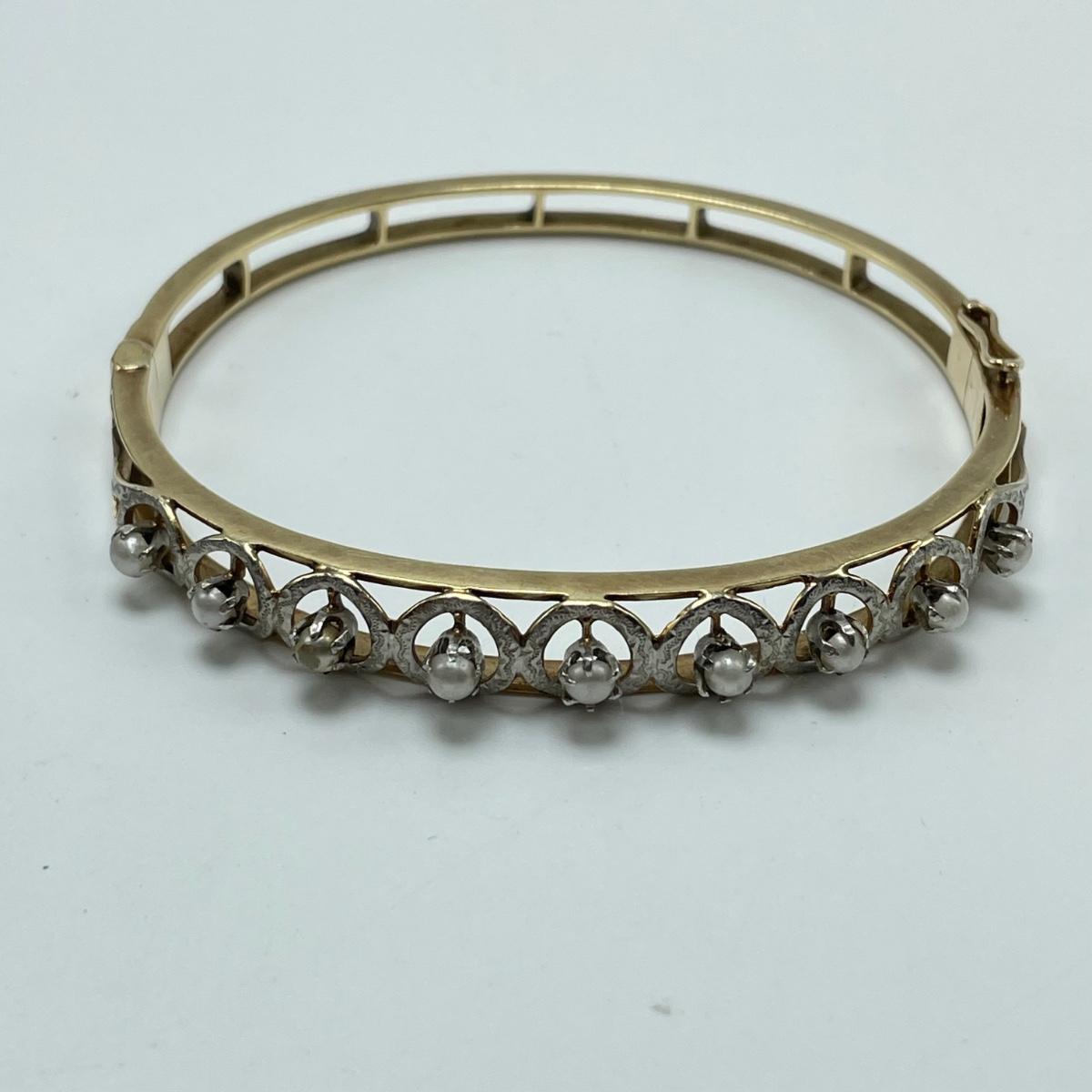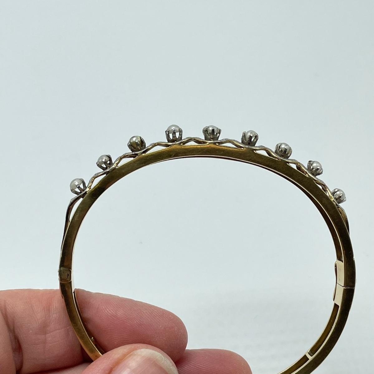Stunning bracelet with silver settings holding what appears to be seed pearls. One pearl shows some discoloration, see images. Clasp is stamped 14K. James Walker Ltd leather box included. Starting bid is at or near melt value. All sales are final. No returns or refunds. Please bid accordingly.