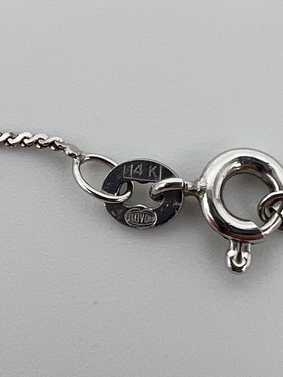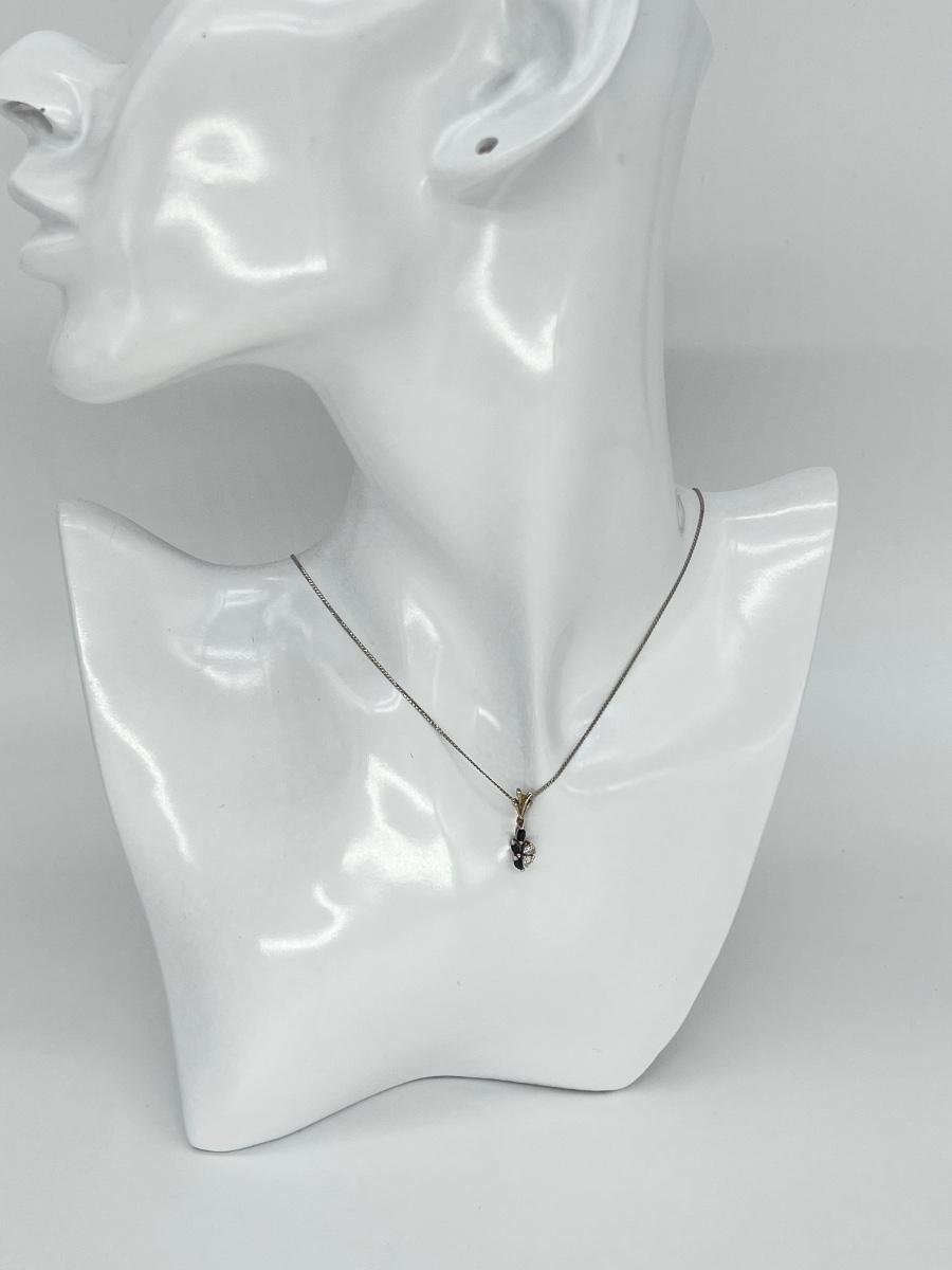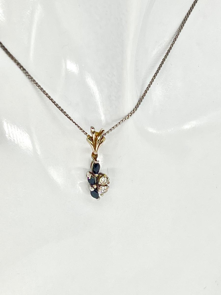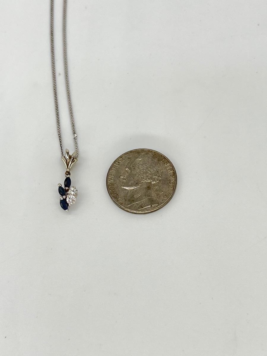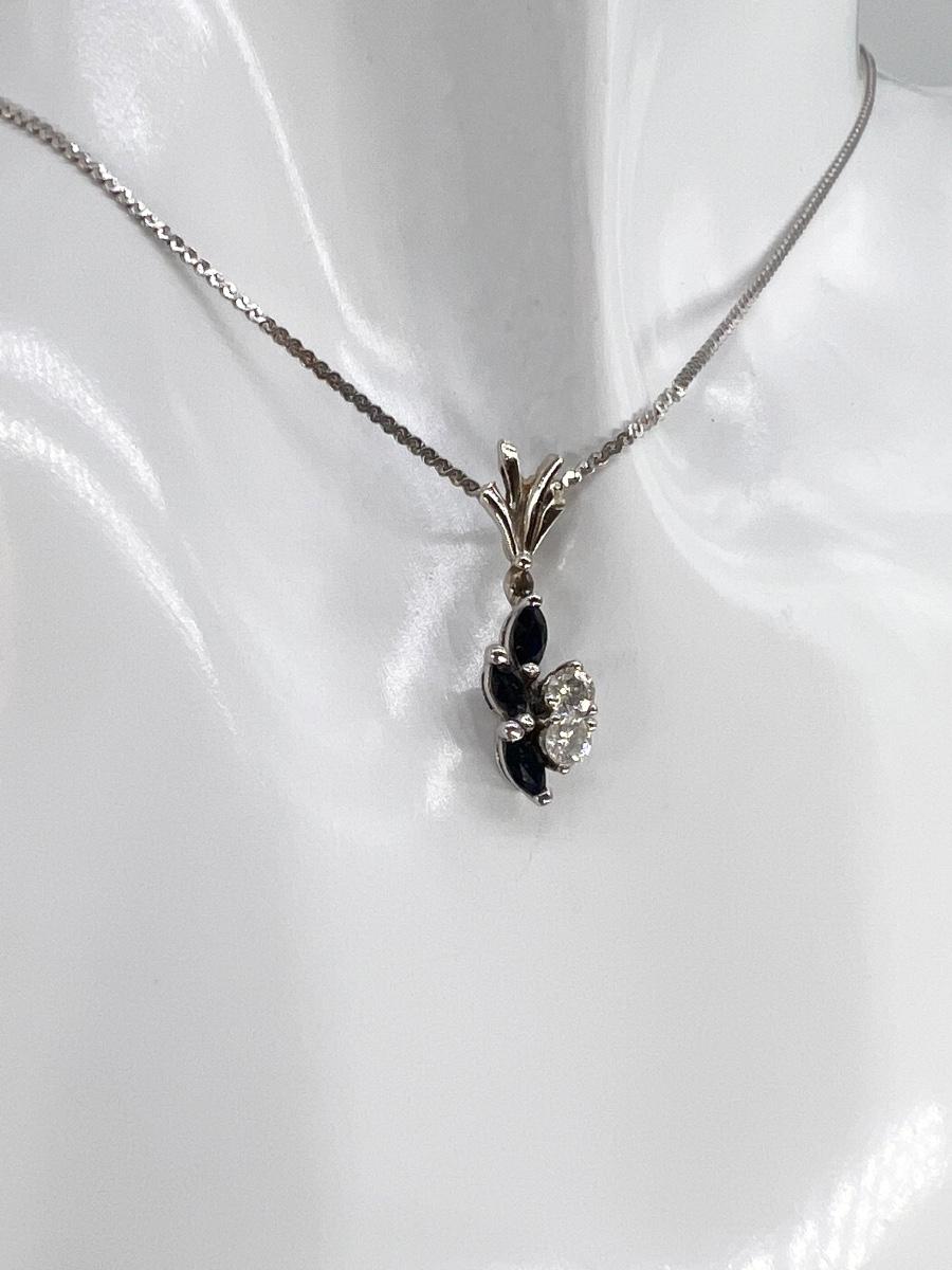 14K WG ~ Dark sapphire marquis diamond pendant & chain ~ 18" chain ~ 2 grams total weight ~ Has 3 dark sapphire marquis ~ 2 diamonds