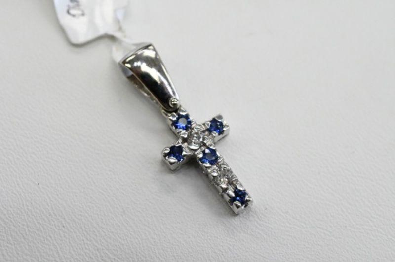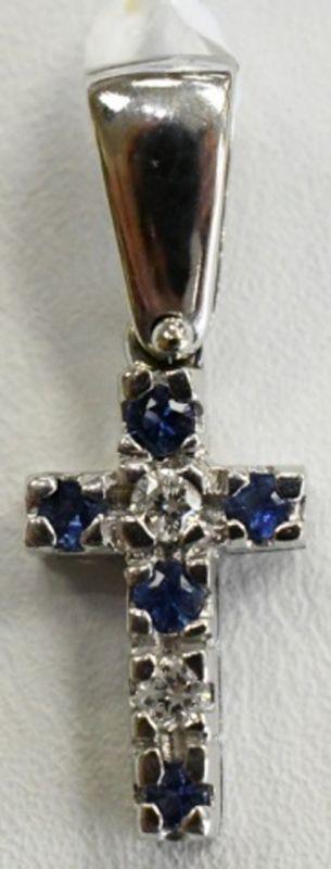 14K White Gold Natural Diamond Sapphire Cross Pendant