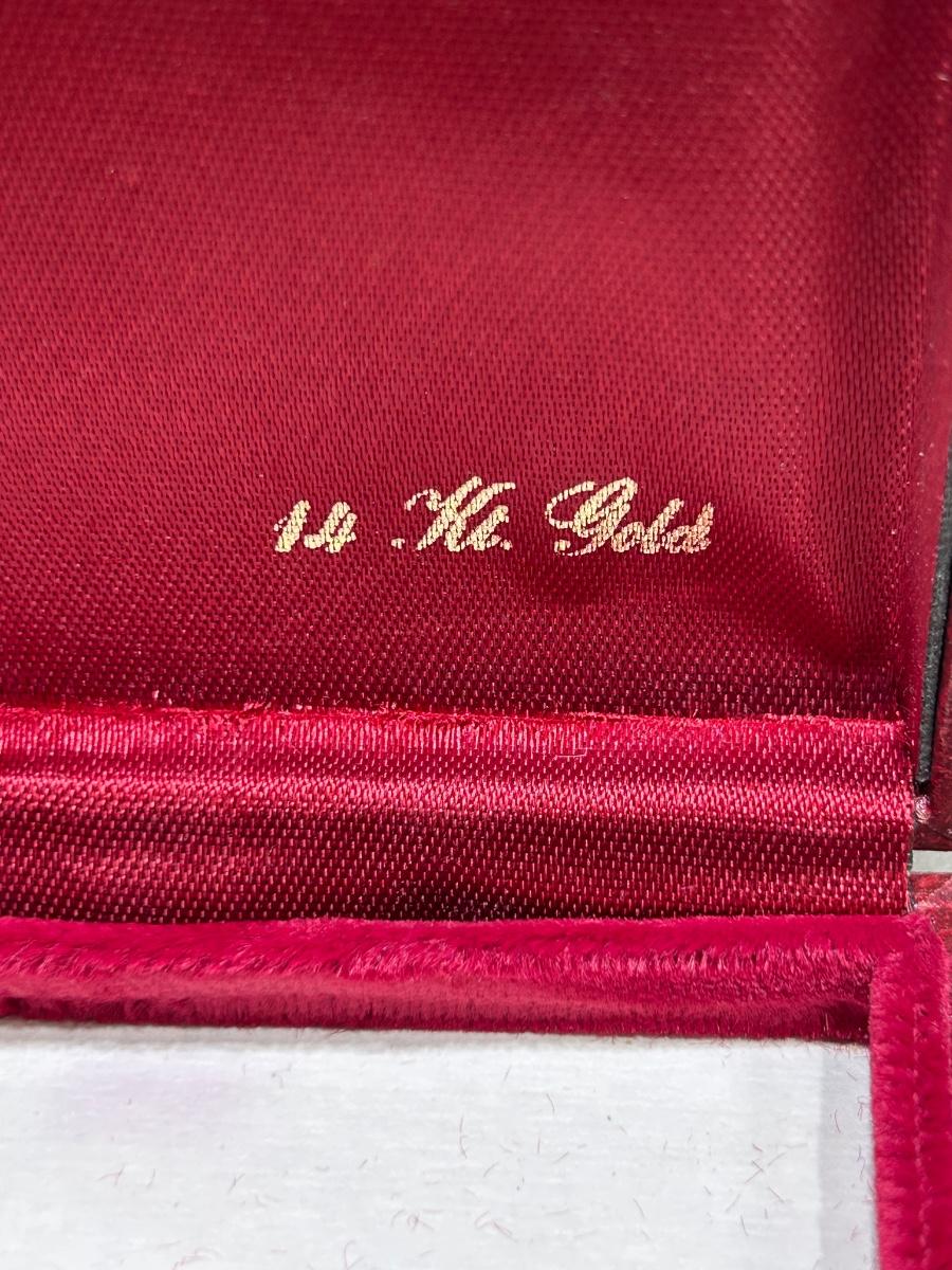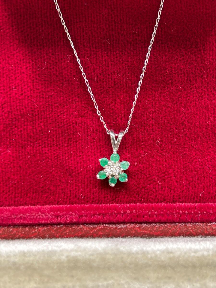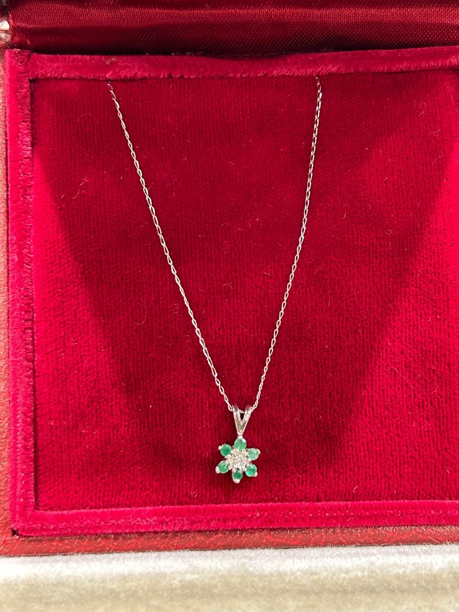 It has 1 diamond & emeralds surrounding. The chain is 22” long. Super cute!