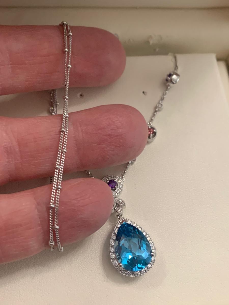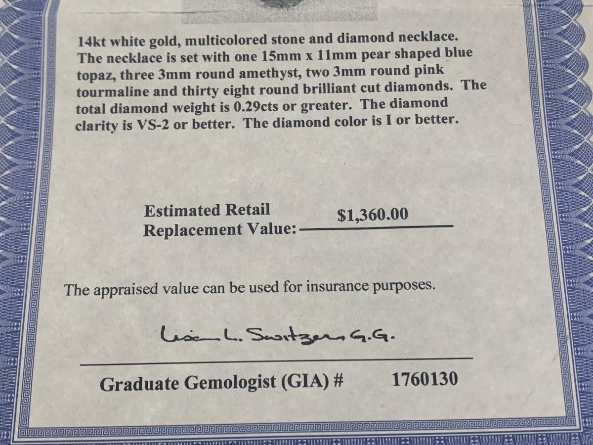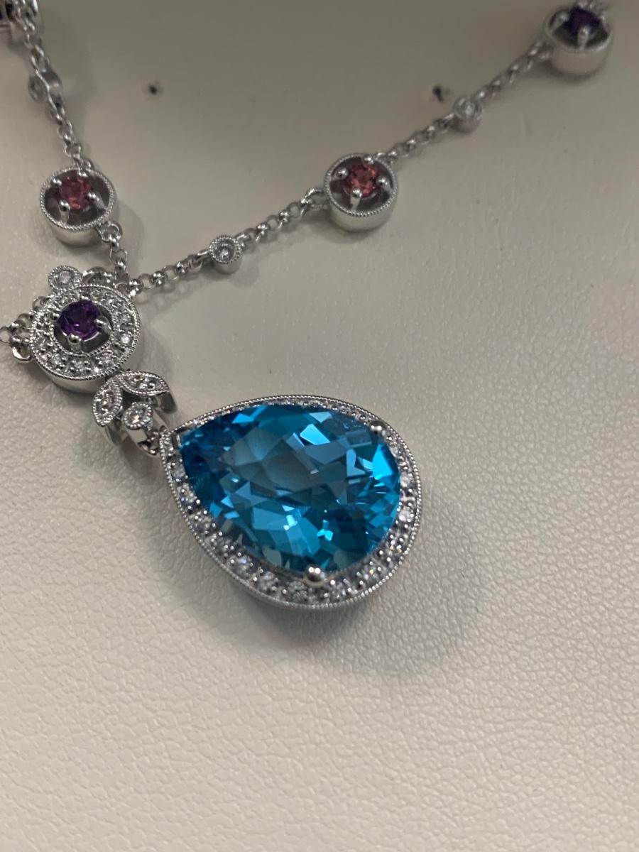 14k White Gold / Pearl Shape Blue Sapphire Necklace w/ Color Stones & Diamond