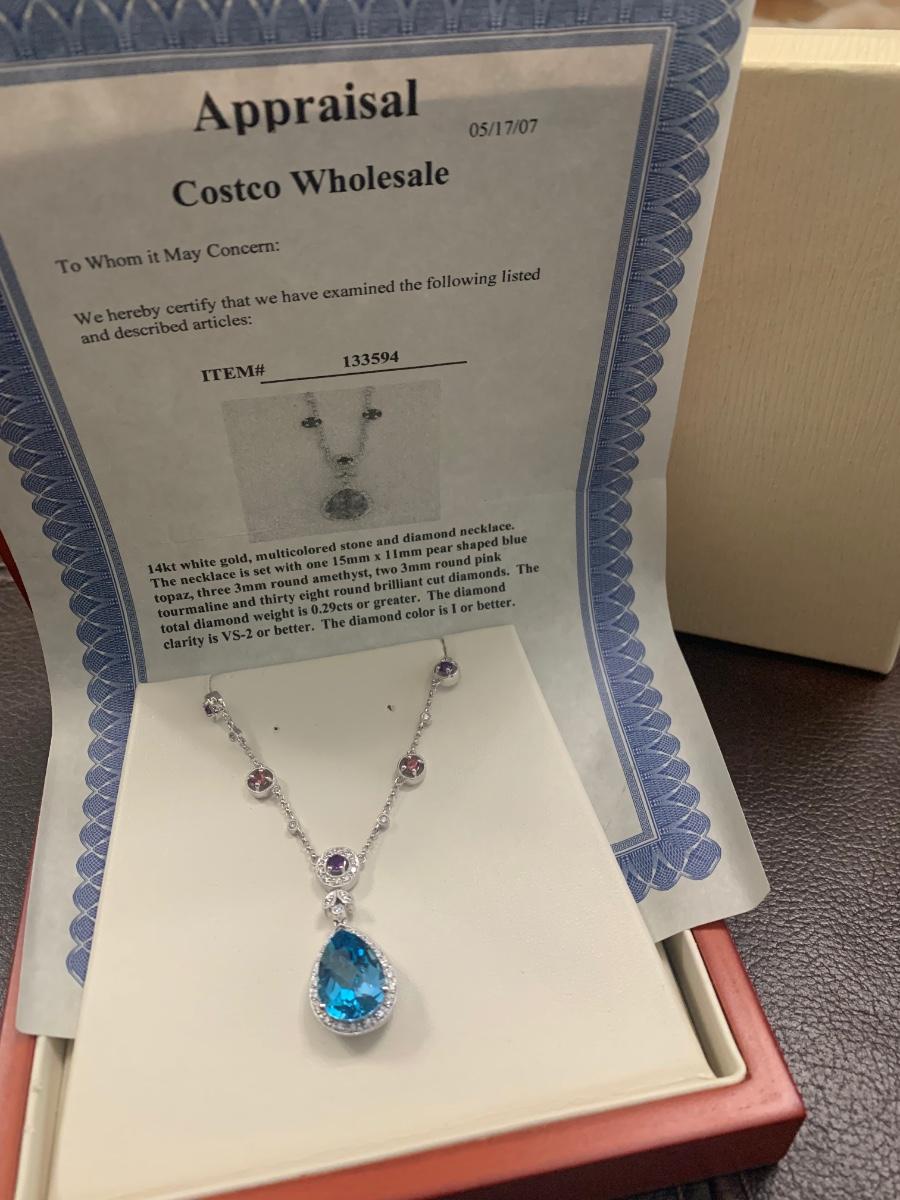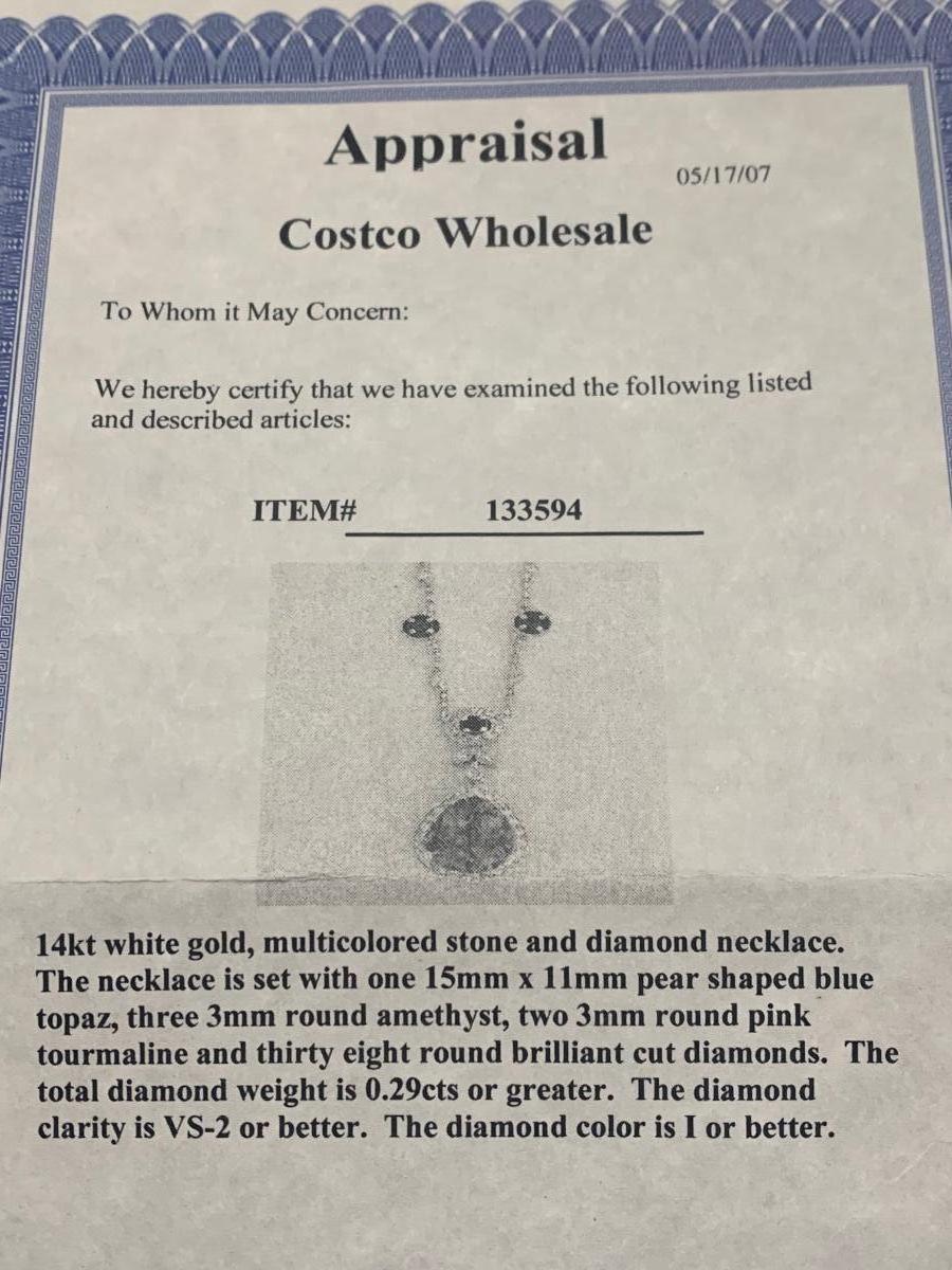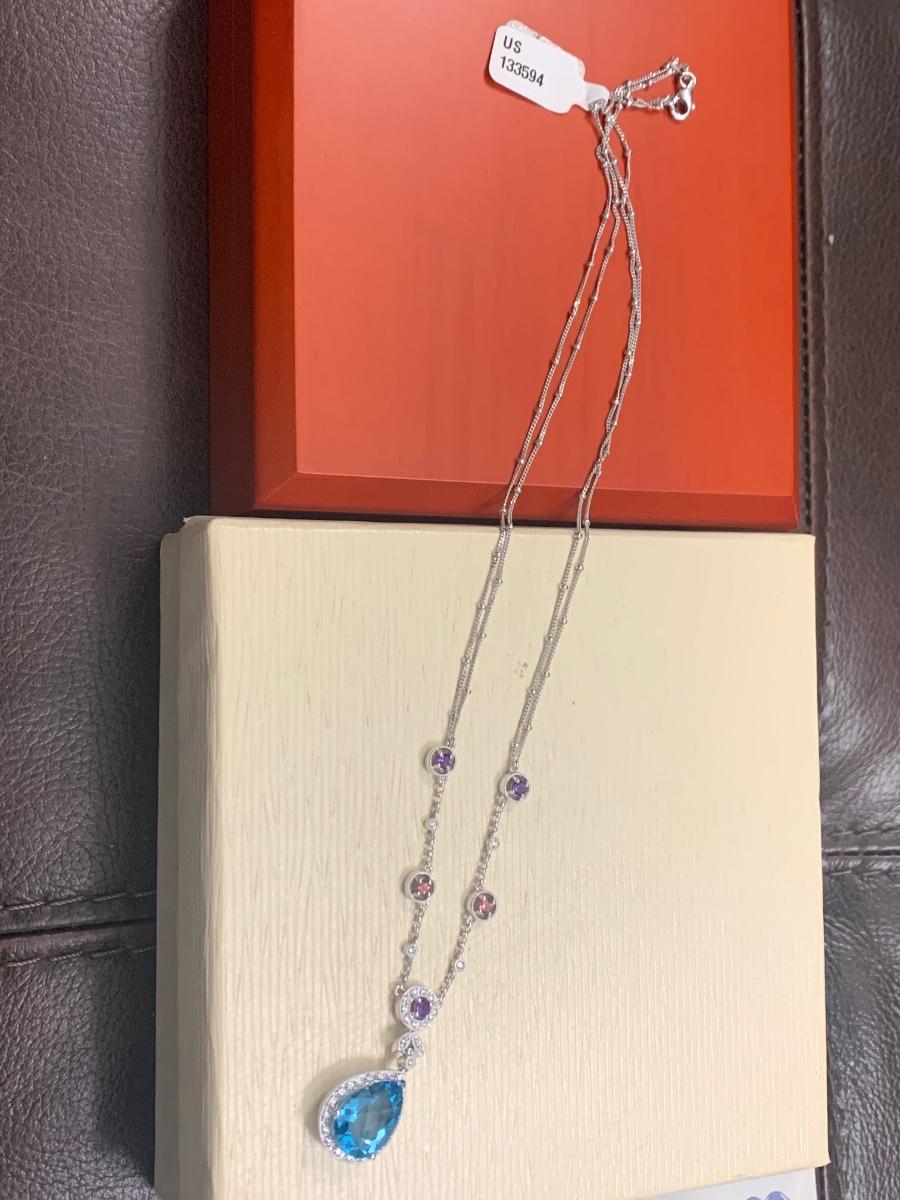 14k White Gold / Pearl Shape Blue Sapphire Necklace w/ Color Stones & Diamond
